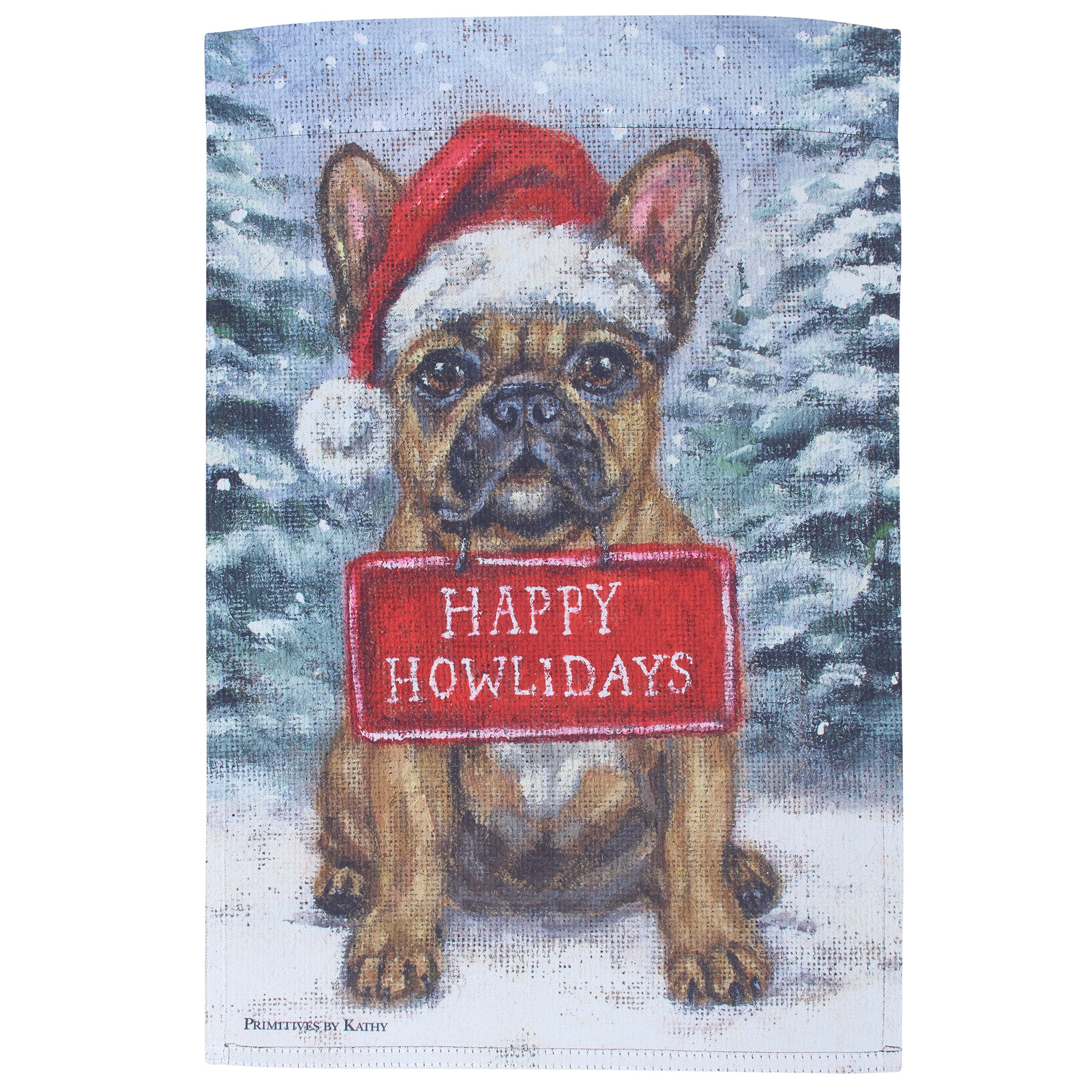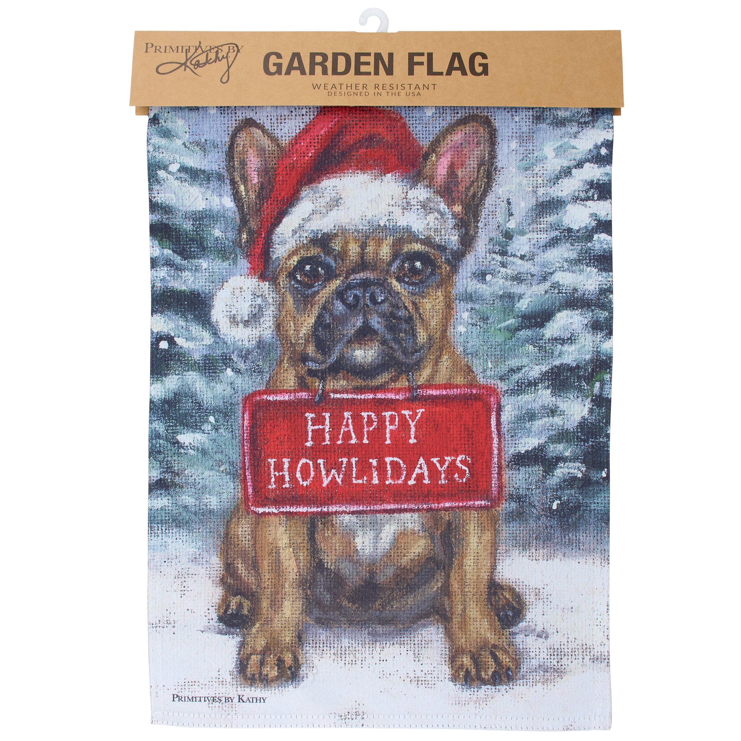 A polyester garden flag from our Holiday Pet Collection/ featuring a double-sided design displaying a charming winter scene of a Frenchie dog wearing a Santa hat and holding a sign that reads "Happy Howlidays" for a fun combination of a love for Christmas and pets. Christmas Frenchie design is replicated from original artwork painted onto burlap canvas, giving the art a unique depth and texture. Seasonal garden flag is weather-resistant and features an opening to hang on our Garden Flag Pole. Hand-wash only. Our Frenchie Happy Howlidays garden flag is packaged with a header card and hook to easily hang on rack for store display. A fun dog themed home accent perfect for seasonal display in any yard or garden.