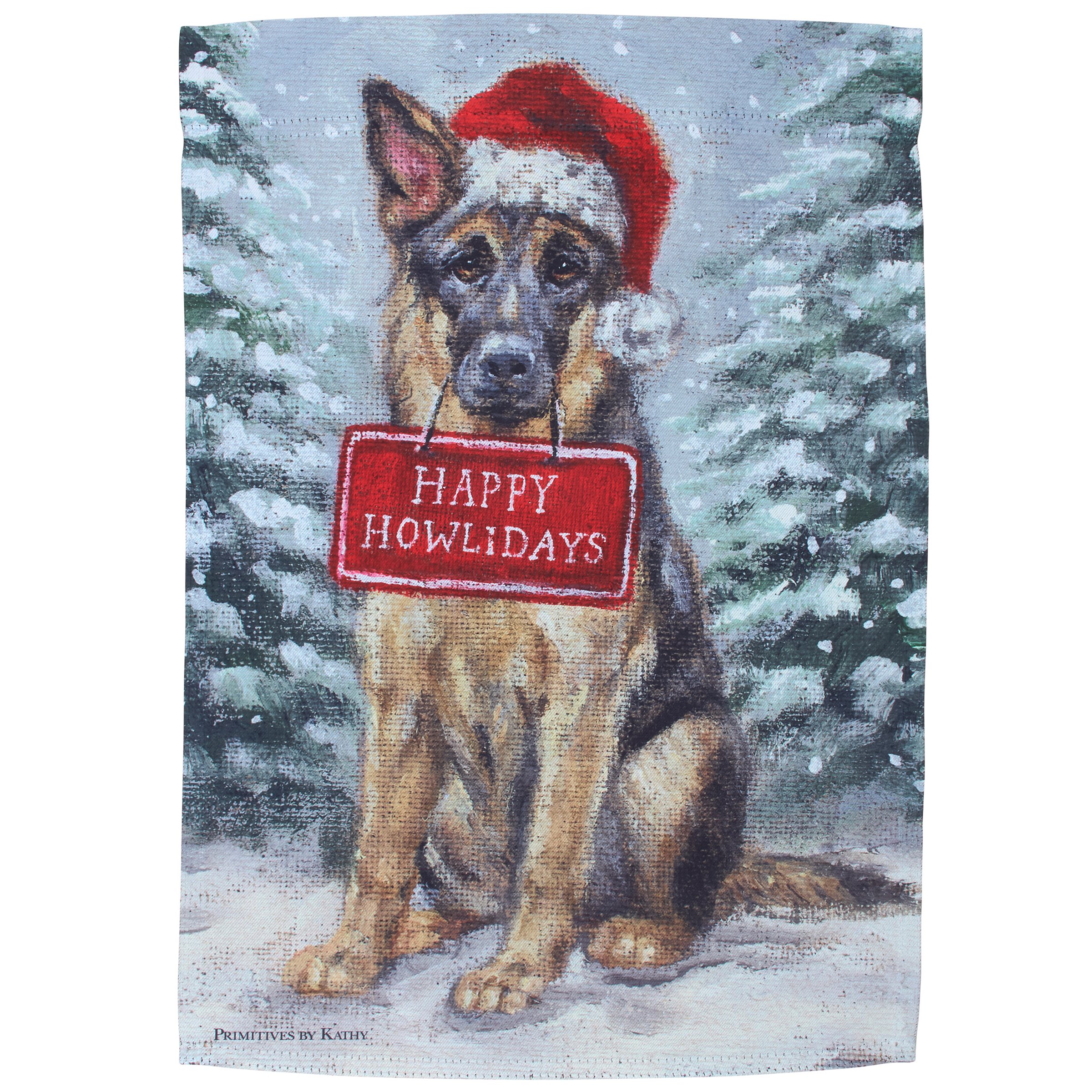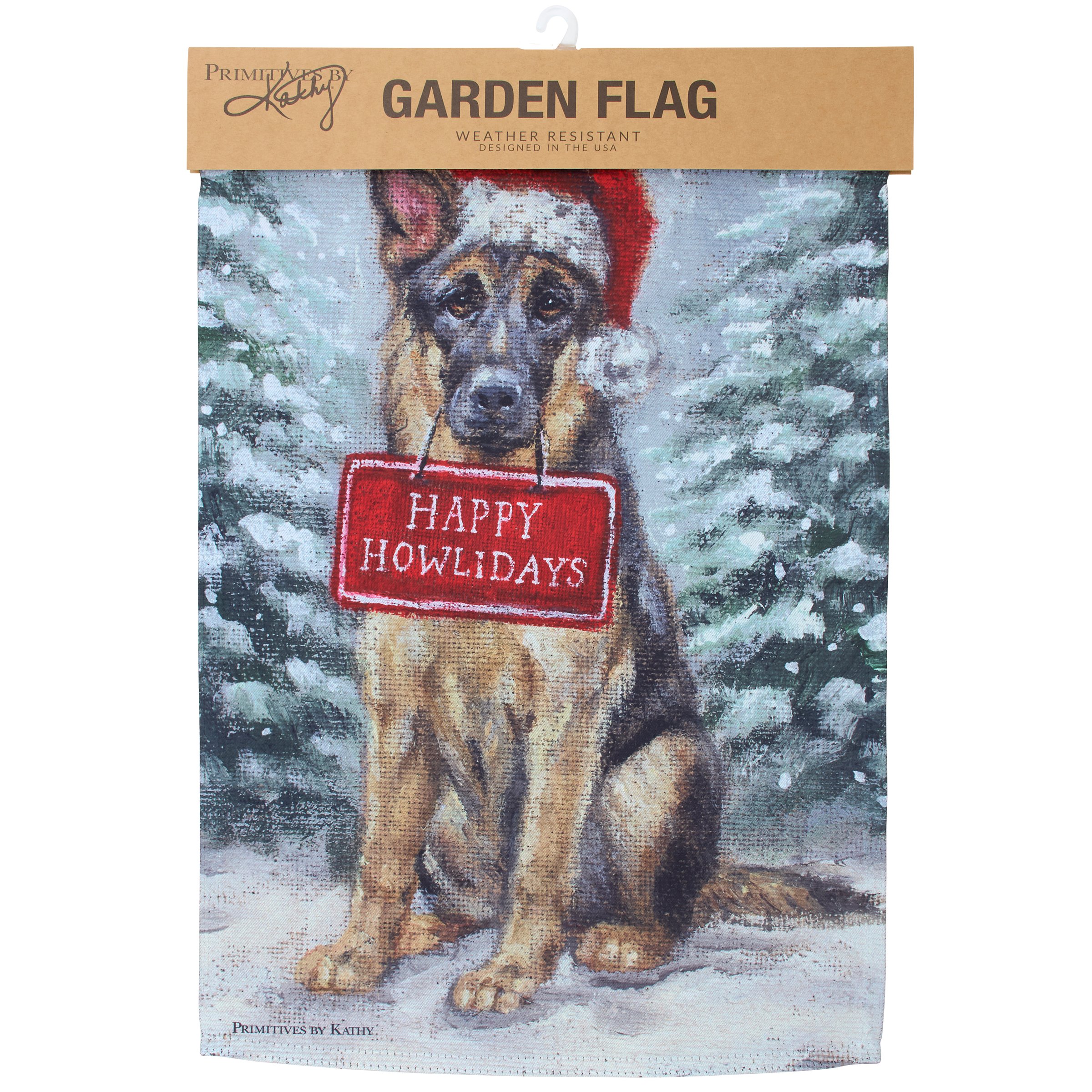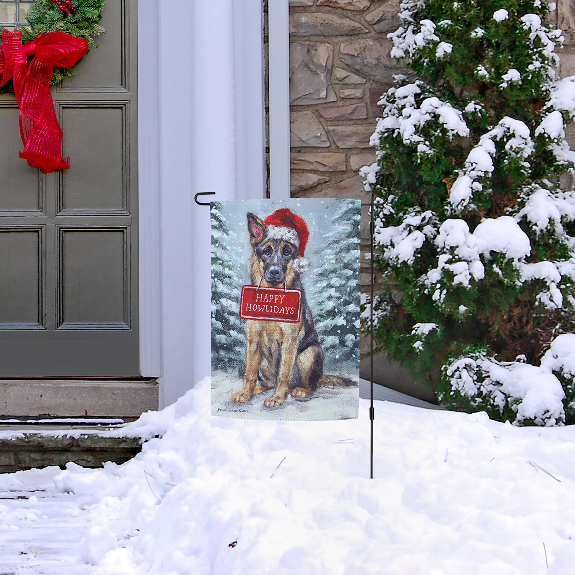 A polyester garden flag from our Holiday Pet Collection/ featuring a double-sided design displaying a charming winter scene of a German Shepherd dog wearing a Santa hat and holding a sign that reads "Happy Howlidays" for a fun combination of a love for Christmas and pets. Christmas German Shepherd design is replicated from original artwork painted onto burlap canvas, giving the art a unique depth and texture. Seasonal garden flag is weather-resistant and features an opening to hang on our Garden Flag Pole. Hand-wash only. Our German Shepherd Happy Howlidays garden flag is packaged with a header card and hook to easily hang on rack for store display. A fun dog themed home accent perfect for seasonal display in any yard or garden.