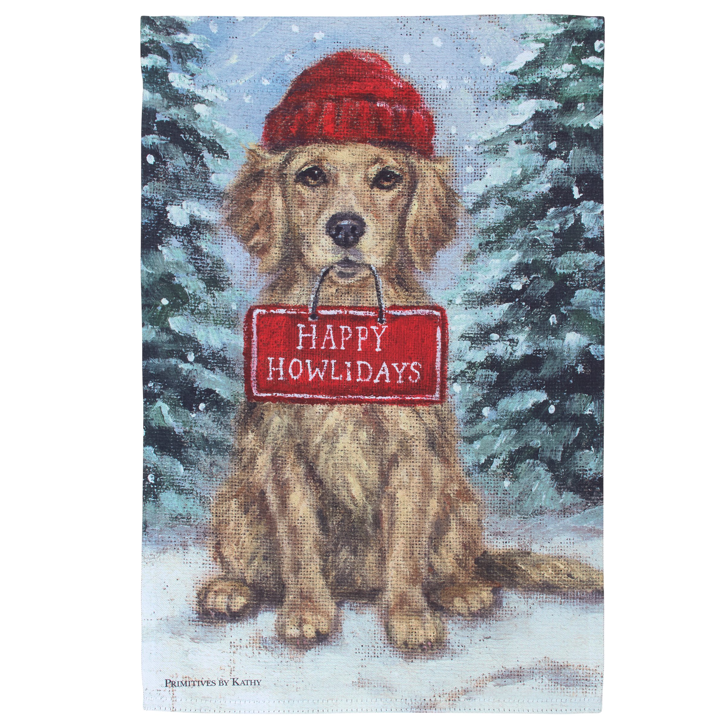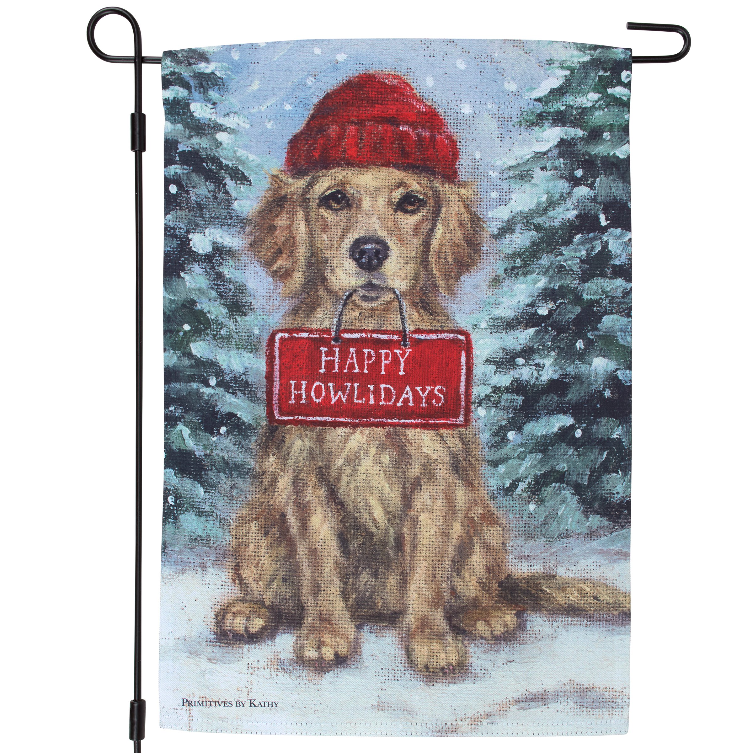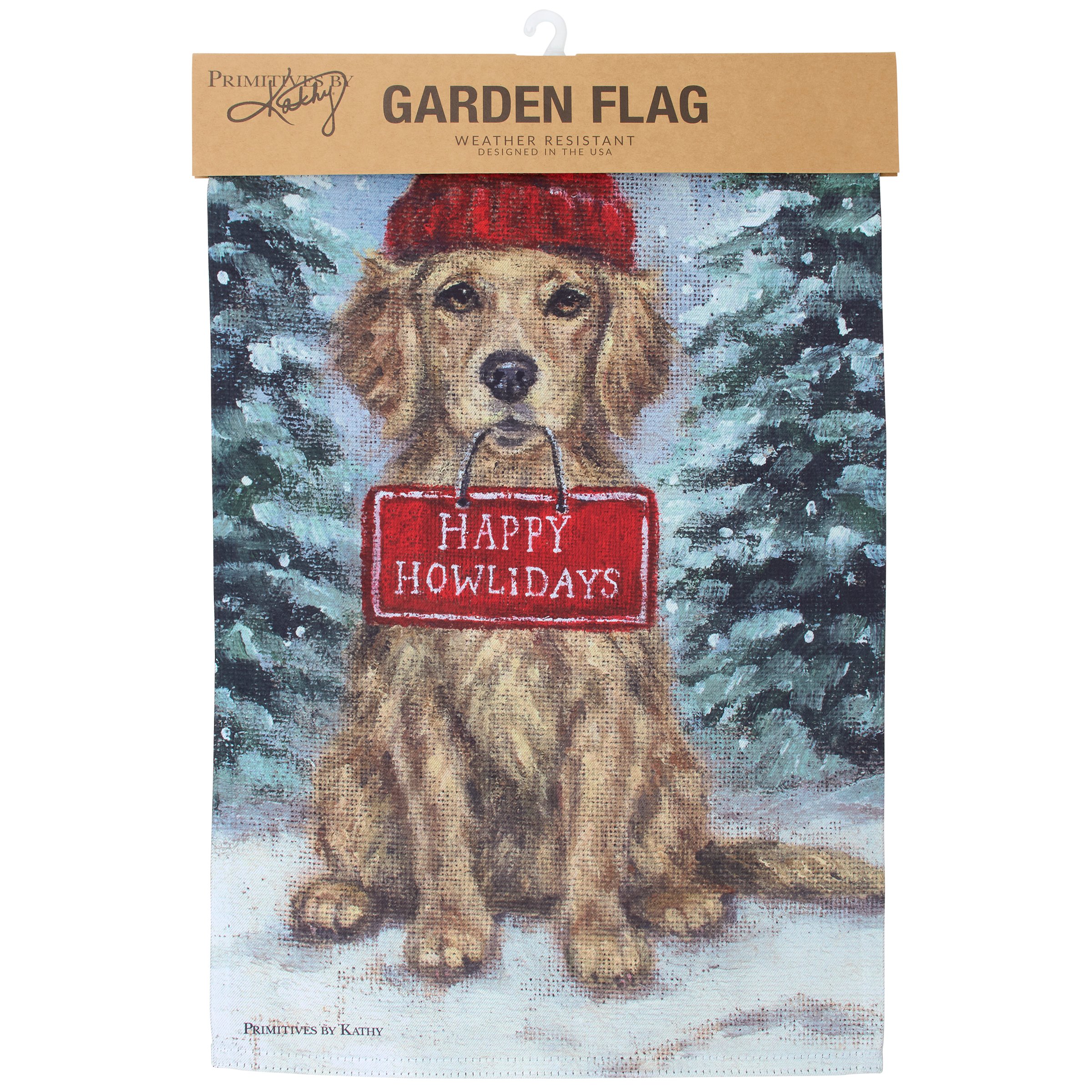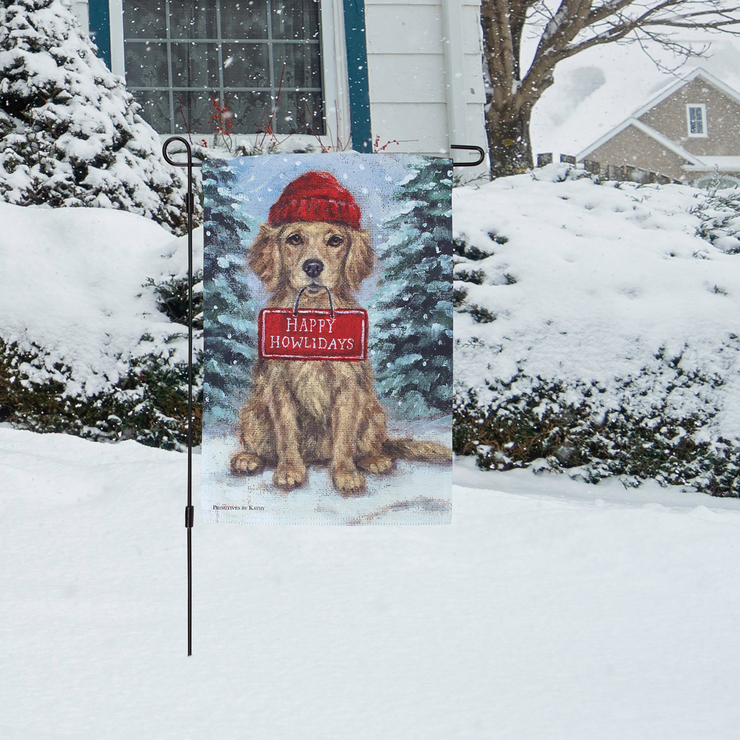 A polyester garden flag from our Holiday Pet Collection/ featuring a double-sided design displaying a charming winter scene of a Golden Retriever wearing a winter hat and holding a sign that reads "Happy Howlidays" for a fun combination of a love for Christmas and pets. Christmas Golden Retriever design is replicated from original artwork painted onto burlap canvas, giving the art a unique depth and texture. Seasonal garden flag is weather-resistant and features an opening to hang on our Garden Flag Pole. Hand-wash only. Our Golden Retriever Happy Howlidays garden flag is packaged with a header card and hook to easily hang on rack for store display. A fun dog themed home accent perfect for seasonal display in any yard or garden.
