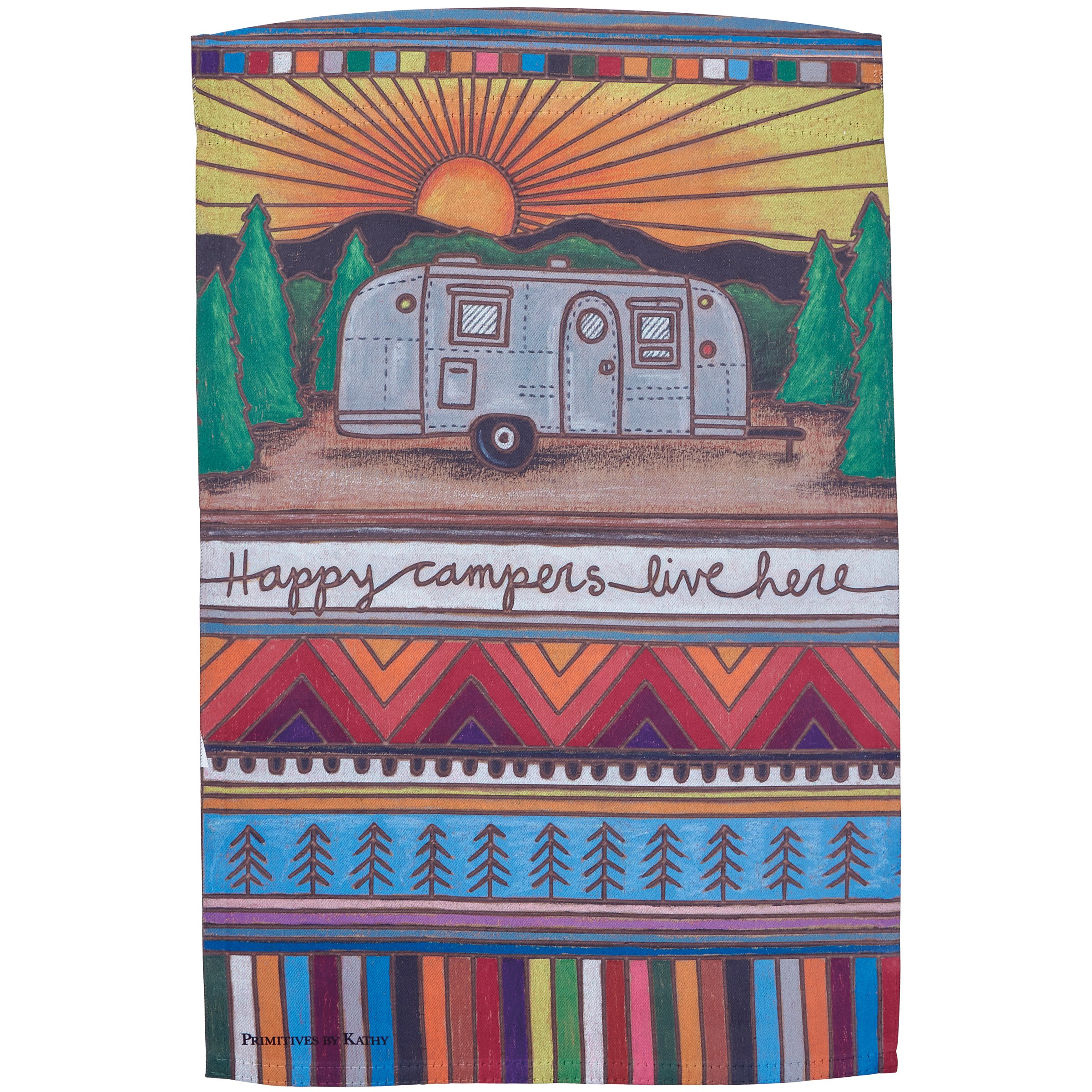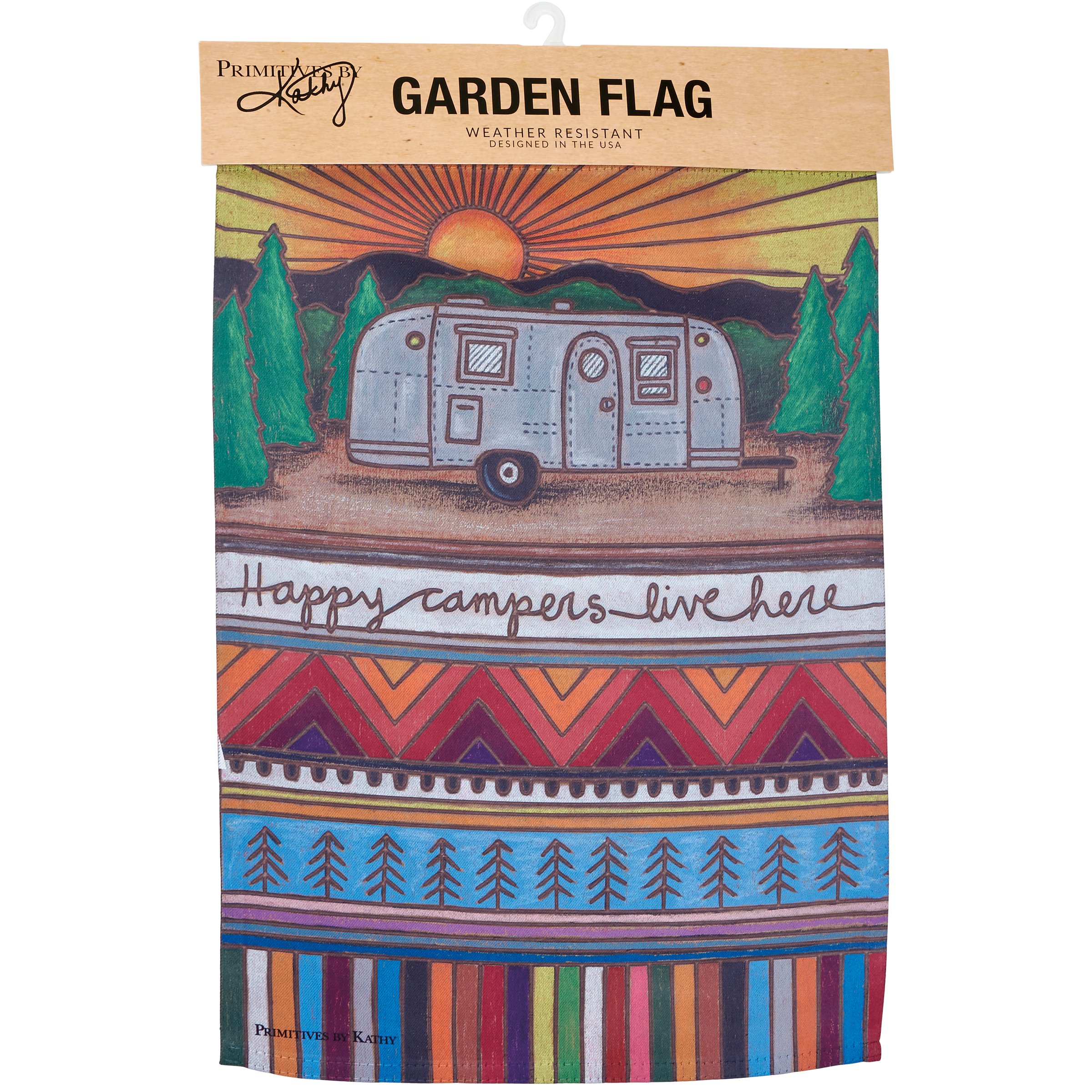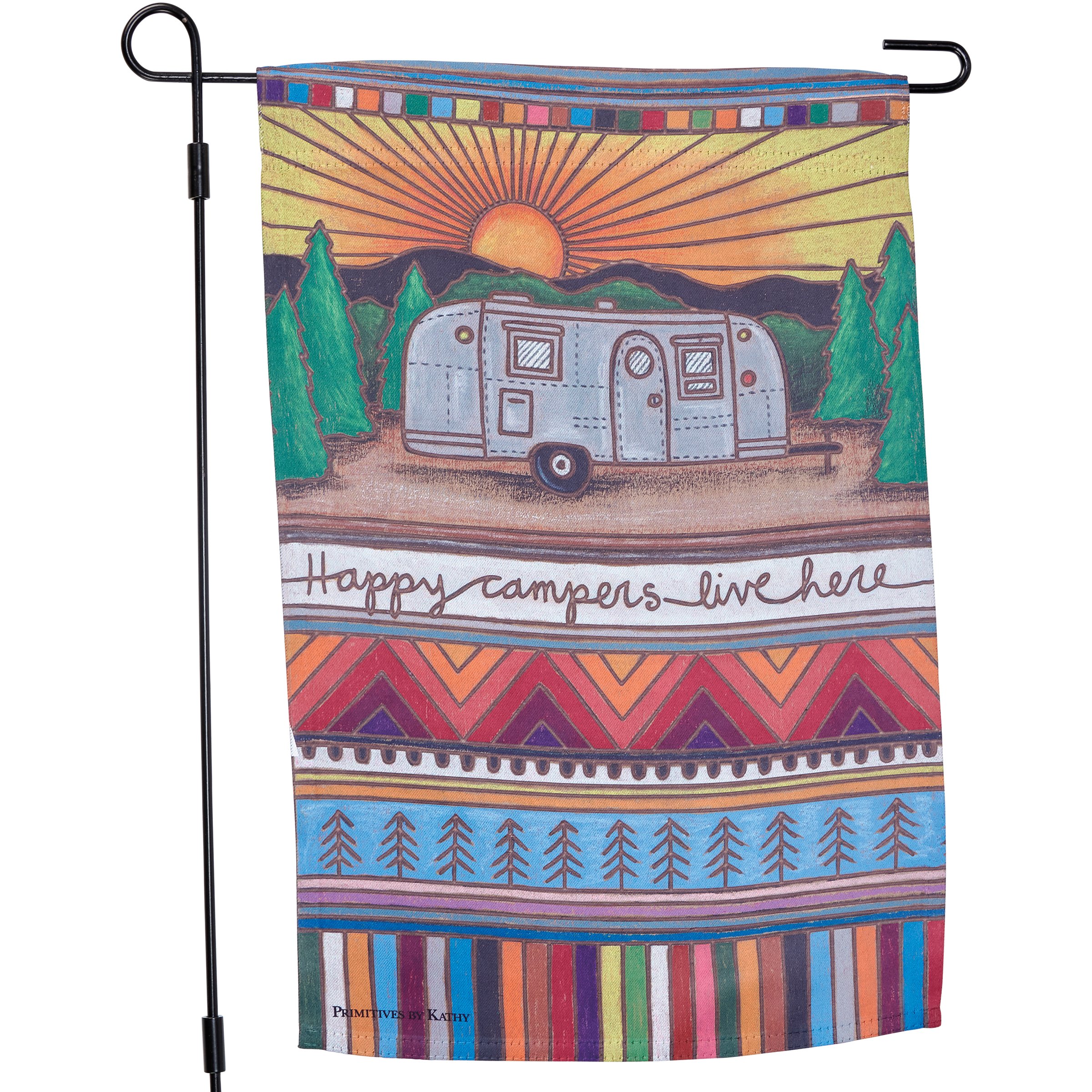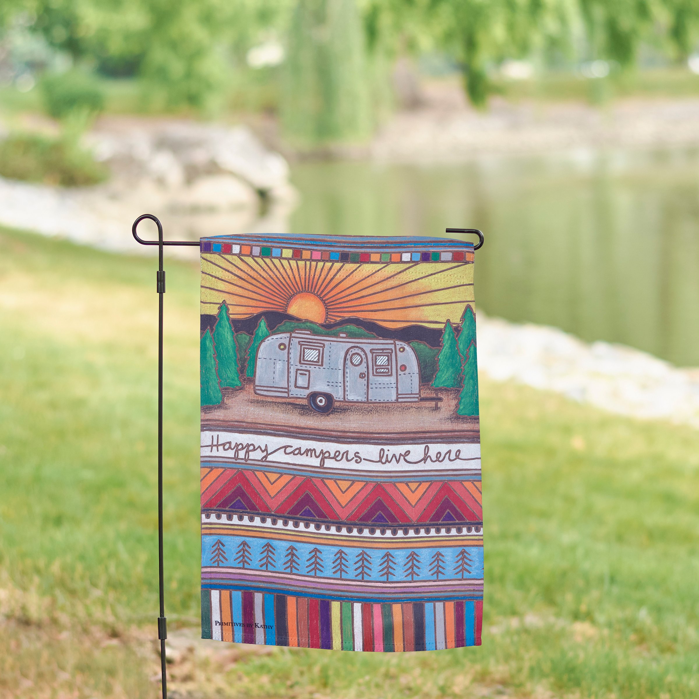 A double-sided polyester garden flag from our Lake & Cabin Collection displaying a colorful design of a camper with complementing geometric patterns and camping-themed sentiment that reads "Happy Campers Live Here." Design is replicated from original hand illustrated art with wood burned details. Garden flag is weather-resistant and features an opening to hang on our Garden Flag Pole. Our Happy Campers garden flag is packaged with a header card and hook to easily hang on rack. Hand wash only. A fun everyday home accent perfect for any yard or campsite.