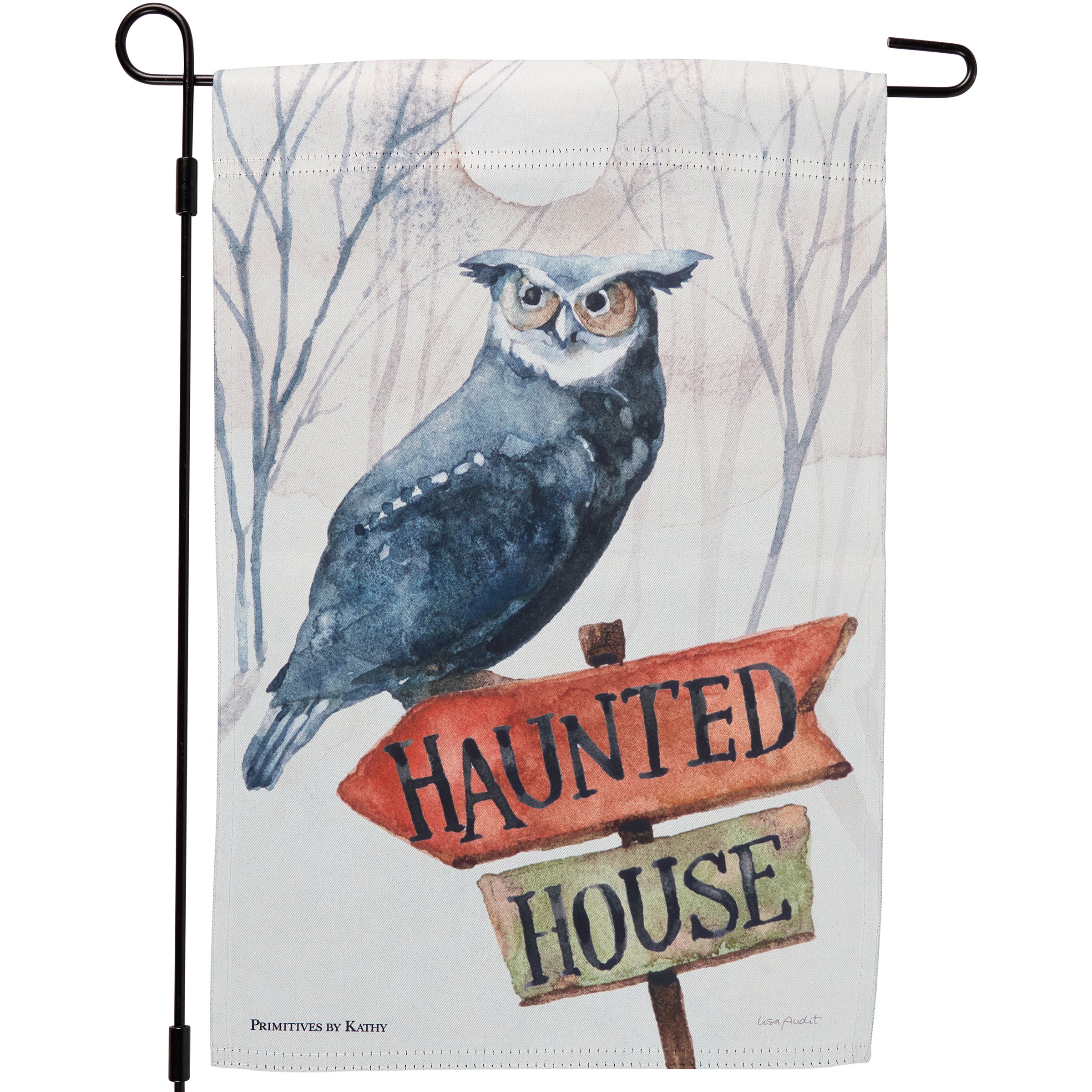 A double-sided polyester garden flag from our Halloween Collection displaying a charming Halloween scene of an owl perched on a haunted house sign. Halloween design is replicated from original art hand painted in a delicate watercolor style. Seasonal garden flag is weather-resistant and features an opening to hang on our Garden Flag Pole. Our Haunted House garden flag is packaged with a header card and hook to easily hang on rack for store display. Hand wash only. A rustic Halloween home accent perfect for seasonal display in any yard or garden.
