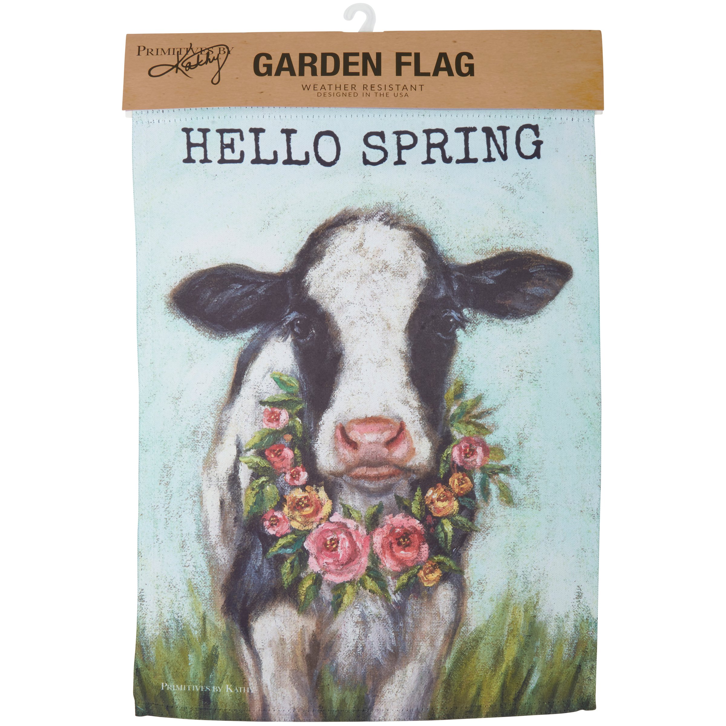 A double-sided polyester garden flag from our Easter & Spring Collection displaying a cow wearing a wreath of flowers and "Hello Spring" sentiment. Design is replicated from original artwork painted onto burlap canvas, giving the art a unique depth and texture. Flag is weather-resistant and features an opening to hang on ourĀ Garden Flag Pole. Hand-wash only. Our Hello Spring garden flag is packaged with a header card and hook to hang on rack.