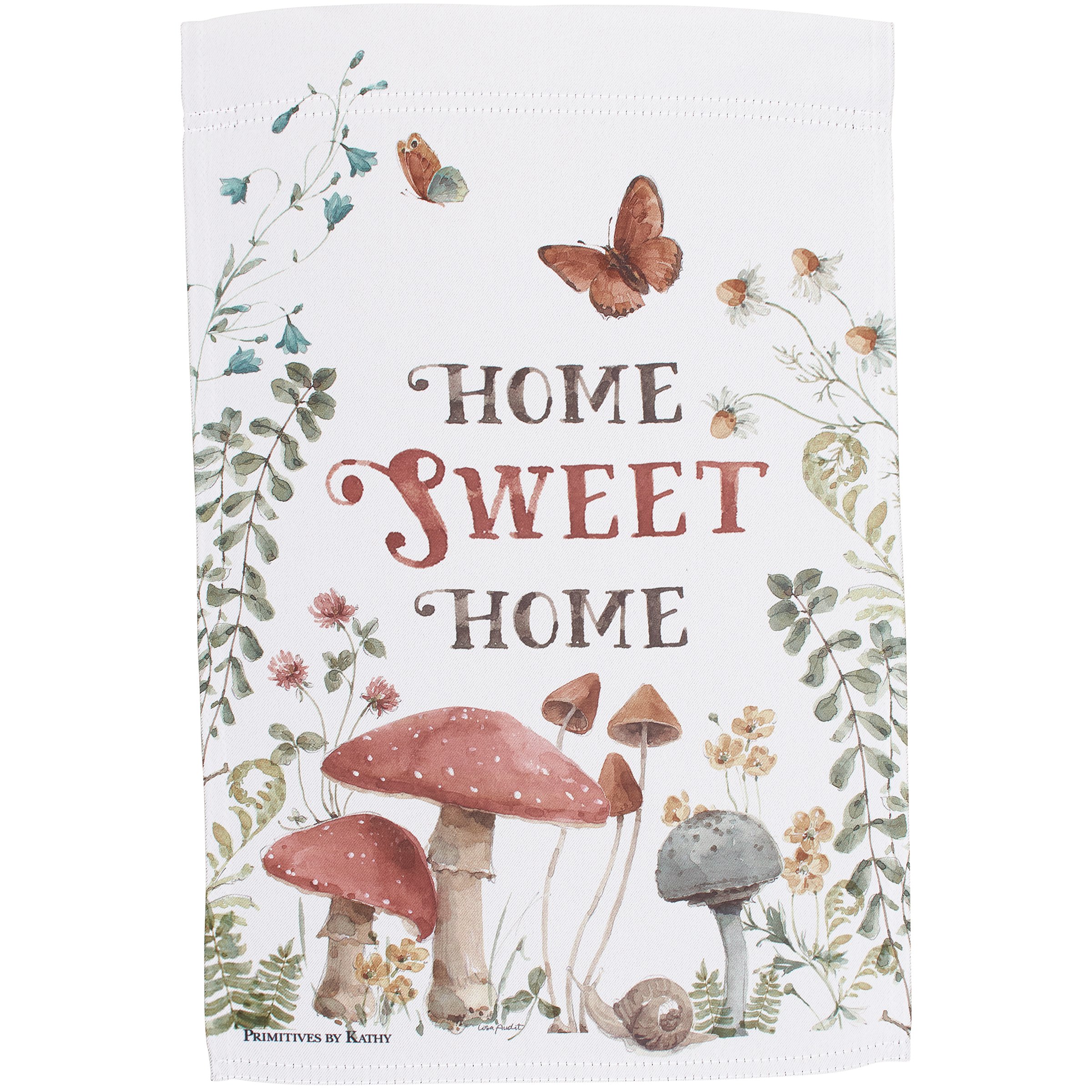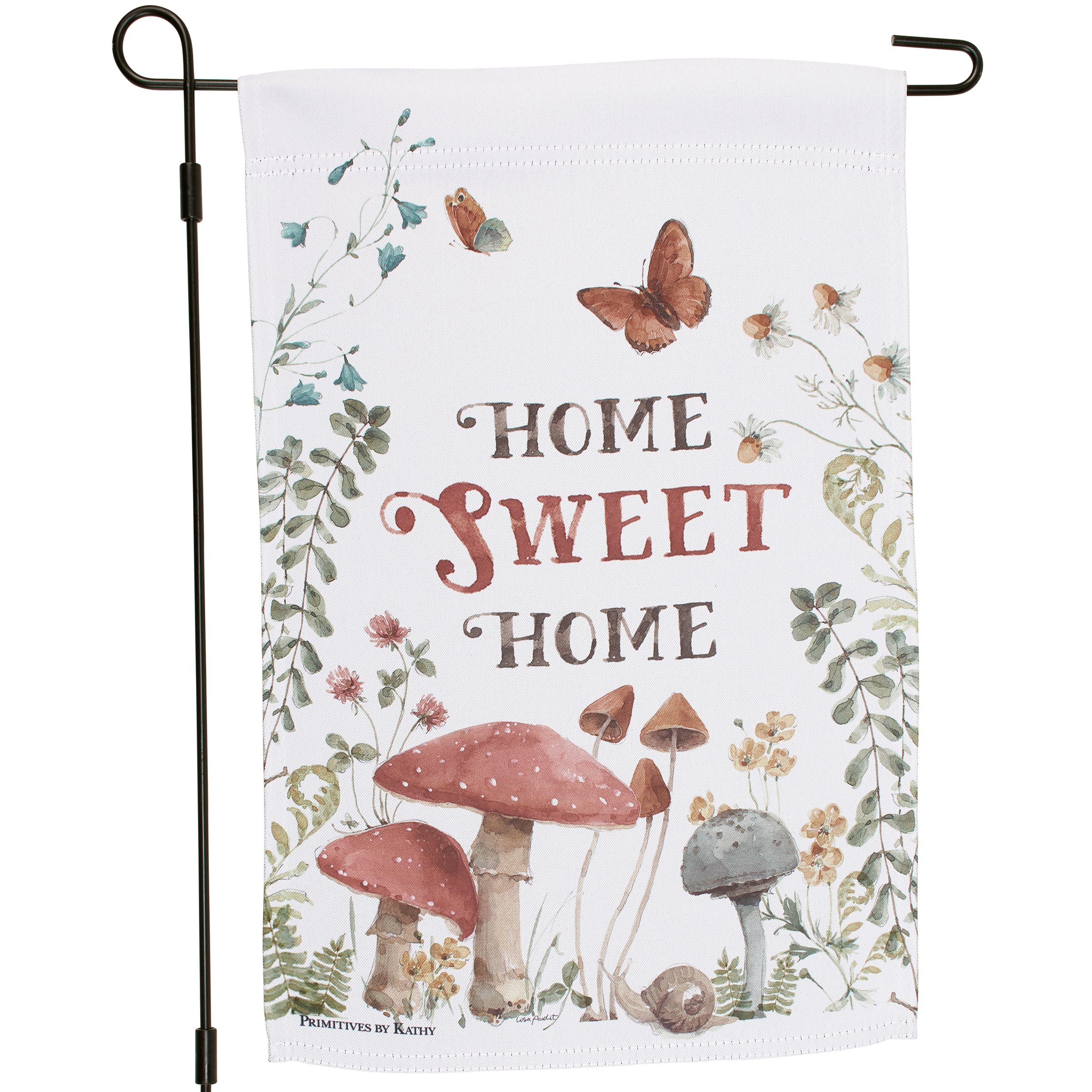 A double-sided polyester garden flag from our Cottagecore Collection displaying a hand painted design of mushrooms, wildflowers, butterflies, and snails in a delicate watercolor style surrounding a comforting sentiment that reads "Home Sweet Home." Flag is weather-resistant and features an opening to hang on ourĀ Garden Flag Pole. Hand-wash only. Our Home Sweet Home garden flag is packaged with a header card and hook to easily hang on rack. A rustic everyday home accent perfect for any yard or garden.