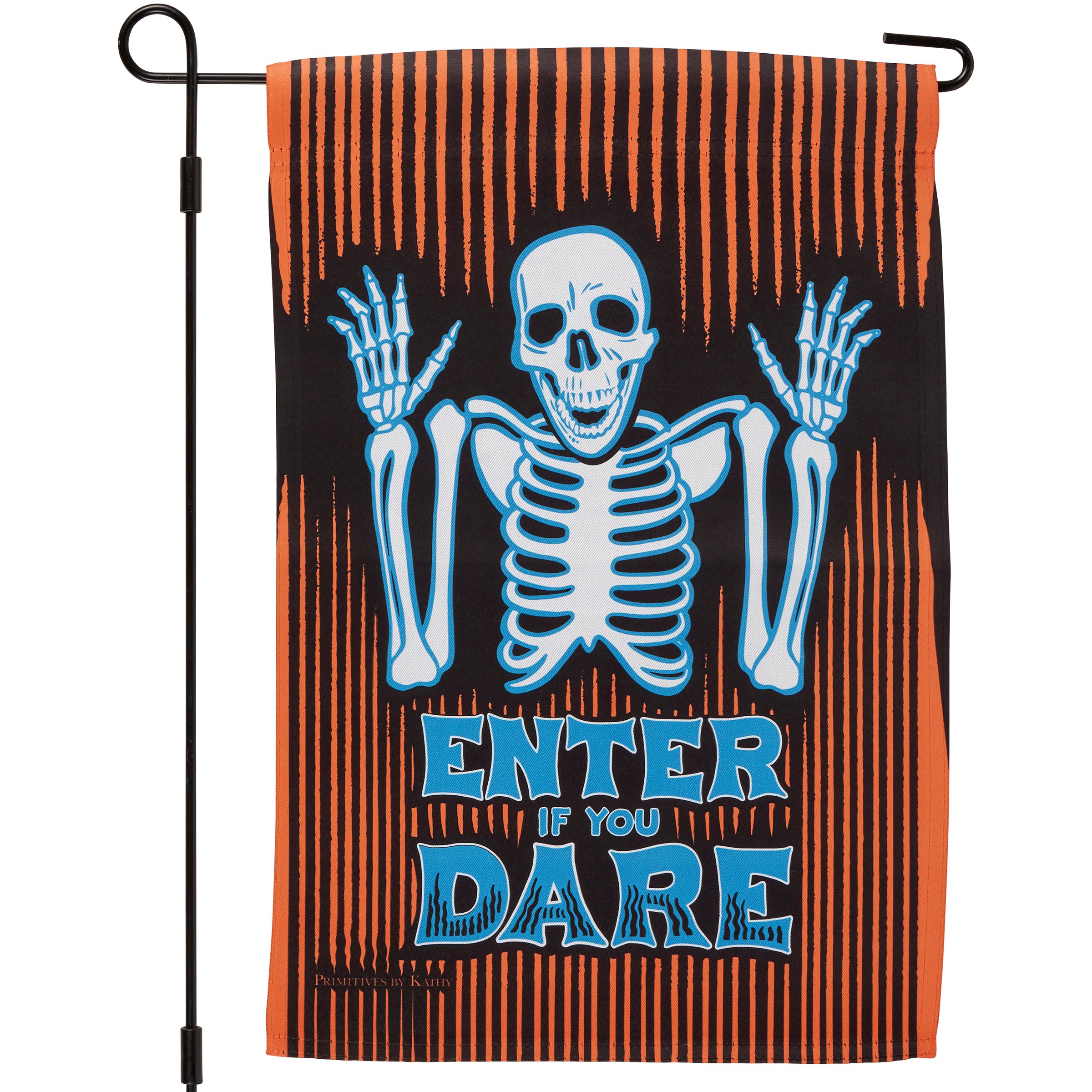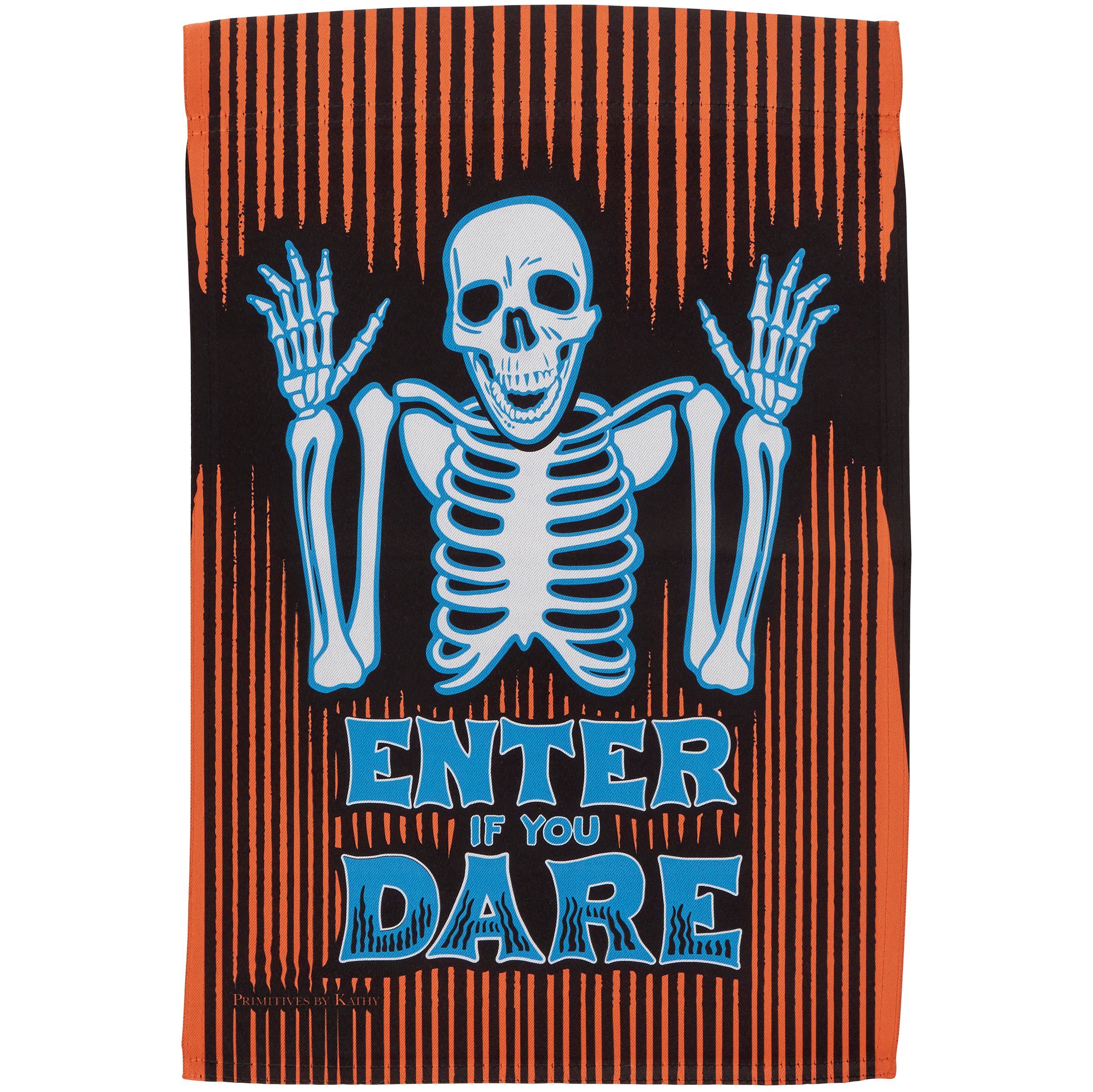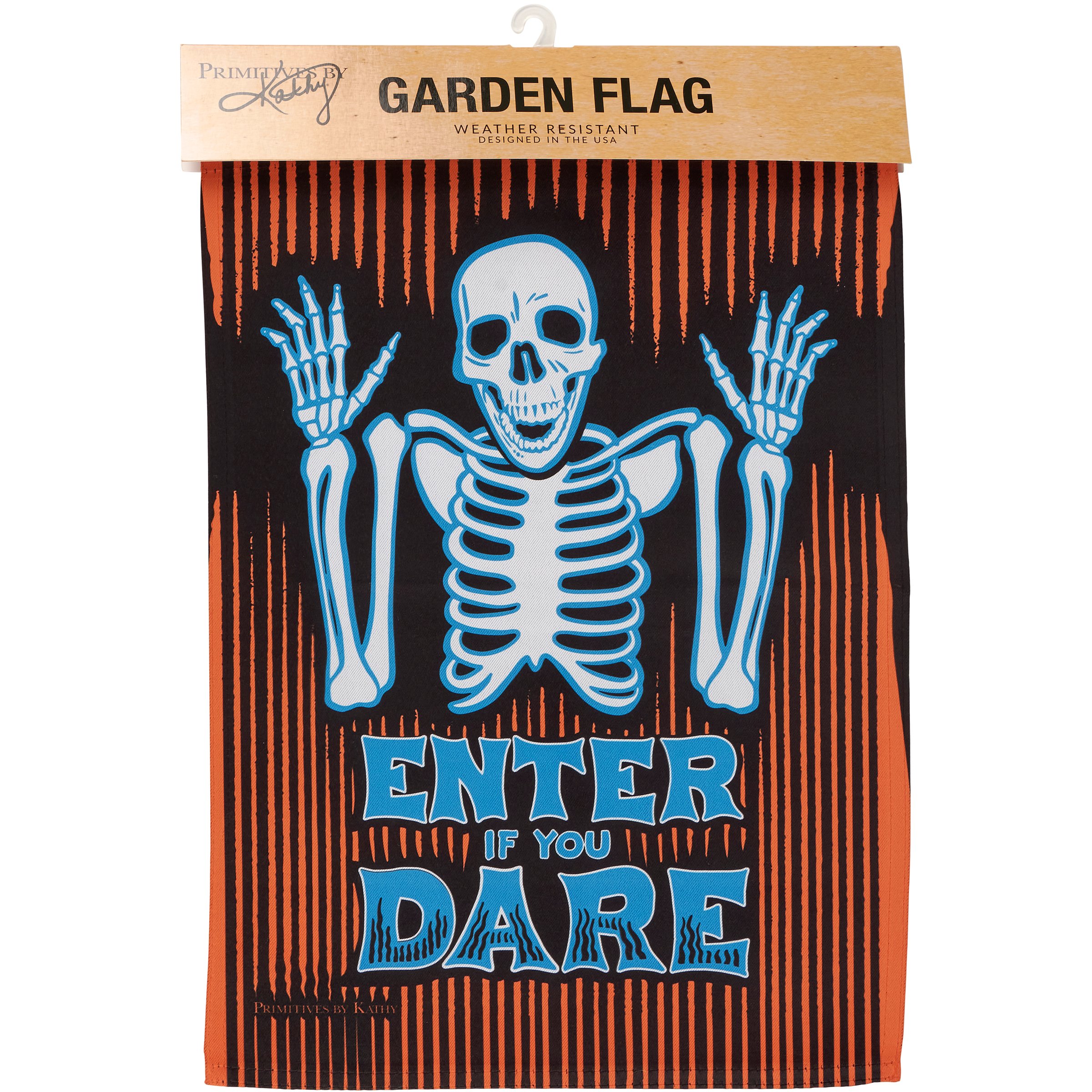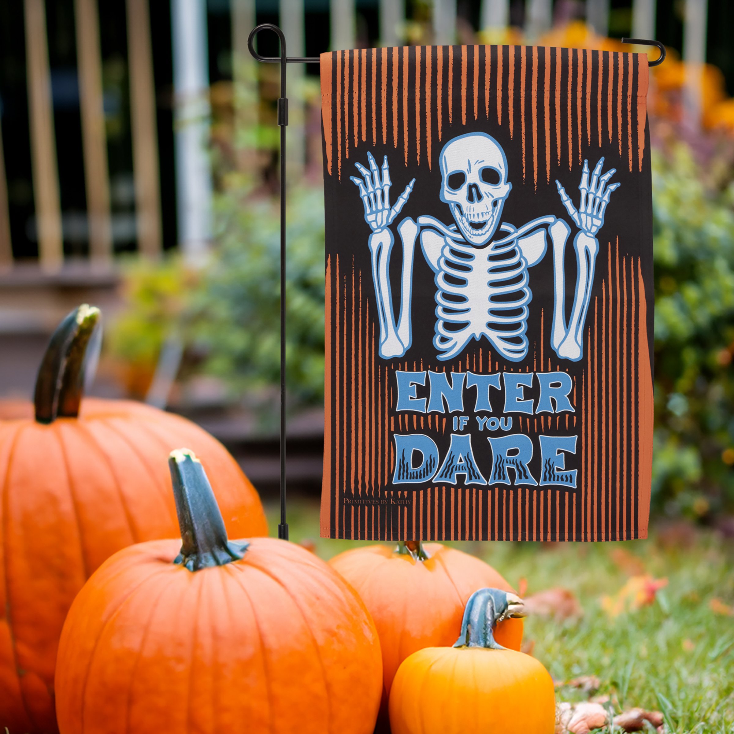 A double-sided polyester garden flag from our Halloween Collection displaying a hand illustrated neon design of a spooky skeleton with a fun Halloween-themed sentiment that reads "Enter If You Dare." Design and sentiment are replicated from original hand illustrated artwork in a fun neon color palette that also looks great in blacklight. Garden flag is weather-resistant and features an opening to hang on our Garden Flag Pole. Our If You Dare garden flag is packaged with a header card and hook to easily hang on rack. Hand wash only. A fun Halloween home accent perfect for seasonal display in any yard or garden.