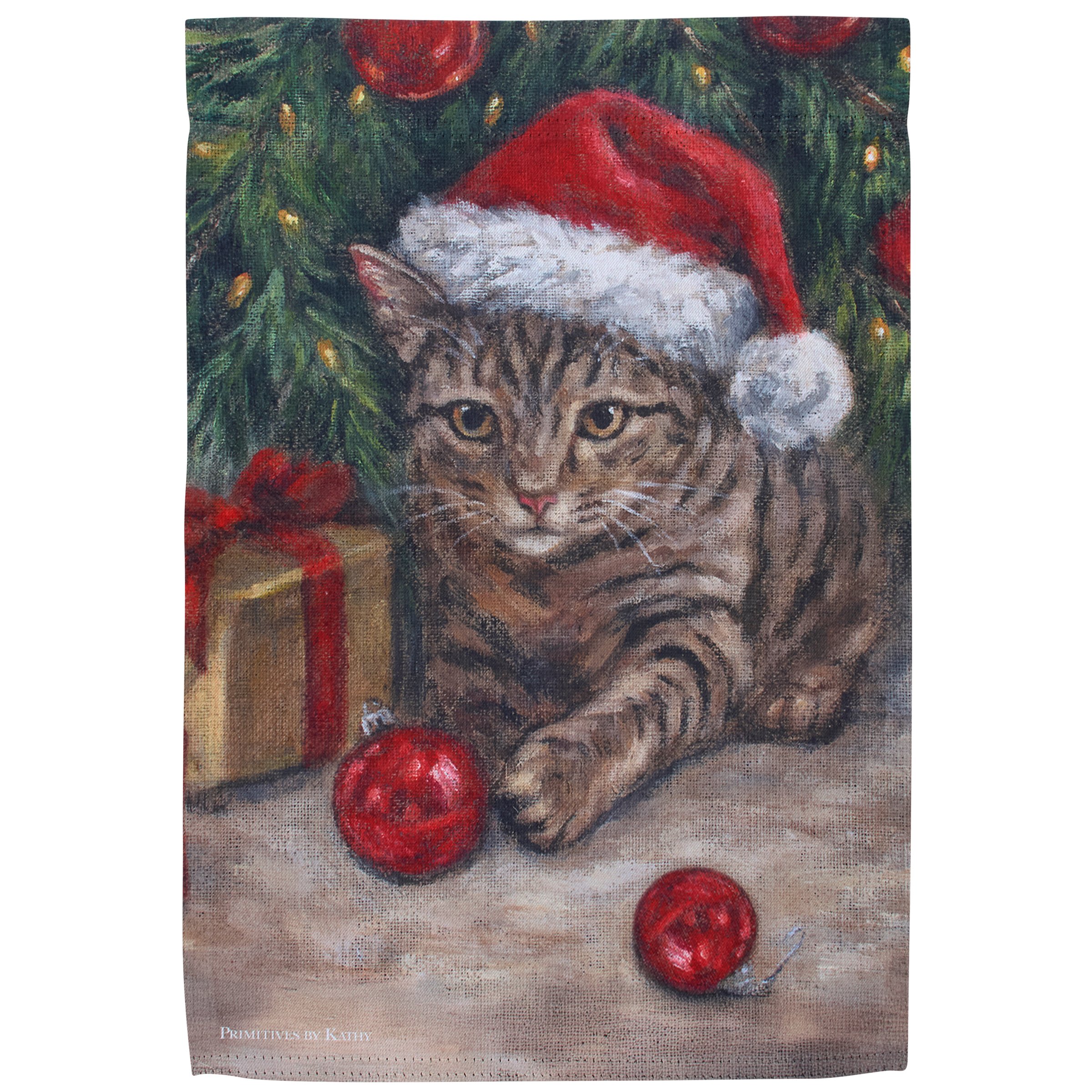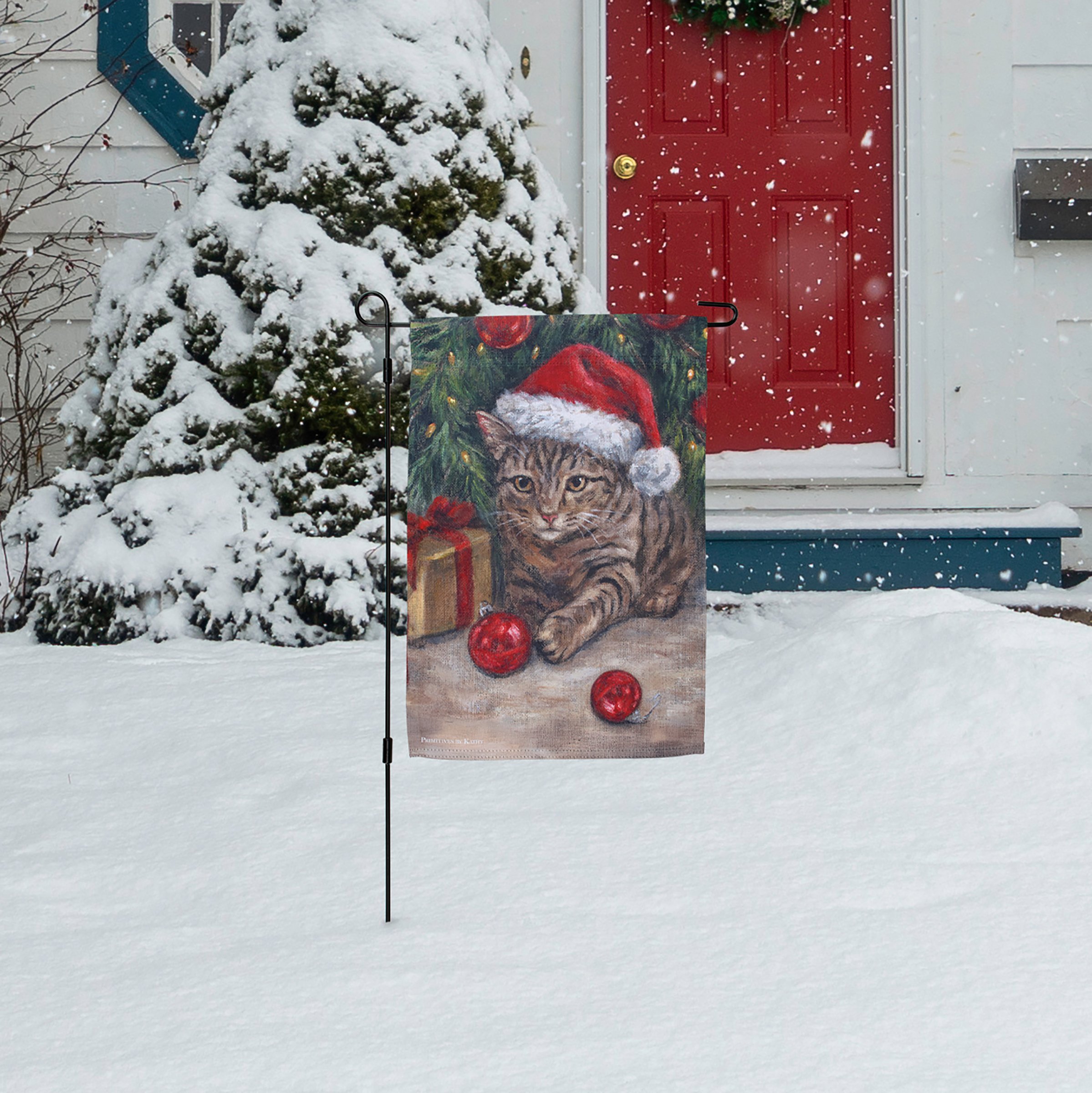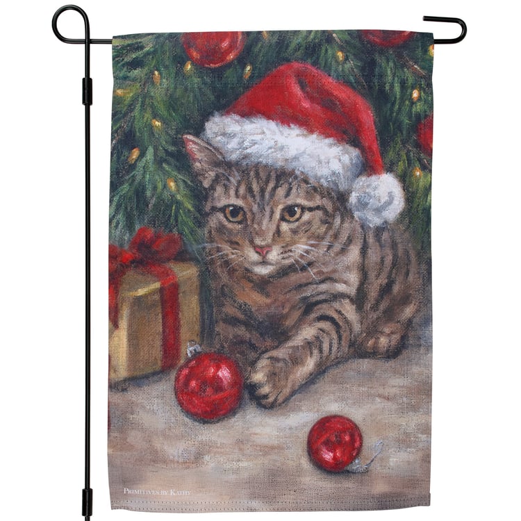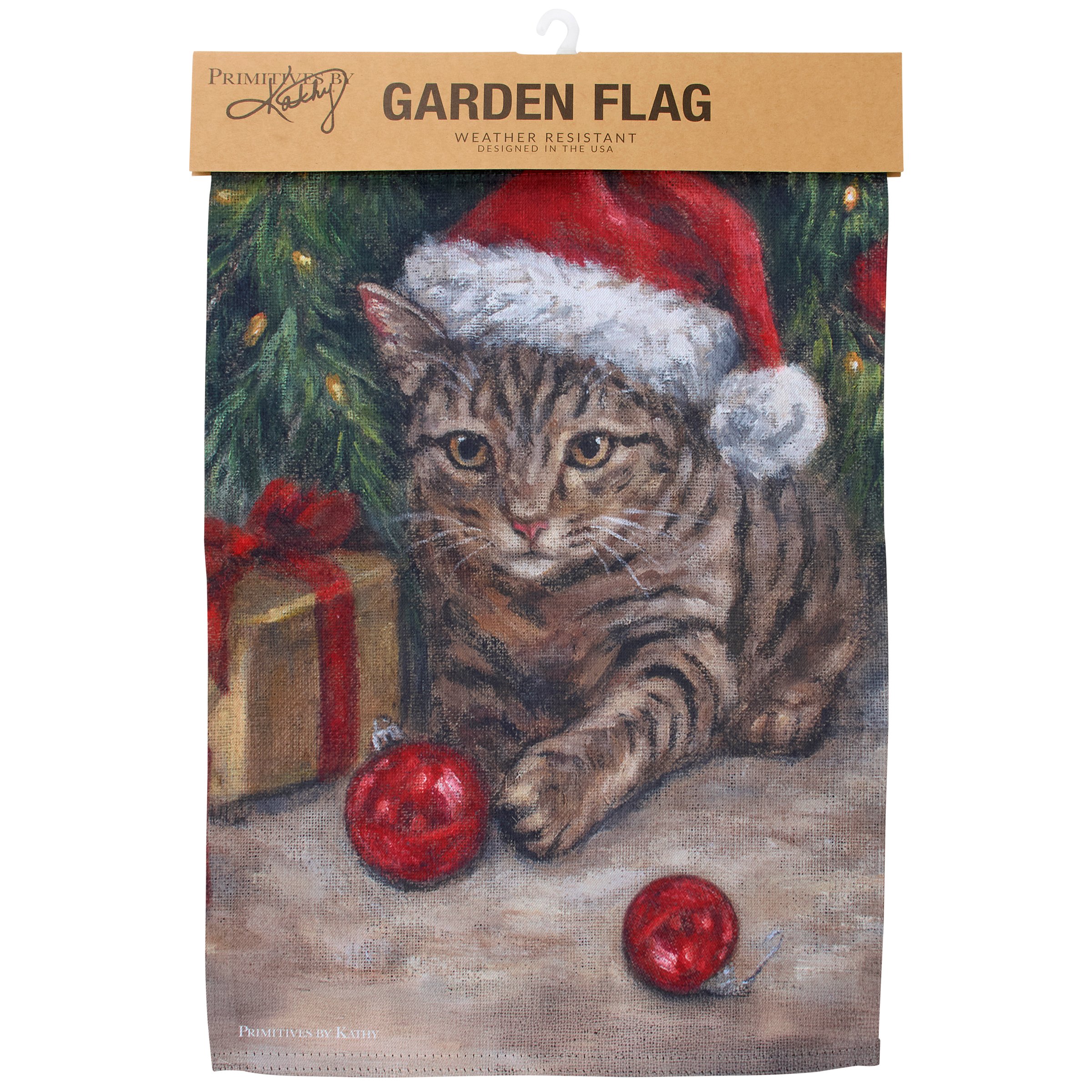 A polyester garden flag from our Holiday Pet Collection/ featuring a double-sided design displaying a charming scene of a kitty wearing a Santa hat under a Christmas tree getting into mischief by knocking down ornaments for a fun combination of a love for Christmas and pets. Christmas kitty design is replicated from original artwork painted onto burlap canvas, giving the art a unique depth and texture. Seasonal garden flag is weather-resistant and features an opening to hang on our Garden Flag Pole. Hand-wash only. Our Kitty Mischief garden flag is packaged with a header card and hook to easily hang on rack for store display. A fun cat themed home accent perfect for seasonal display in any yard or garden.