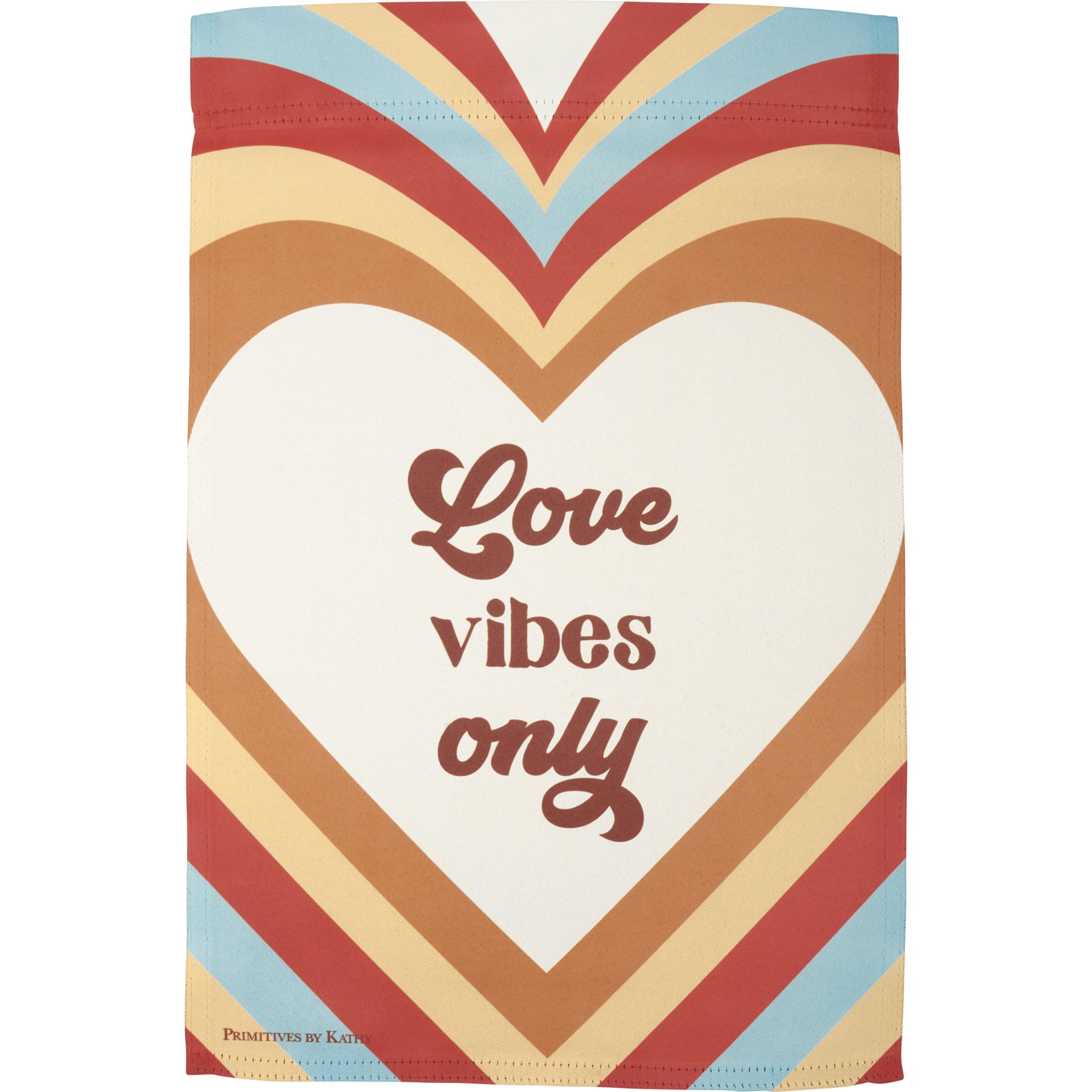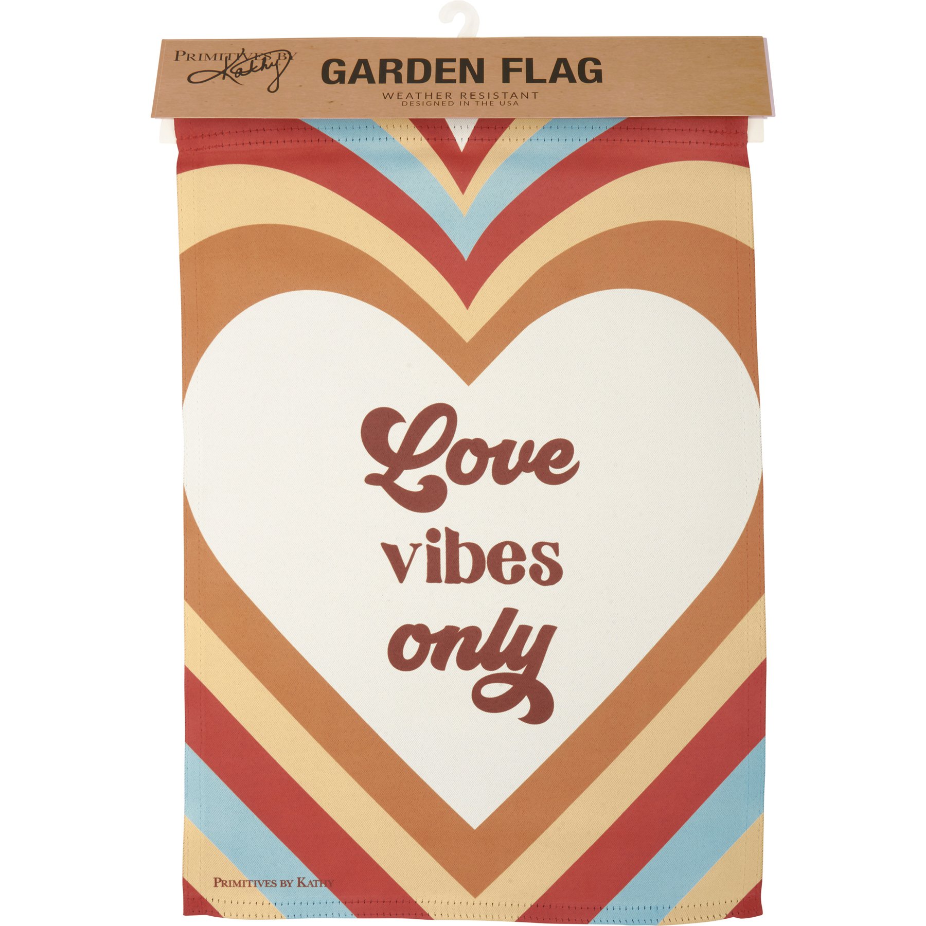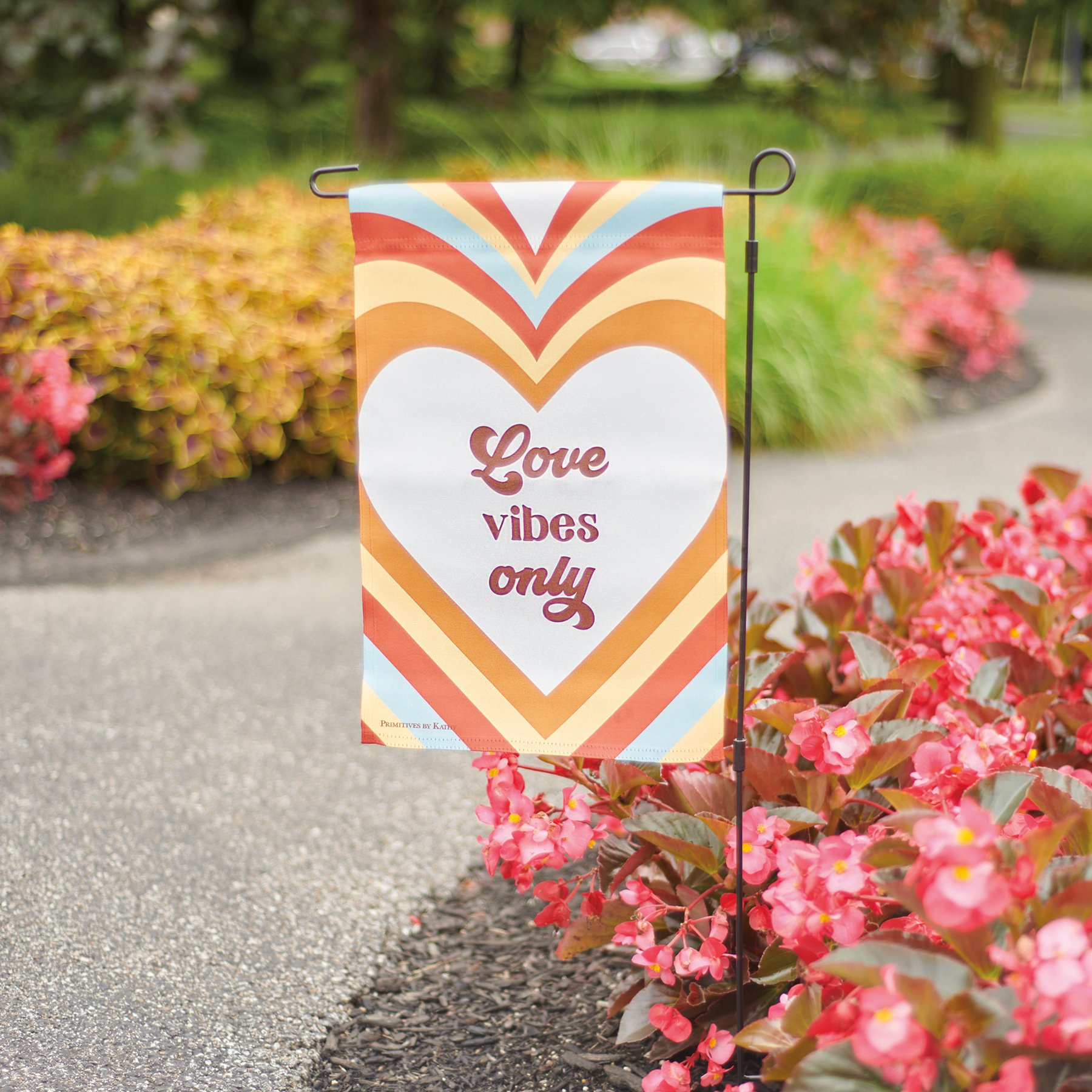 A double-sided polyester garden flag from our Valentine's Day Collection displaying a groovy "Love Vibes Only" sentiment with retro swirl heart design. Flag is weather-resistant and features an opening to hang on our Garden Flag Pole. Hand-wash only. Our Love Vibes Only garden flag is packaged with a header card and hook to hang on rack.