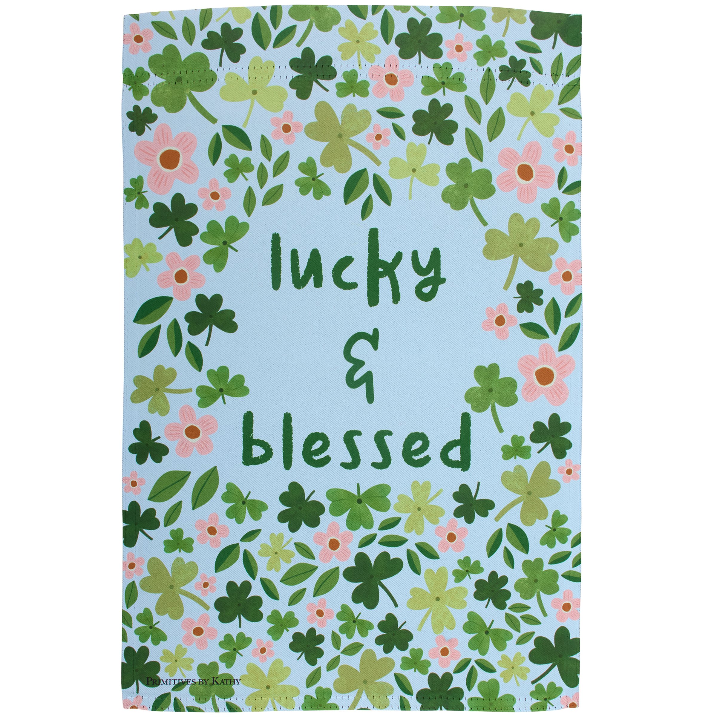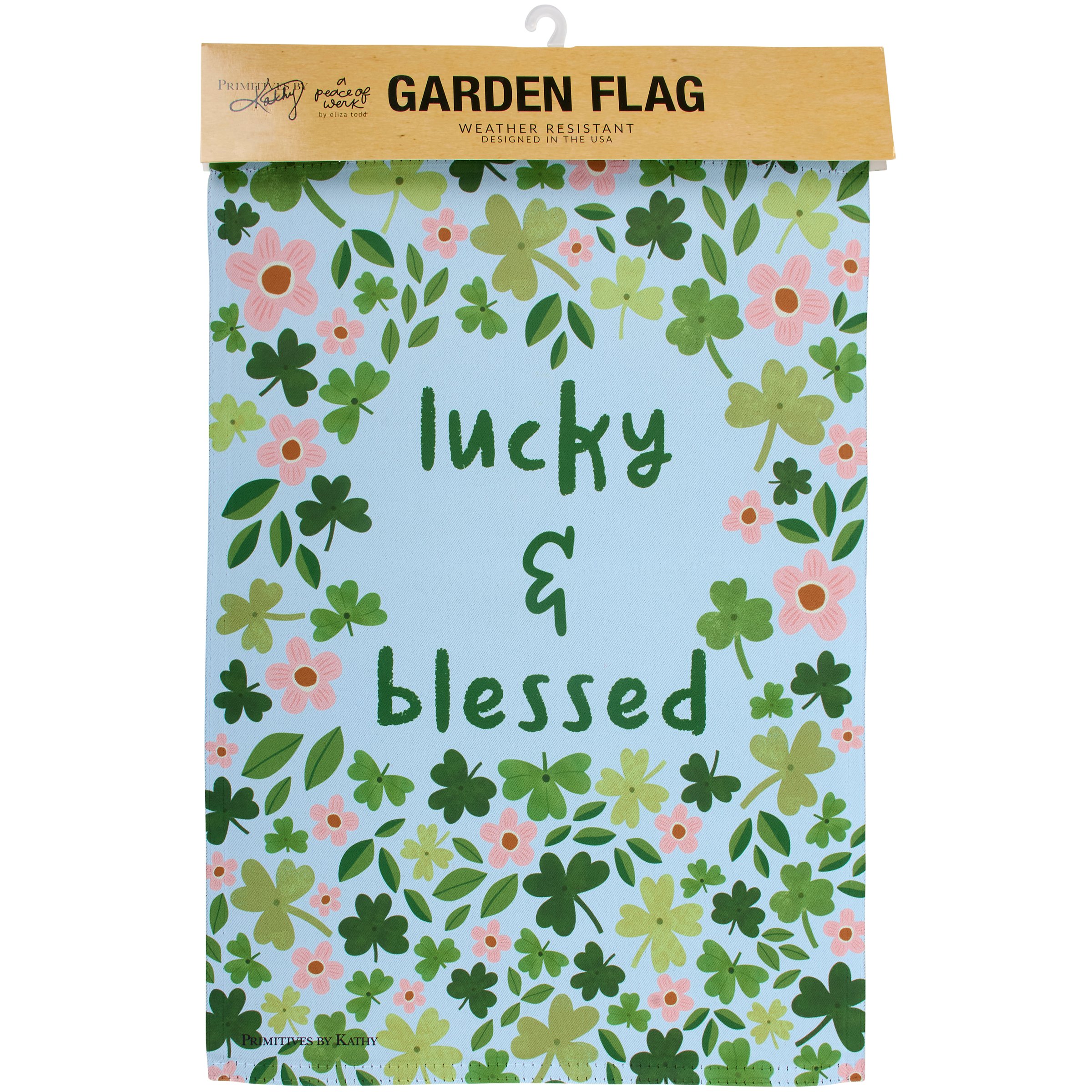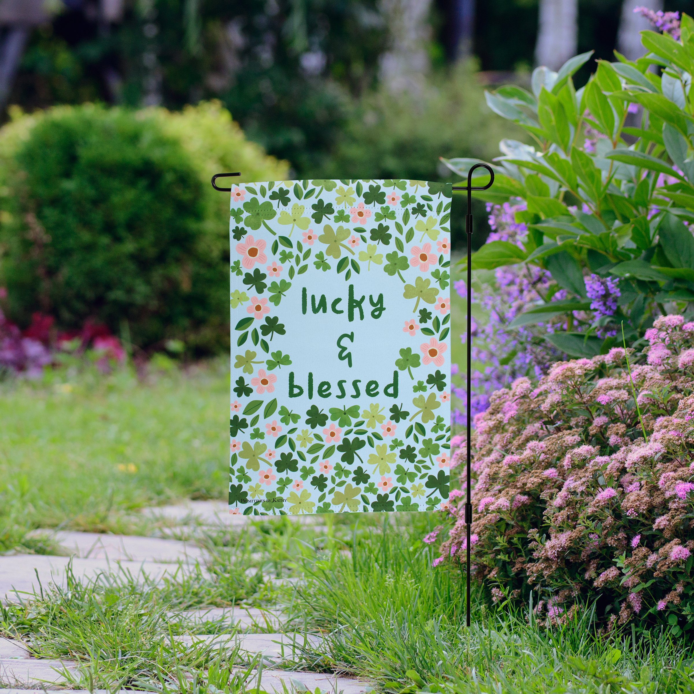 A double-sided polyester garden flag from our St. Patrick's Day Collection displaying a toss pattern of shamrocks and spring flowers around an inspirational seasonal sentiment that reads "Lucky & Blessed." St. Patrick's Day design and sentiment is replicated from original hand illustrated artwork. Seasonal garden flag is weather-resistant and features an opening to hang on our Garden Flag Pole. Hand wash only. Our Lucky & Blessed garden flag is packaged with a header card and hook to easily hang on rack for store display. An inspirational St. Patrick's Day home accent perfect for seasonal display in any yard or garden.
