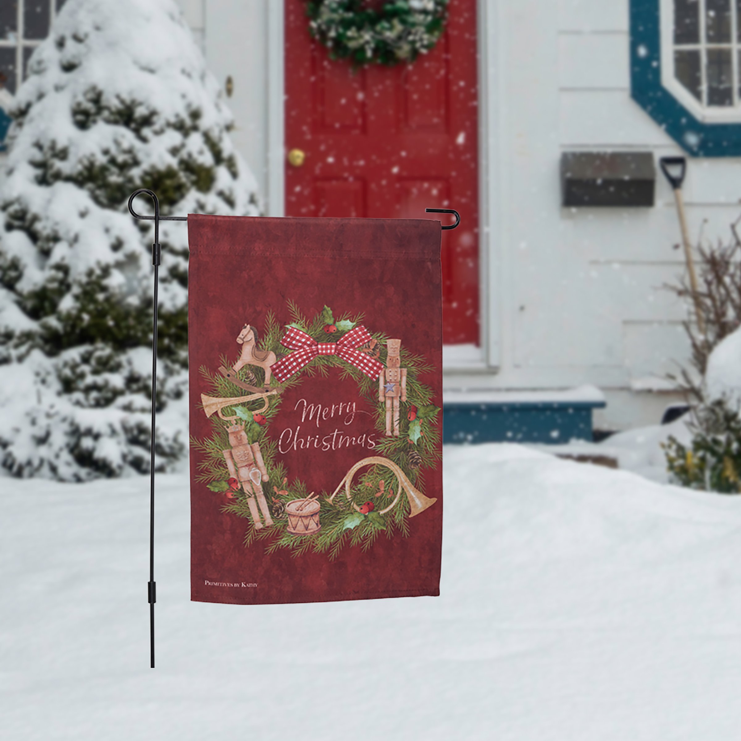 A double-sided polyester garden flag from our Christmas Collection displaying a rustic design of a Christmas wreath with nutcrackers and a seasonal sentiment in the center that reads "Merry Christmas." Seasonal garden flag is weather-resistant and features an opening to hang on our Garden Flag Pole. Our Nutcracker Wreath garden flag is packaged with a header card and hook to easily hang on rack. Hand wash only. A rustic Christmas-themed home accent perfect for seasonal display in any yard or garden.