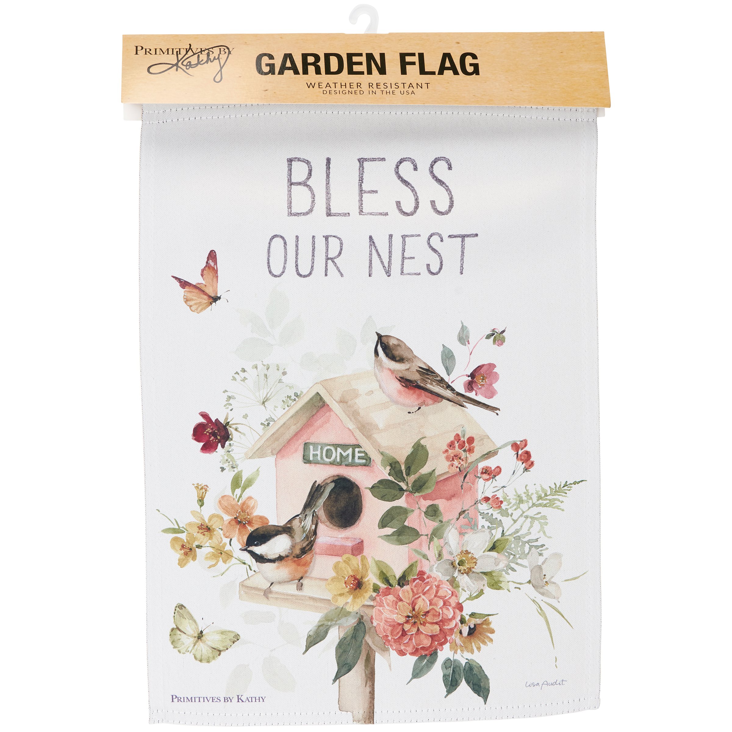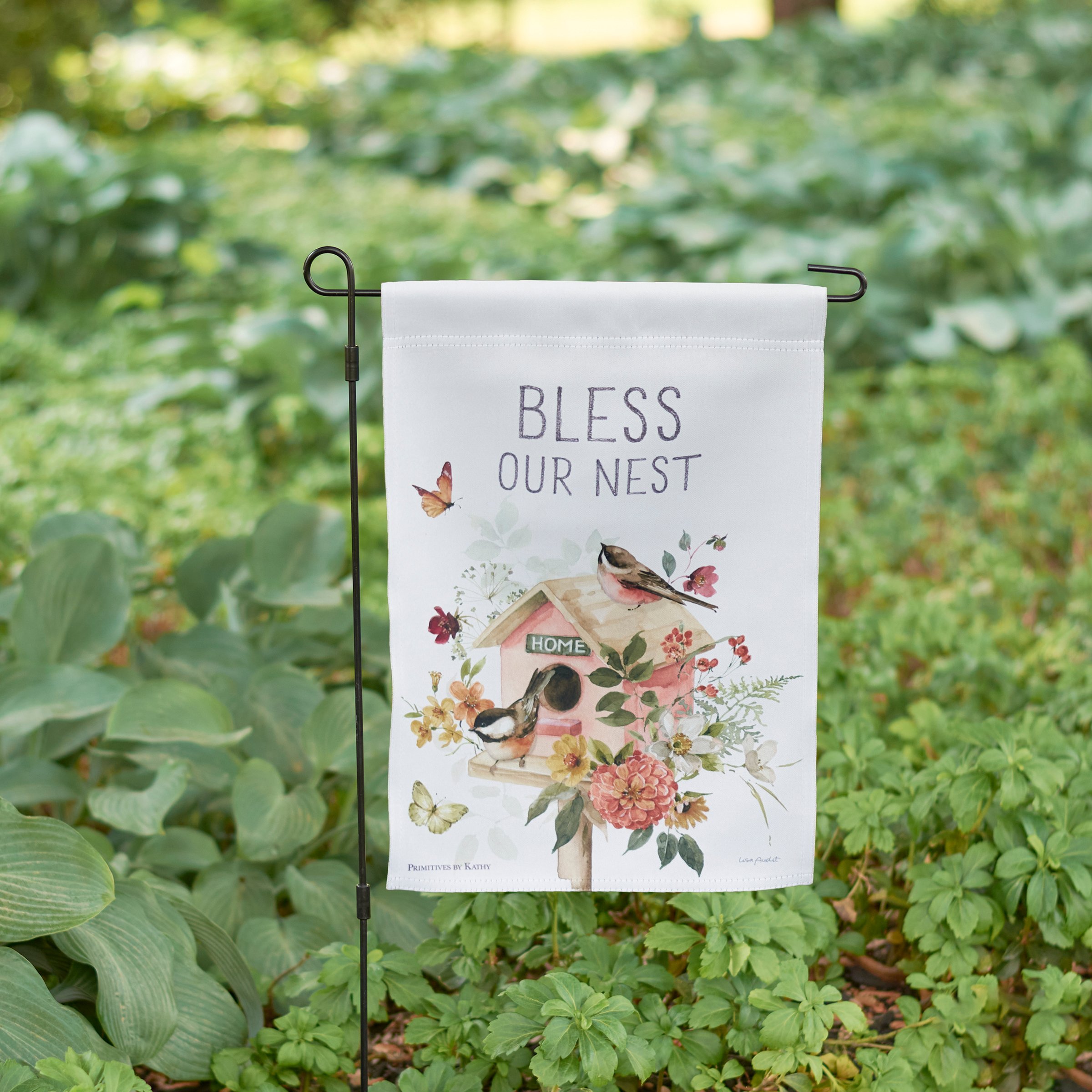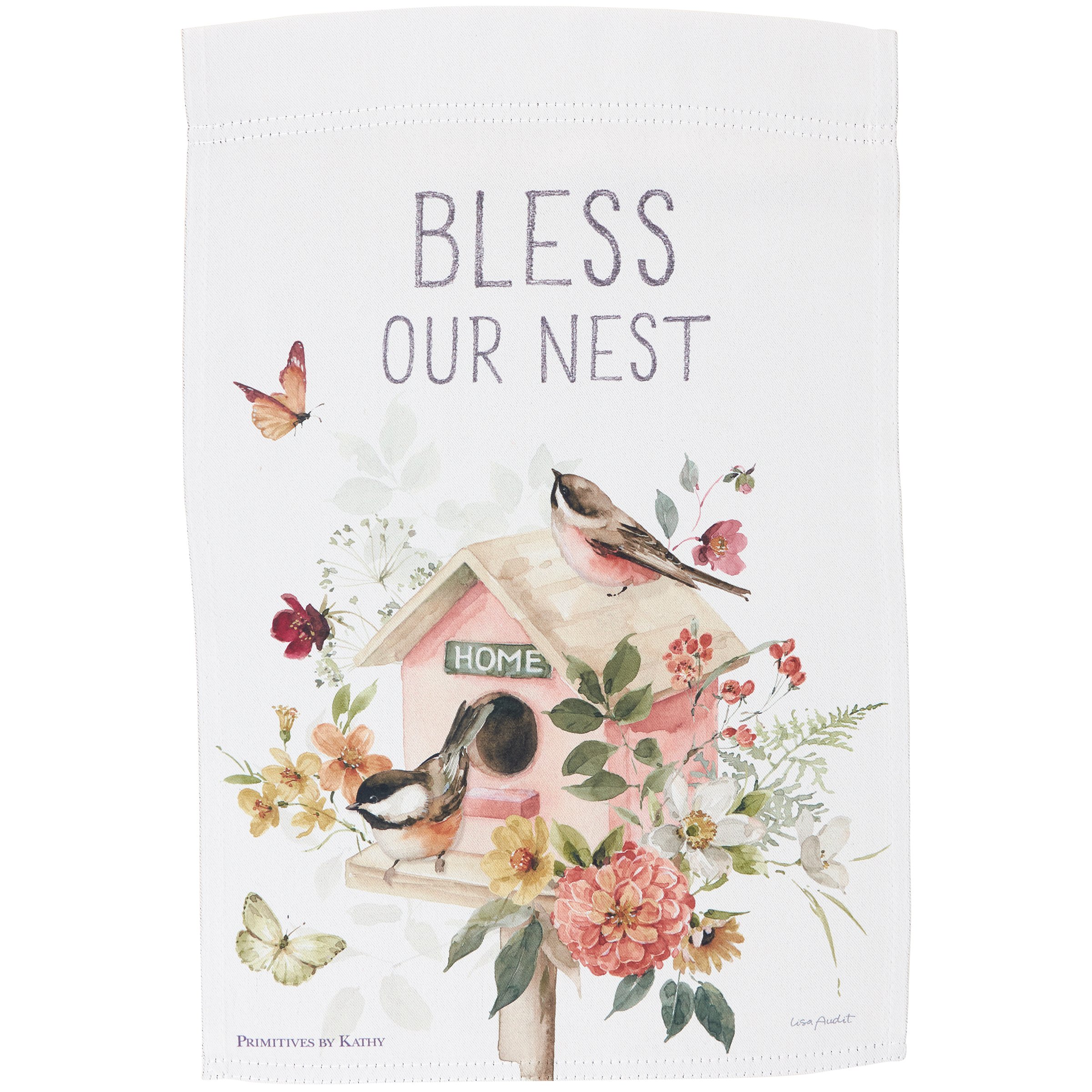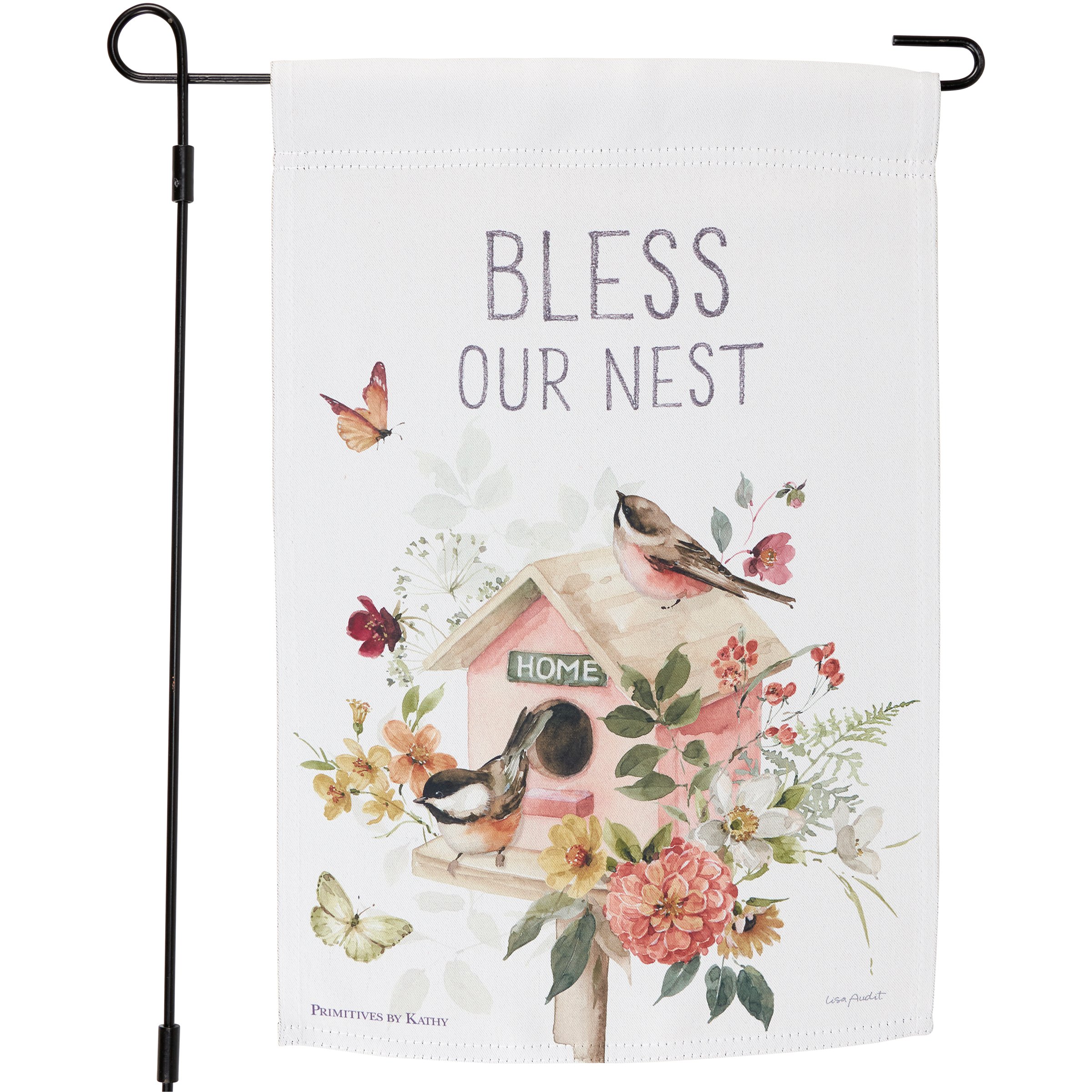 A double-sided polyester garden flag from our Easter & Spring Collection displaying a comforting scene of chickadees living in a birdhouse surrounded by spring flowers with an inspirational sentiment that reads "Bless Our Nest." Design is replicated from original art hand painted in a delicate watercolor style. Garden flag is weather-resistant and features an opening to hang on our Garden Flag Pole. Our Nest garden flag is packaged with a header card and hook to easily hang on rack. Hand wash only. A charming everyday home accent perfect for any yard or garden.