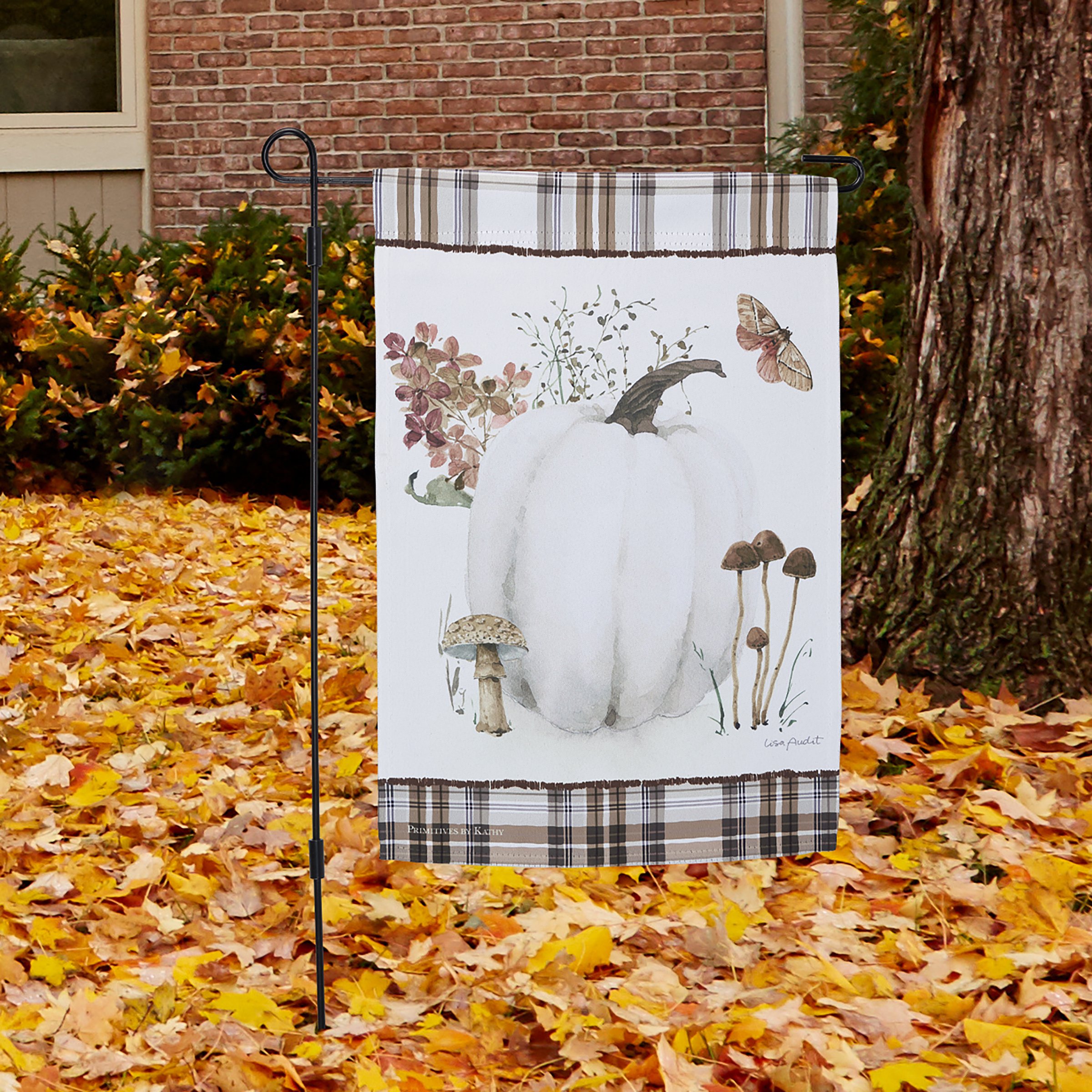 A double-sided polyester garden flag from our Fall & Harvest Collection displaying a white pumpkin surrounded by fall foliage. Design also features coordinating fall inspired plaid patterns at the top and bottom. Flag design is replicated from original art hand painted in a delicate watercolor style. Seasonal garden flag is weather-resistant and features an opening to hang on our Garden Flag Pole. Our Pumpkin garden flag is packaged with a header card and hook to easily hang on rack. Hand wash only. A charming fall-themed home accent perfect for seasonal display in any yard or garden.