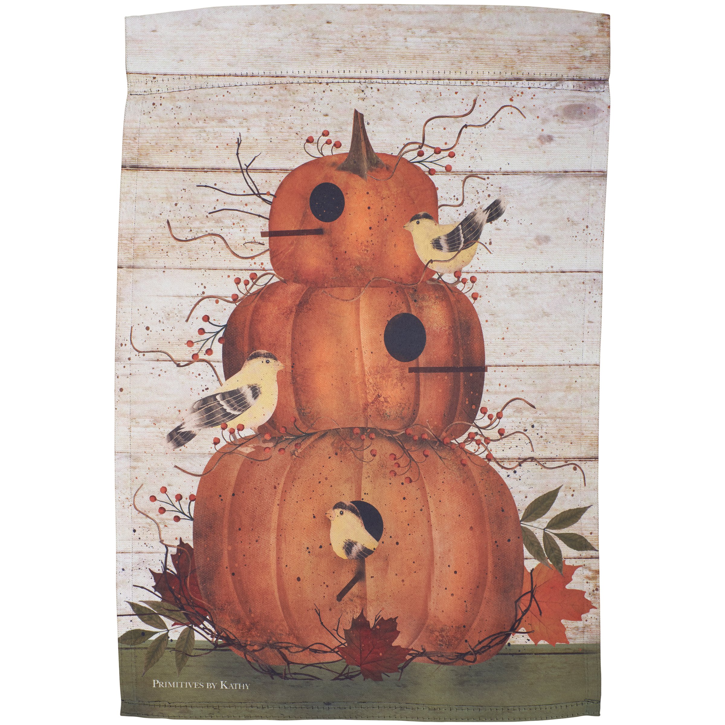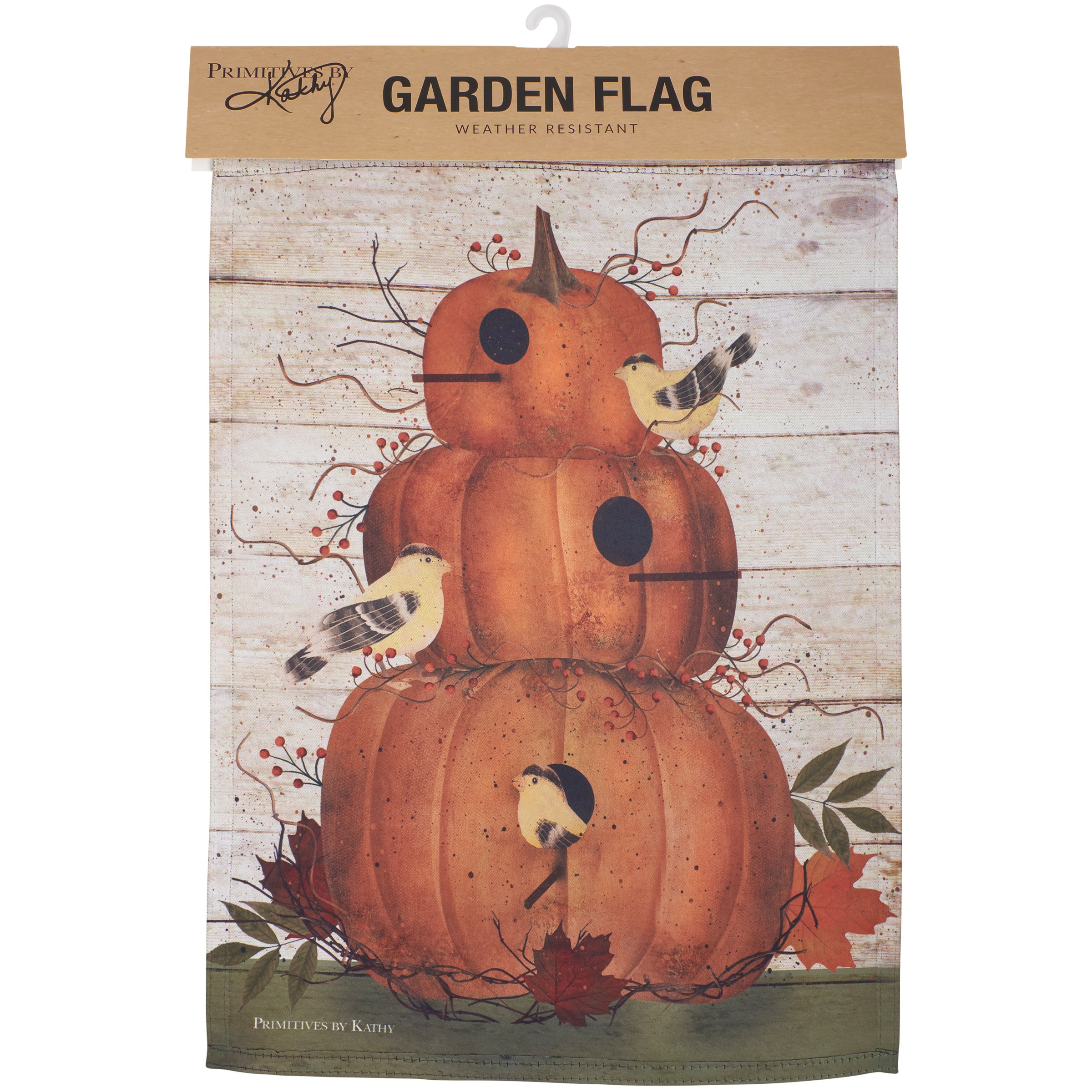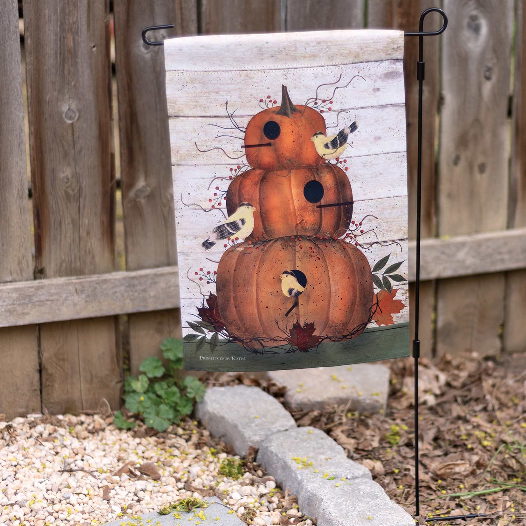 A double-sided polyester garden flag from our Fall & Harvest Collection displaying a rustic design of a layered pumpkin birdhouse and birds. Our garden flags are weather-resistant and feature an opening to hang on ourĀ Garden Flag Pole. Hand-wash only. The Pumpkins and Birds garden flag is packaged with a header card and hook to hang on rack.
