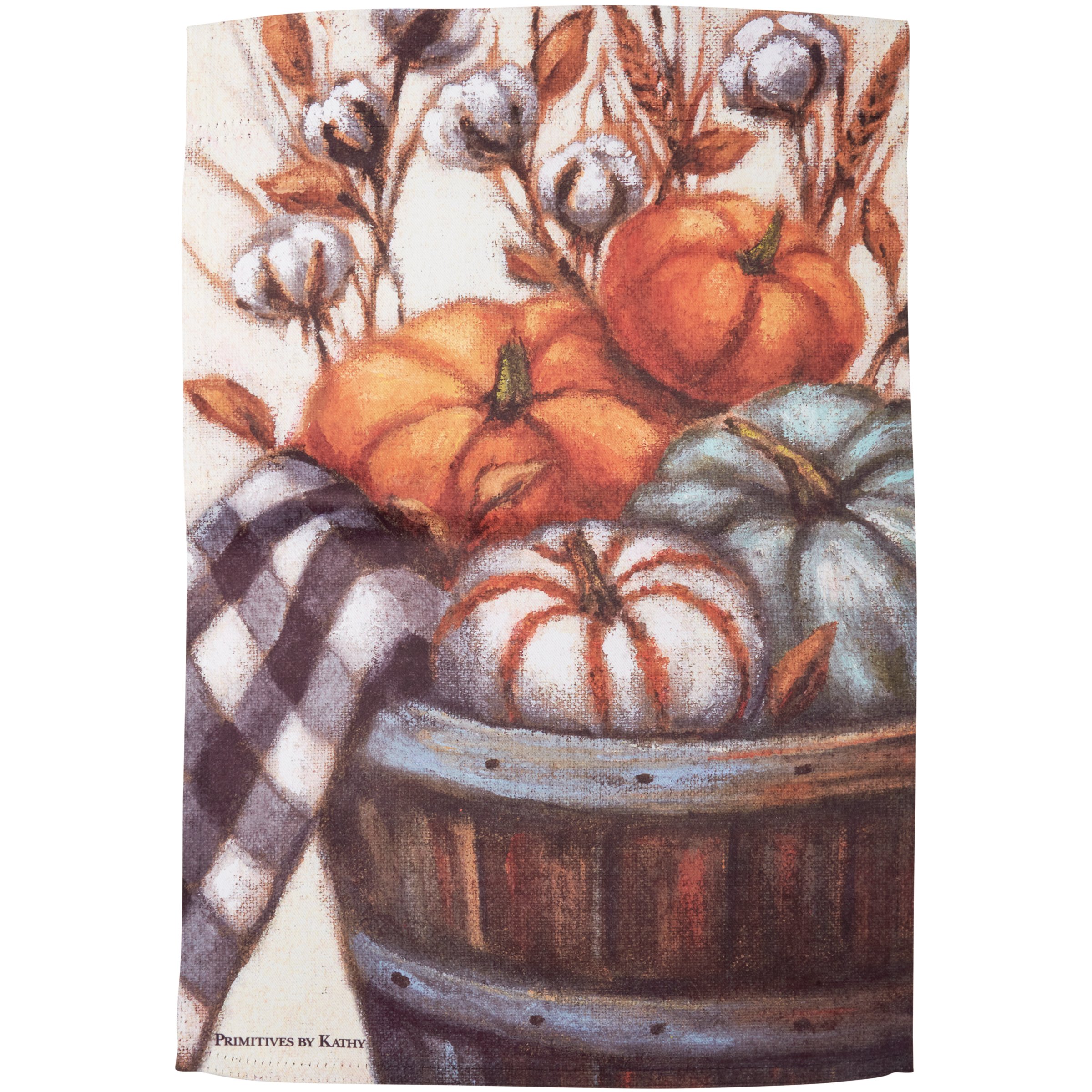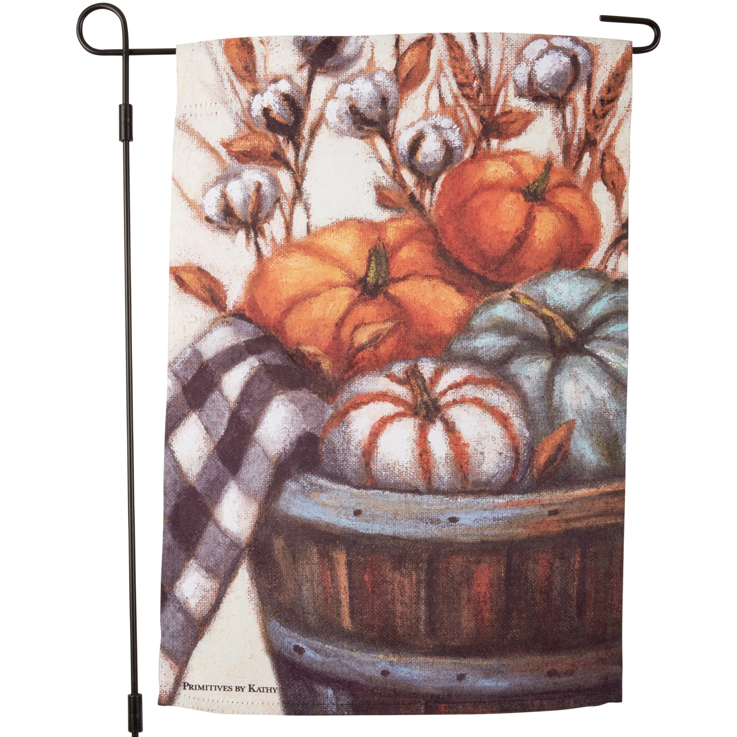 A double-sided polyester garden flag from our Fall & Harvest Collection displaying a design of autumn pumpkins in a basket. Design is replicated from original artwork painted onto burlap canvas, giving the art a unique depth and texture. Our garden flags are weather-resistant and feature an opening to hang on ourĀ Garden Flag Pole. Hand-wash only. The Pumpkins In A Basket garden flag is packaged with a header card and hook to hang on rack.