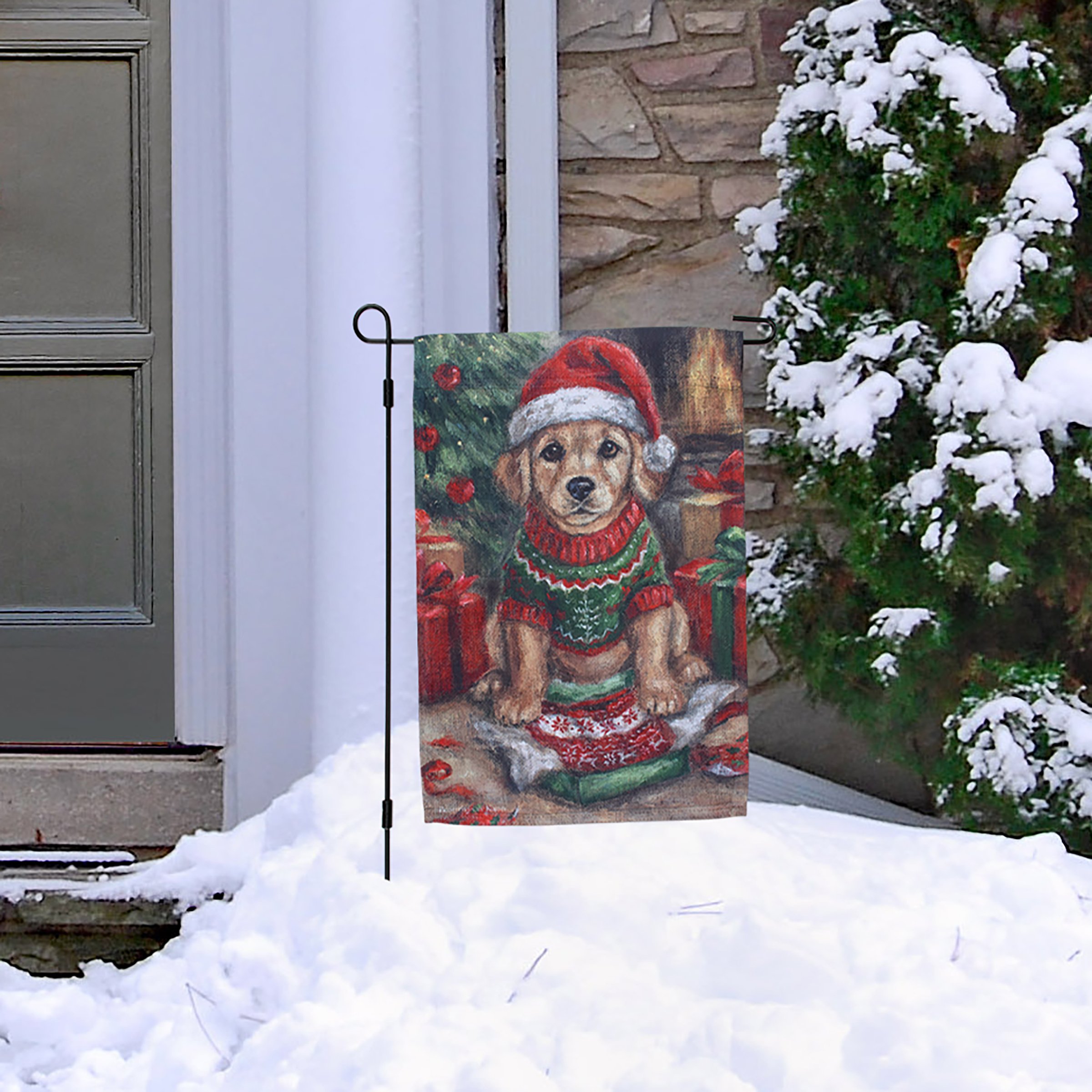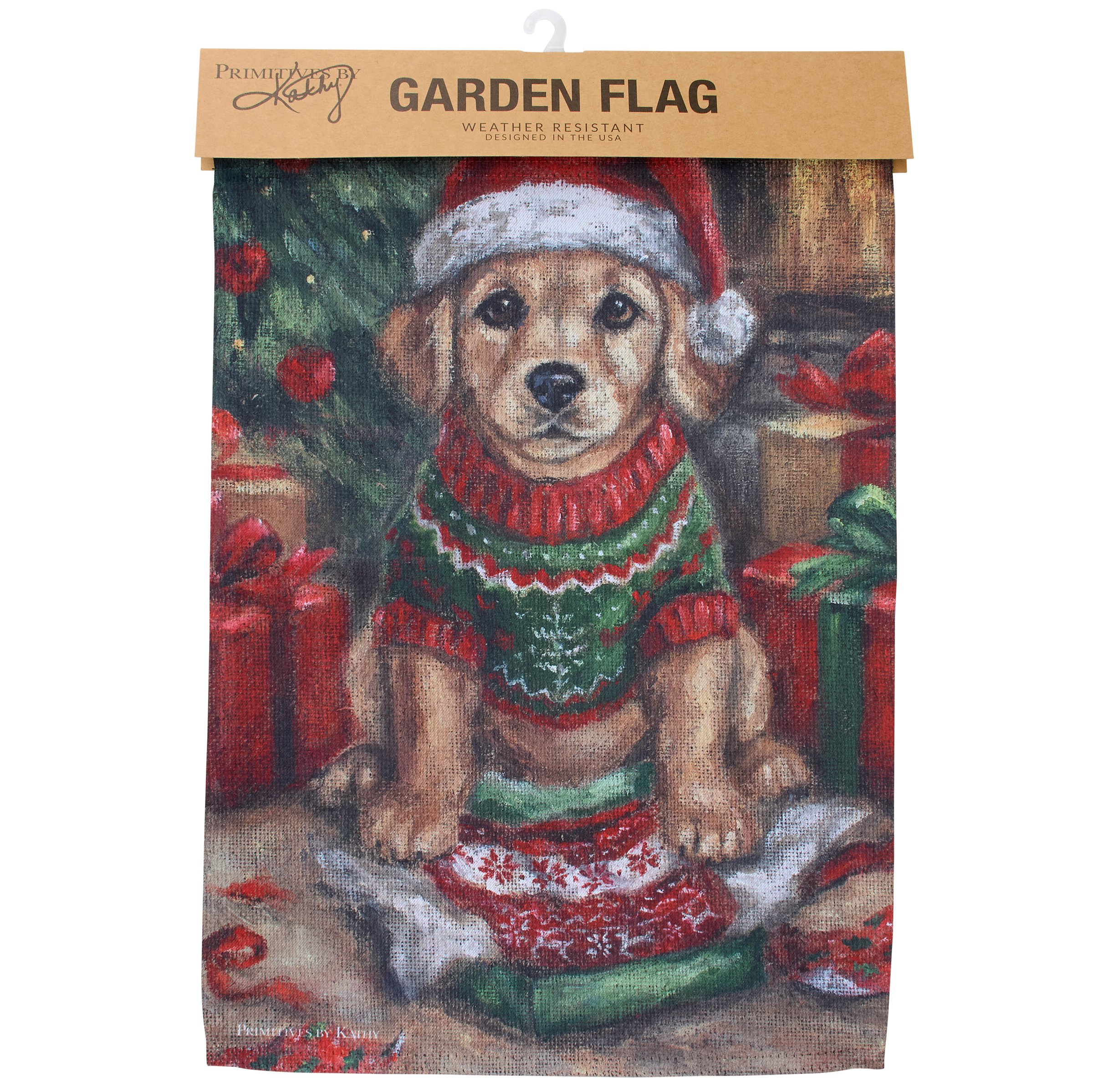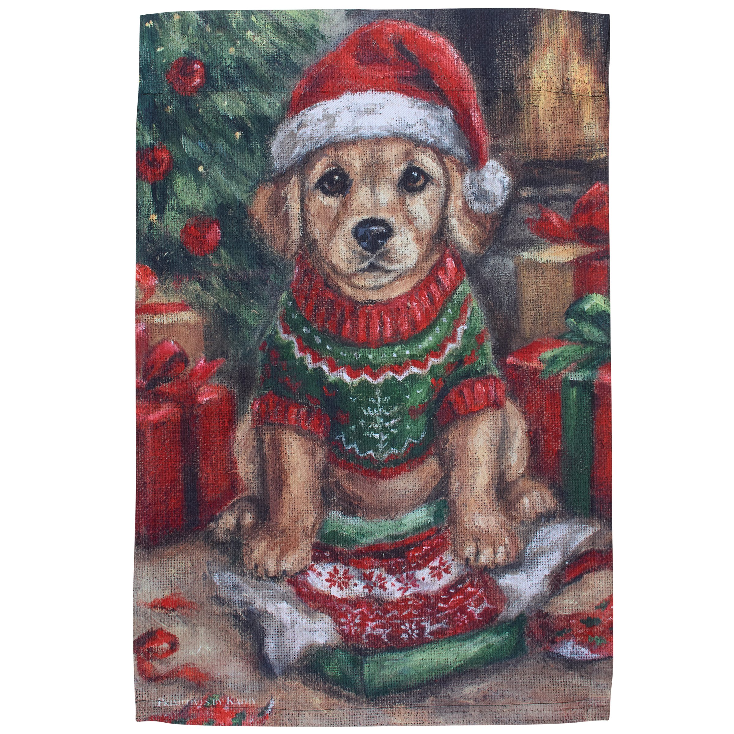 A polyester garden flag from our Holiday Pet Collection/ featuring a double-sided design displaying a charming scene of a puppy wearing a Santa hat and holiday sweater getting into mischief by opening presents under a Christmas tree for a fun combination of a love for Christmas and pets. Christmas puppy design is replicated from original artwork painted onto burlap canvas, giving the art a unique depth and texture. Seasonal garden flag is weather-resistant and features an opening to hang on our Garden Flag Pole. Hand-wash only. Our Puppy Mischief garden flag is packaged with a header card and hook to easily hang on rack for store display. A fun dog themed home accent perfect for seasonal display in any yard or garden.