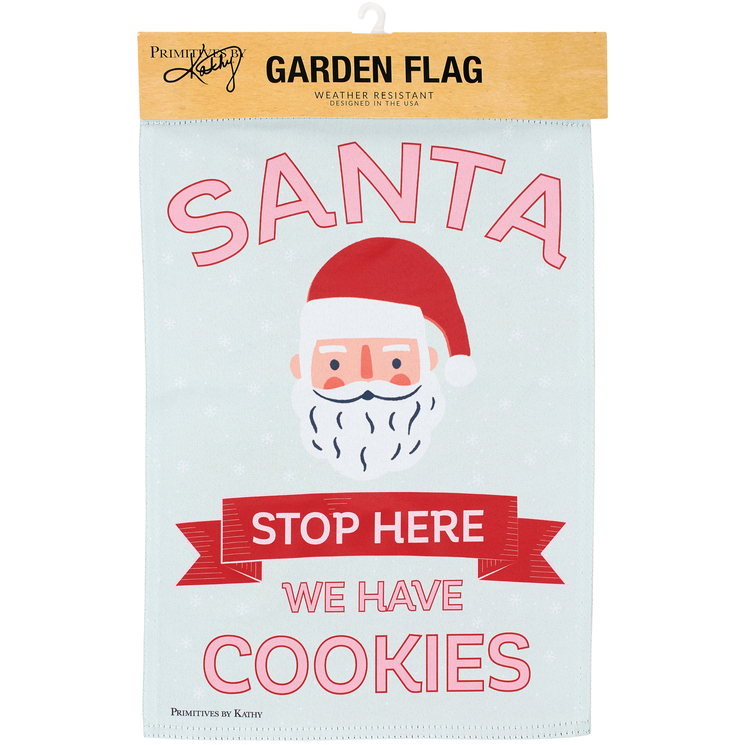 A double-sided polyester garden flag from our Christmas Collection displaying a pastel inspired design of Santa and fun seasonal sentiment that reads "Santa - Stop Here - We Have Cookies." Seasonal garden flag is weather-resistant and features an opening to hang on our Garden Flag Pole. Our Santa We Have Cookies garden flag is packaged with a header card and hook to easily hang on rack for store display. Hand wash only. A fun pastel Christmas home accent perfect for seasonal display in any yard or garden.