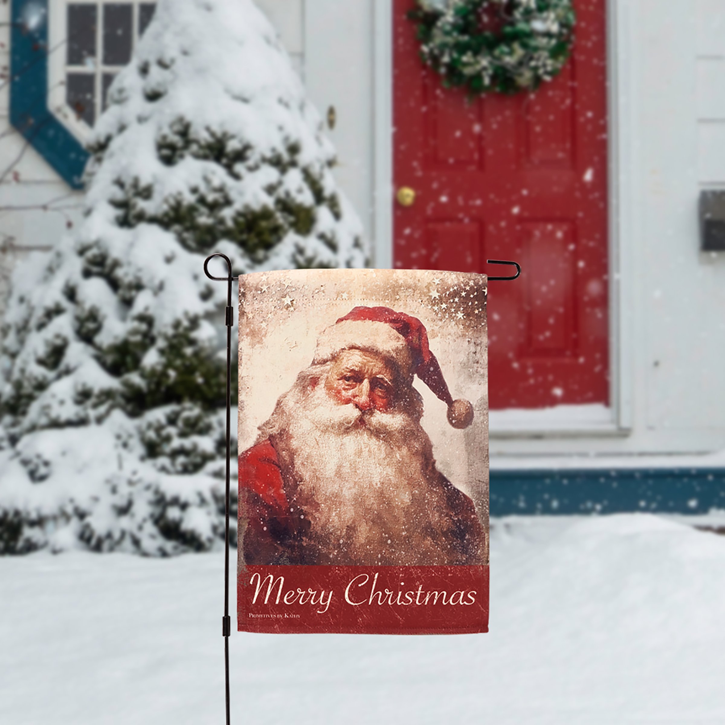 A double-sided polyester garden flag from our Christmas Collection displaying a vintage Santa portrait with textured rustic details and a seasonal sentiment that reads "Merry Christmas." Seasonal garden flag is weather-resistant and features an opening to hang on our Garden Flag Pole. Our Santa's Portrait garden flag is packaged with a header card and hook to easily hang on rack for store display. Hand wash only. A rustic Christmas home accent perfect for seasonal display in any yard or garden.