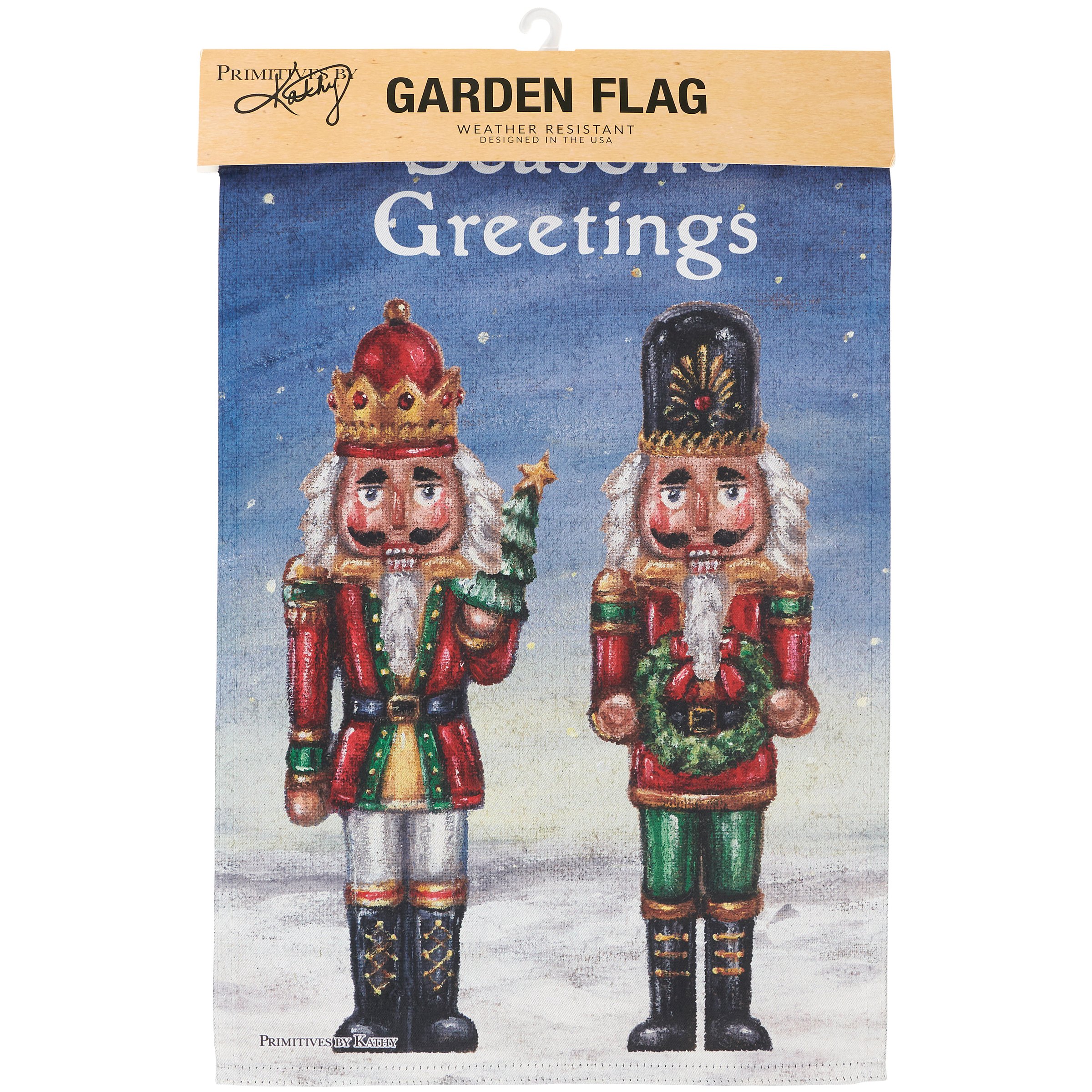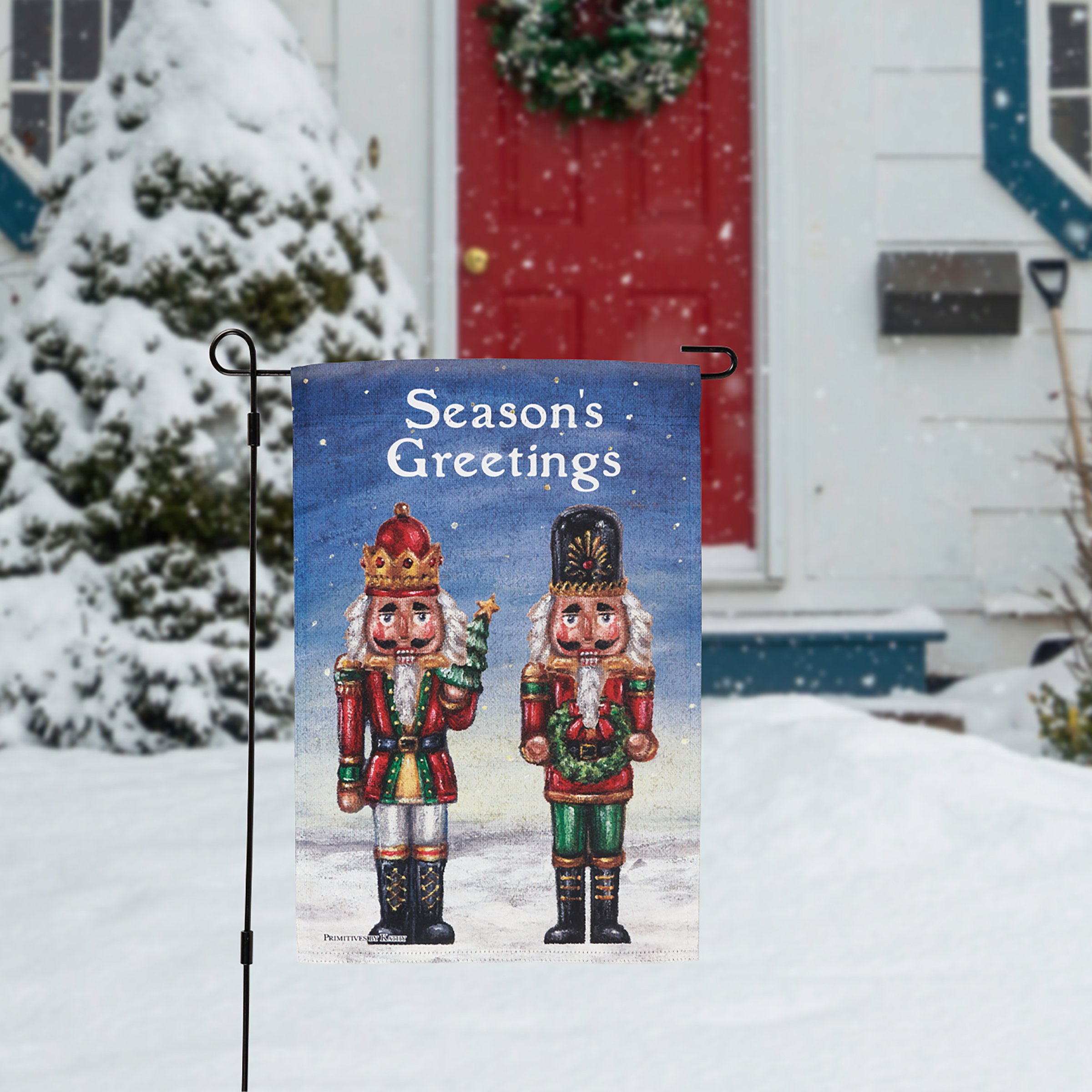 A double-sided polyester garden flag from our Christmas Collection displaying a charming winter scene of nutcrackers with a seasonal sentiment that reads "Season's Greetings." Nutcrackers design is replicated from original artwork painted onto burlap canvas, giving the art a unique depth and texture. Seasonal garden flag is weather-resistant and features an opening to hang on our Garden Flag Pole. Our Season's Greetings garden flag is packaged with a header card and hook to easily hang on rack for store display. Hand wash only. A nutcracker-themed Christmas home accent perfect for seasonal display in any yard or garden.