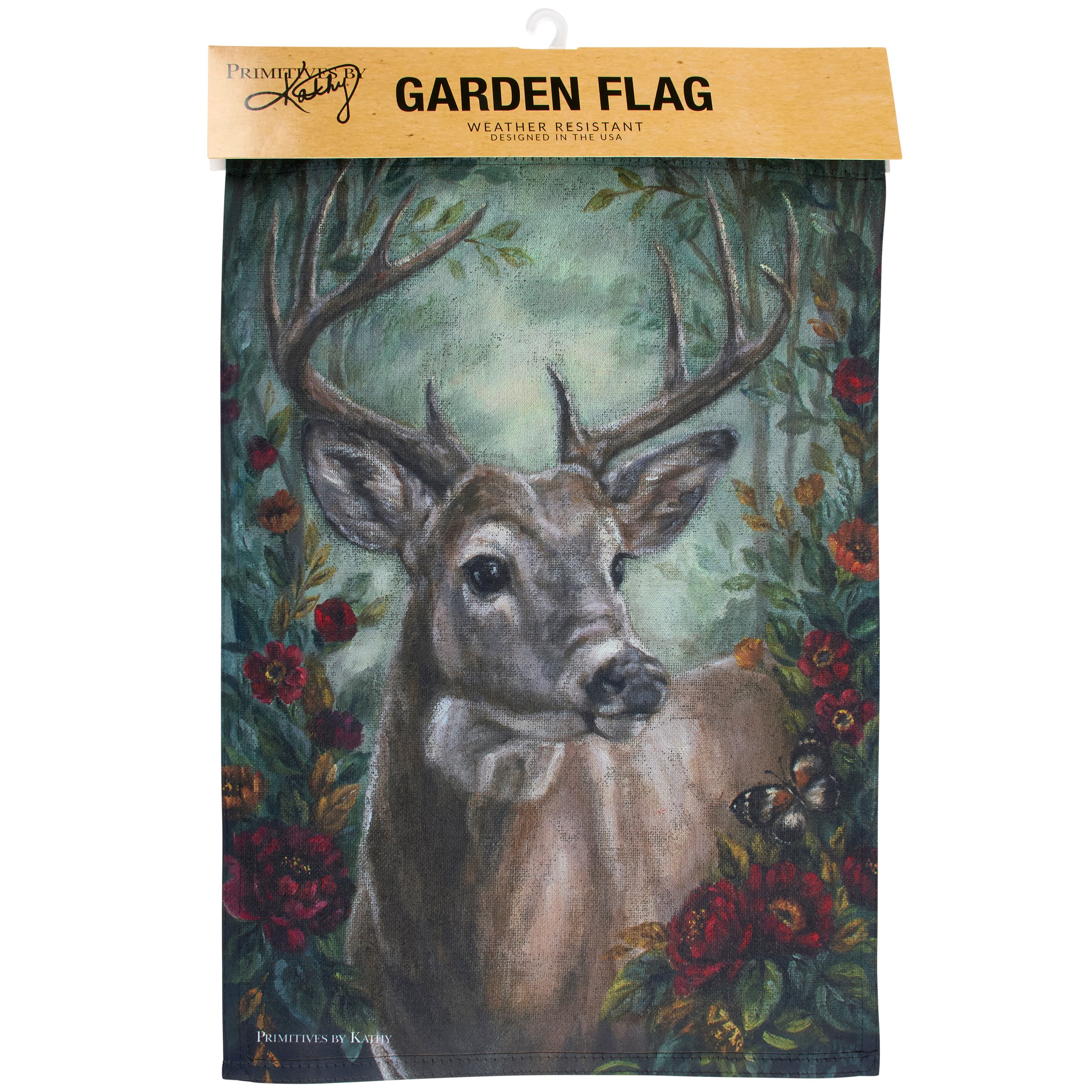 A double-sided polyester garden flag from our Jewel Tone Fall Collection displaying a charming autumn scene of a stag surrounded by fall flowers in a moody color palette. Fall stag design is replicated from original artwork painted onto burlap canvas, giving the art a unique depth and texture. Seasonal garden flag is weather-resistant and features an opening to hang on our Garden Flag Pole. Our Stag garden flag is packaged with a header card and hook to easily hang on rack for store display. Hand wash only. A stylish fall home accent perfect for seasonal display in any yard or garden.