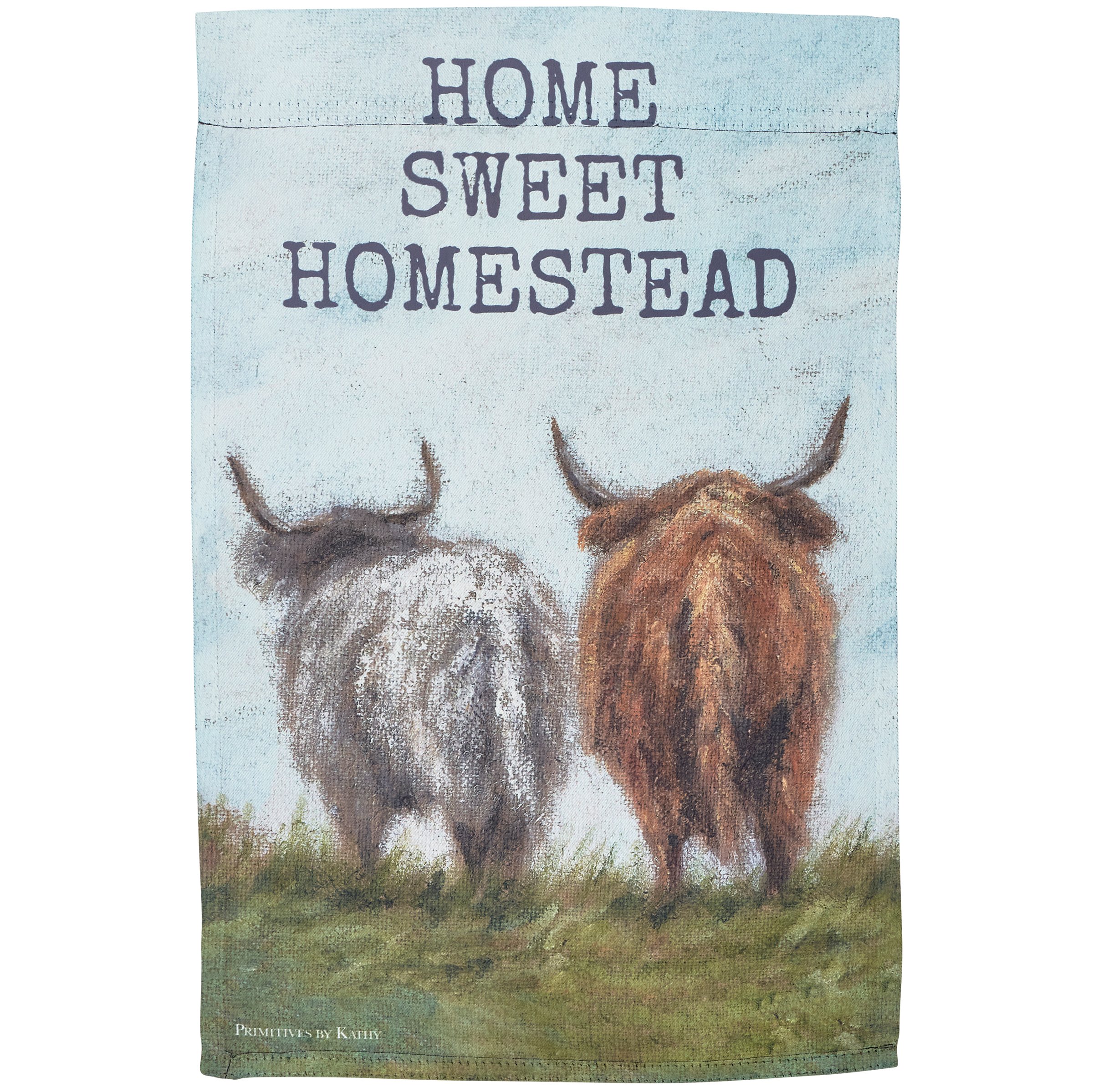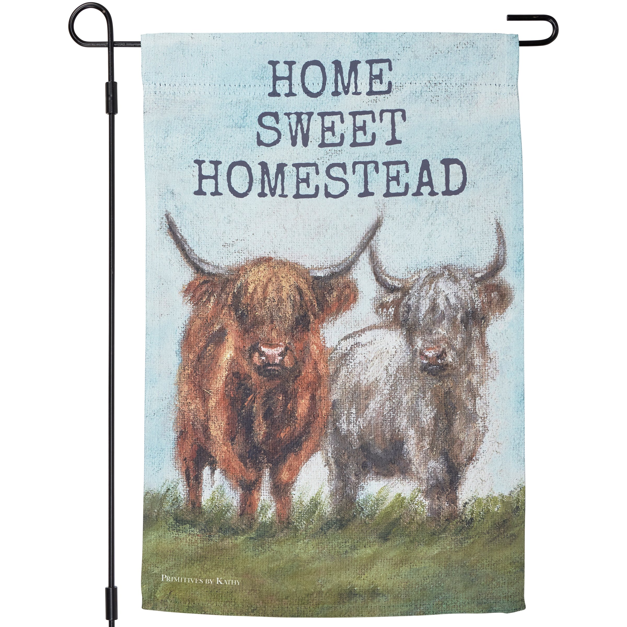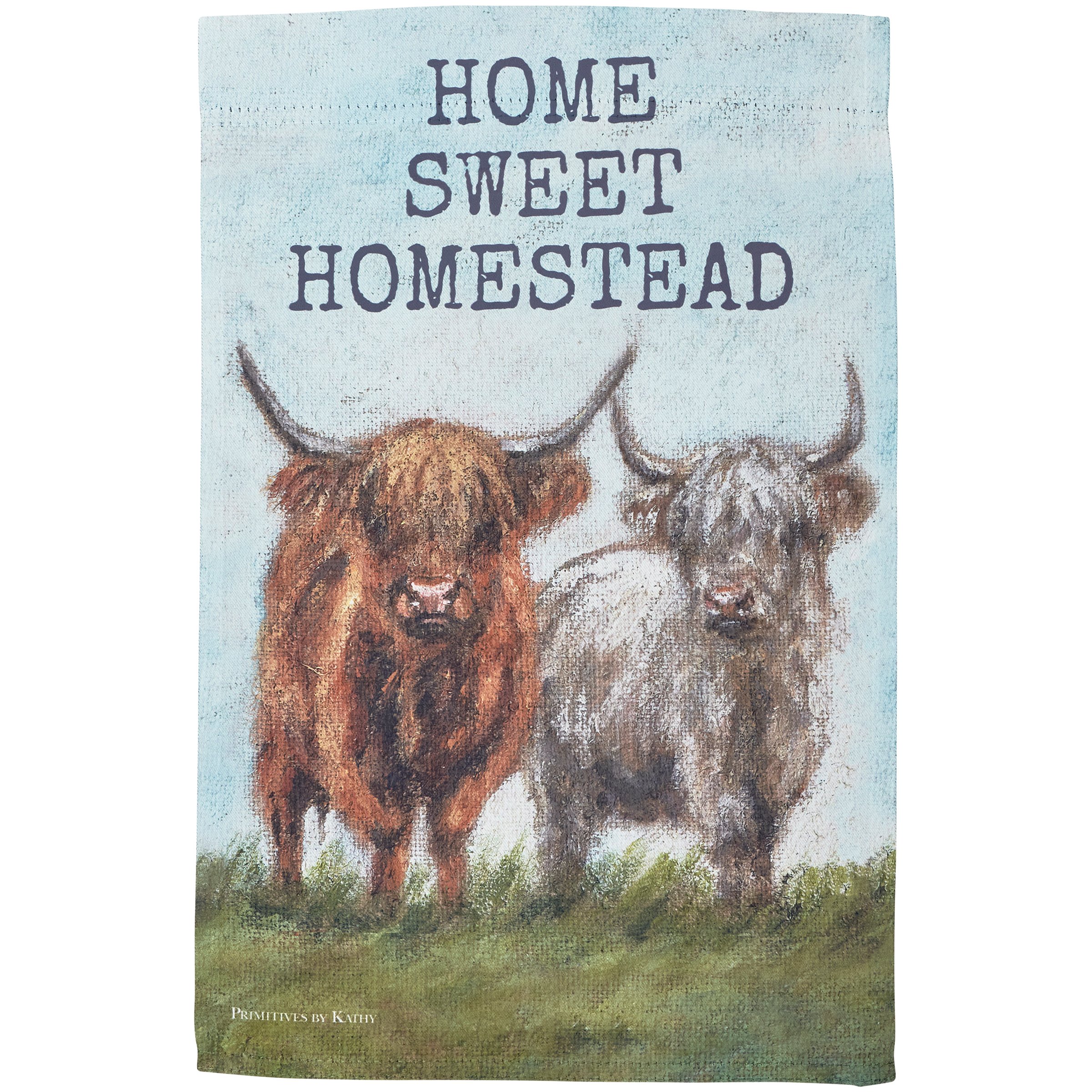 A double-sided polyester garden flag from our Homestead Collection displaying a charming hand painted scene of a brown and a white highland cow in a field with a farm-themed sentiment that reads "Home Sweet Homestead." Design is replicated from original artwork painted onto burlap canvas, giving the art a unique depth and texture. Garden flag is weather-resistant and features an opening to hang on our Garden Flag Pole. Our Home Sweet Homestead garden flag is packaged with a header card and hook to easily hang on rack. Hand wash only. A farm-themed home accent perfect for everyday display in any yard or garden.