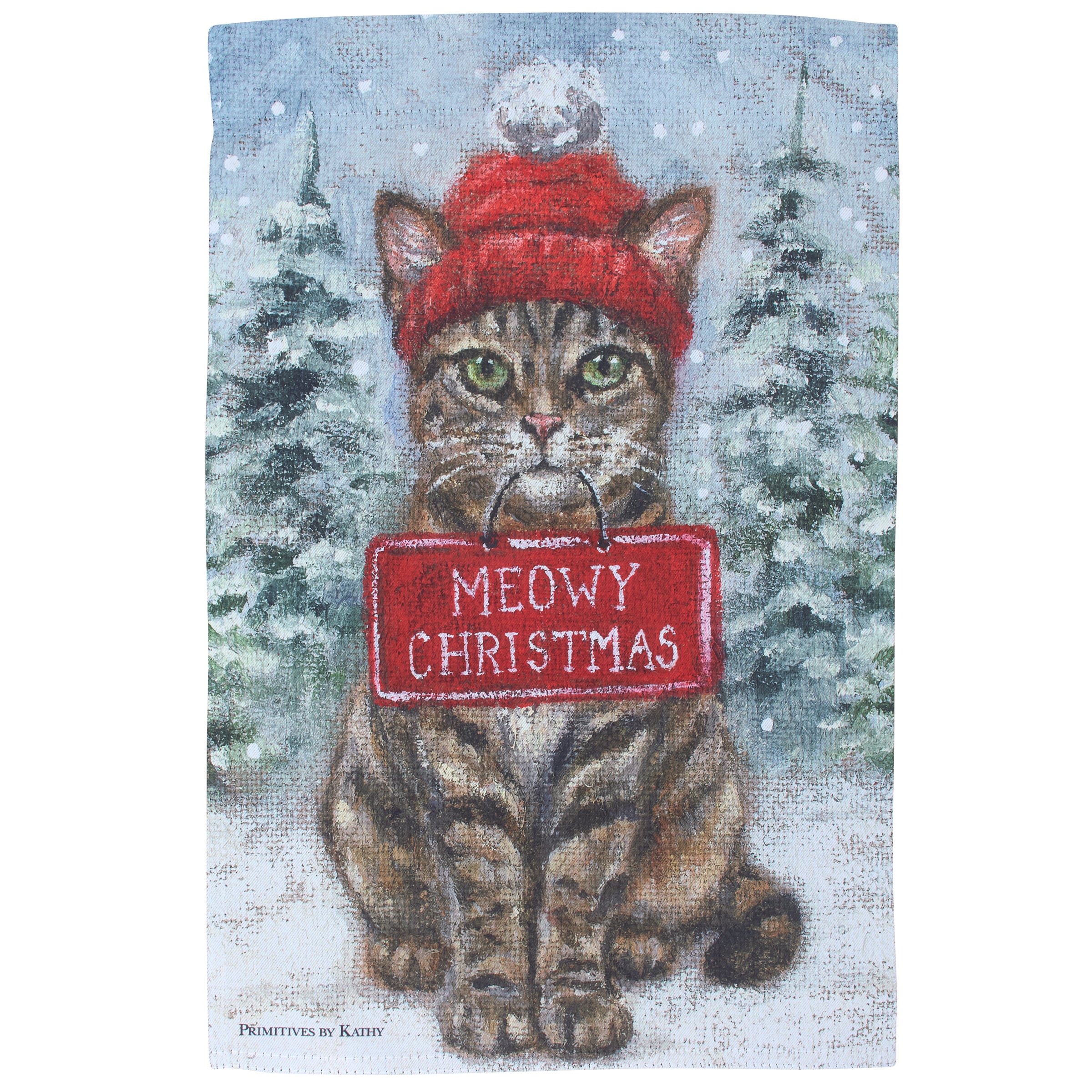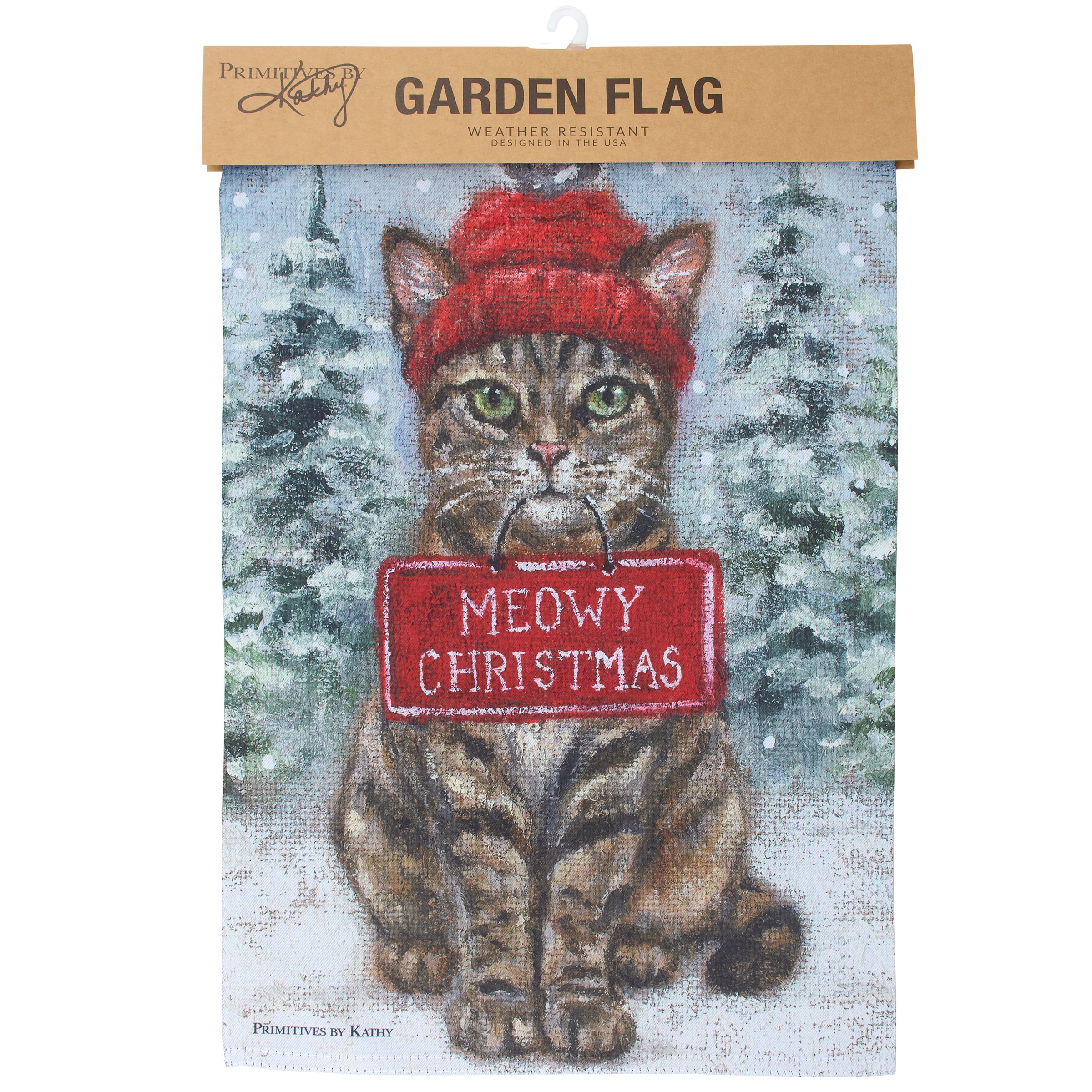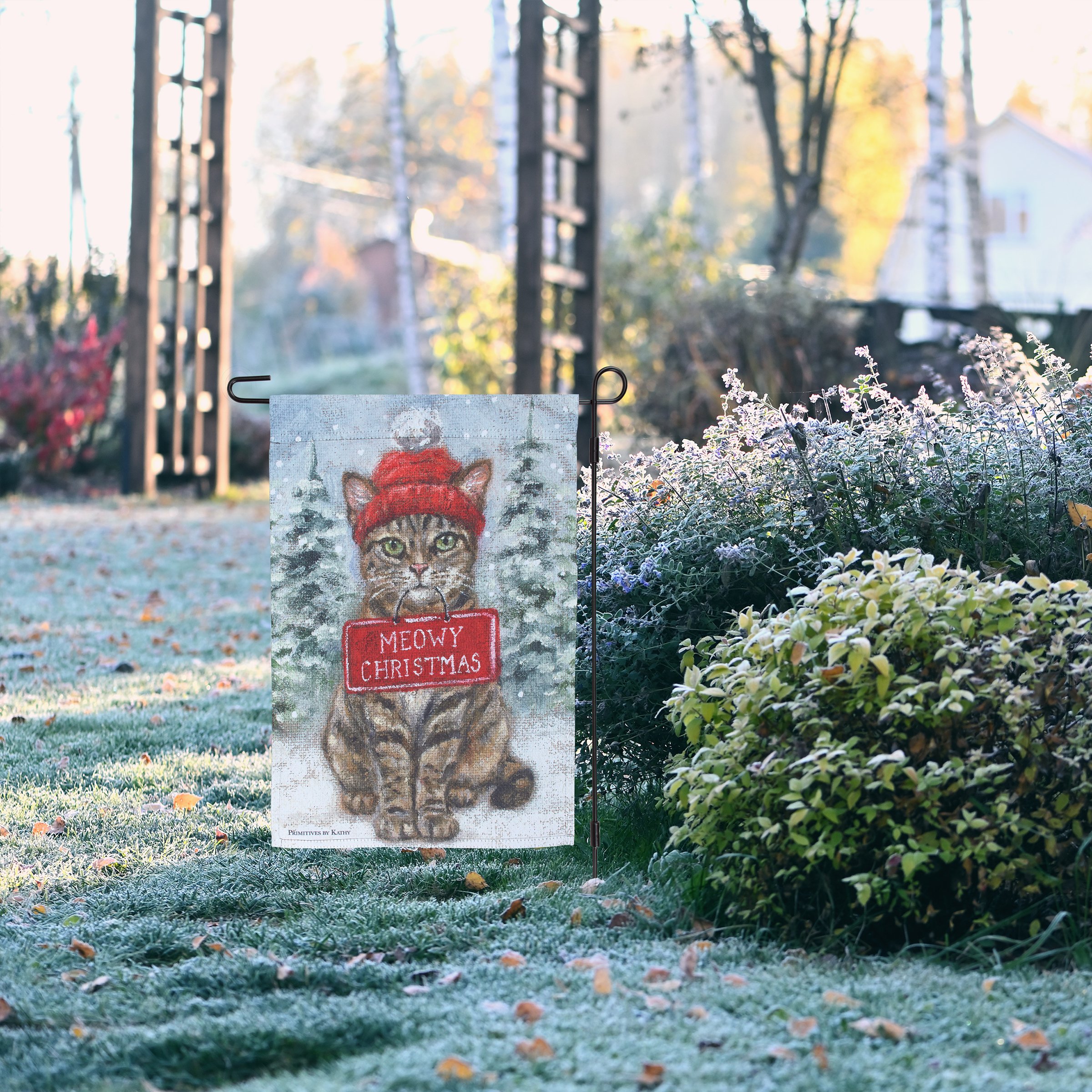 A polyester garden flag from our Holiday Pet Collection/ featuring a double-sided design displaying a charming winter scene of an tabby cat wearing a winter hat and holding a sign that reads "Meowy Christmas" for a fun combination of a love for Christmas and pets. Christmas cat design is replicated from original artwork painted onto burlap canvas, giving the art a unique depth and texture. Seasonal garden flag is weather-resistant and features an opening to hang on our Garden Flag Pole. Hand-wash only. Our Meowy Christmas Tabby Cat garden flag is packaged with a header card and hook to easily hang on rack for store display. A fun cat themed home accent perfect for seasonal display in any yard or garden.
