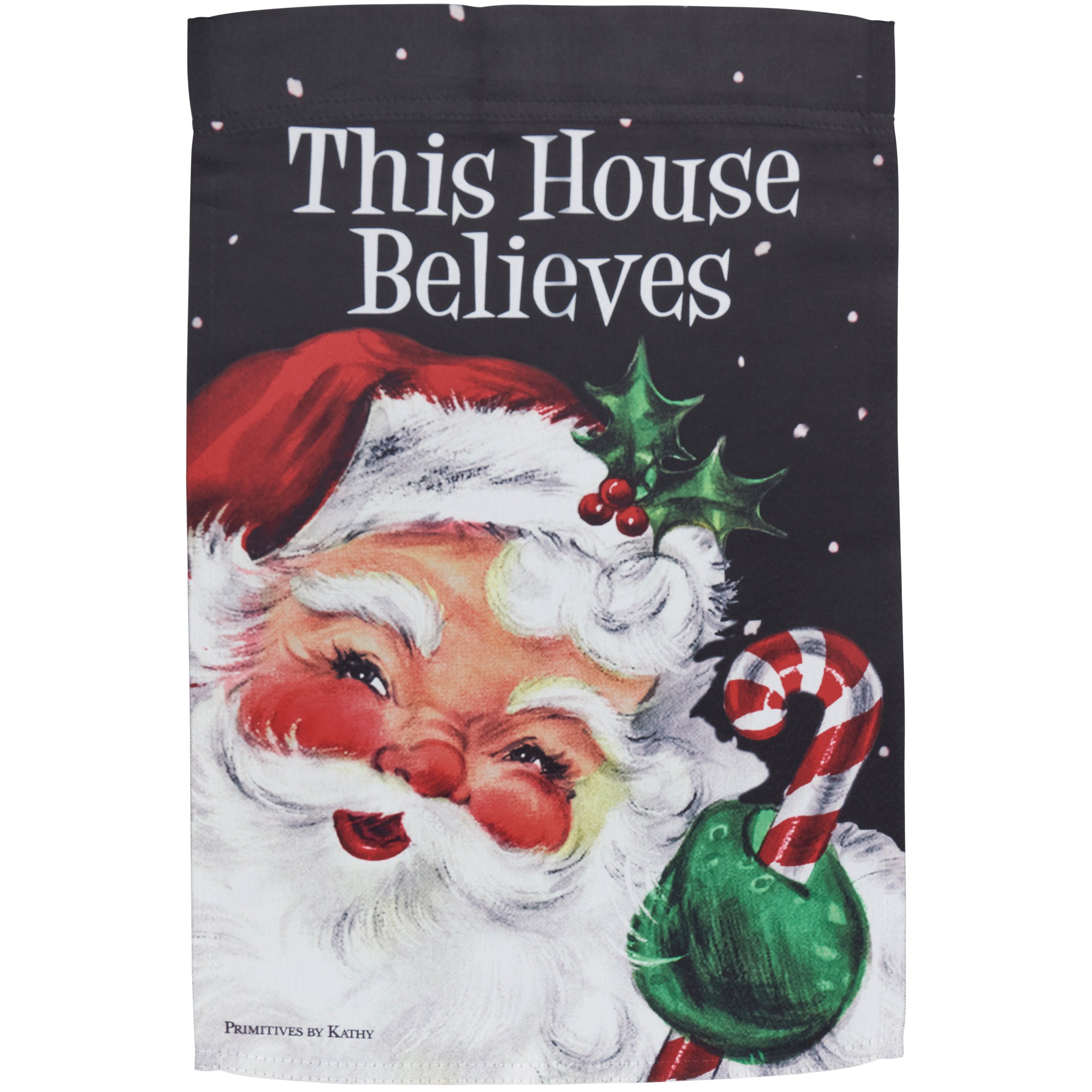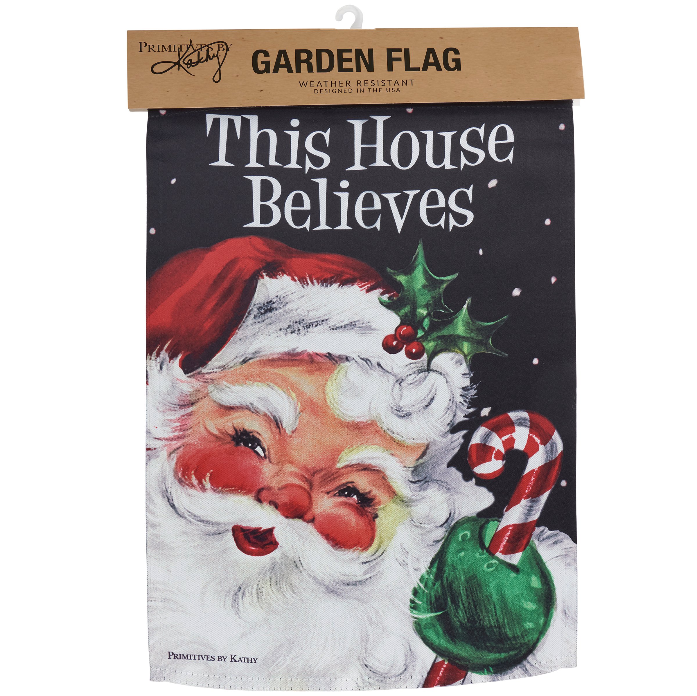 A double-sided polyester garden flag from our Christmas Collection displaying vintage art of a jolly Santa with "This House Believes" sentiment. Flag is weather-resistant and features an opening to hang on our Garden Flag Pole. Hand-wash only. Our This House Believes garden flag is packaged with a header card and hook to easily hang on rack. A fun seasonal home accent perfect for any yard or garden.