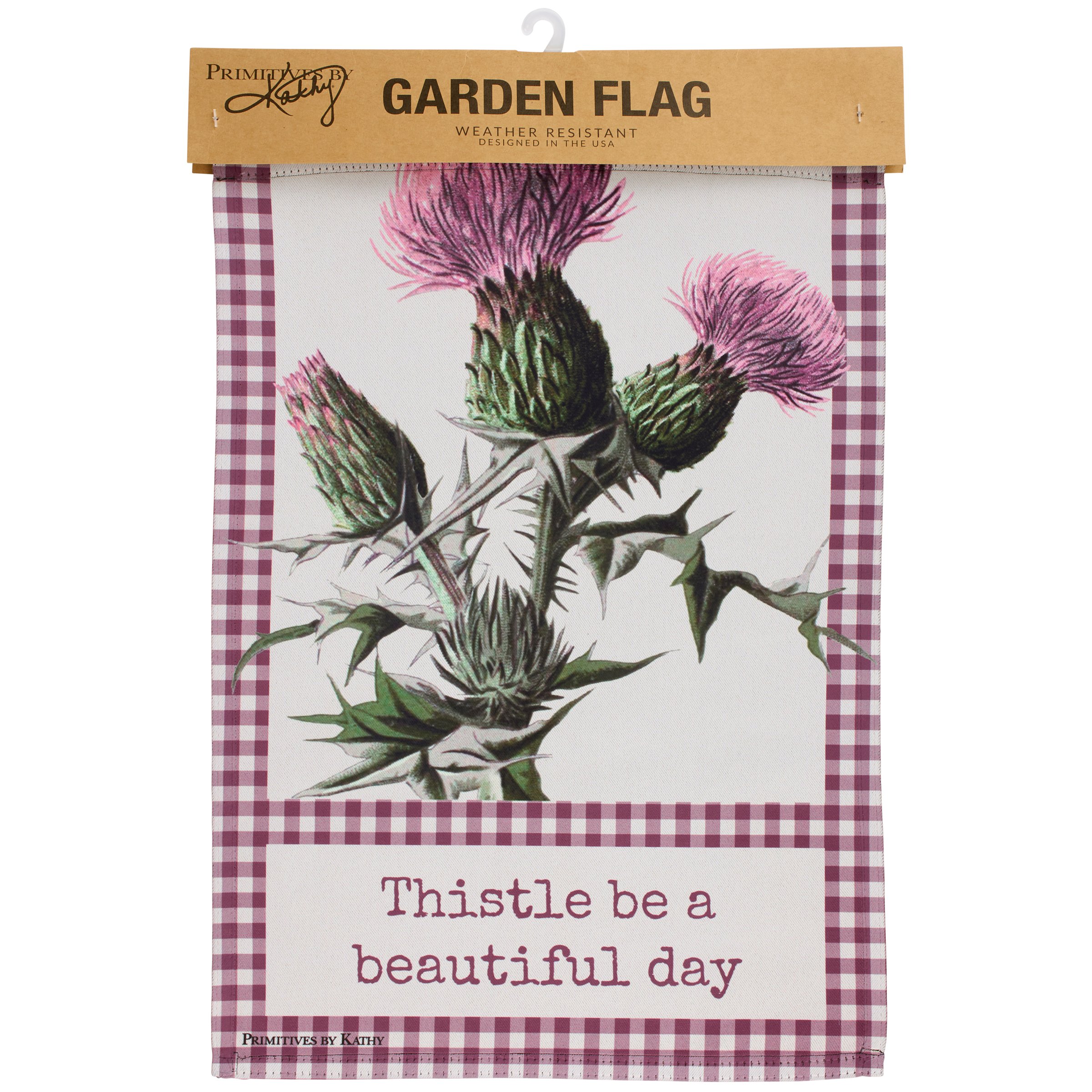 A double-sided polyester garden flag from our Garden Collection displaying vintage art of a thistle with a purple gingham border and a fun flower-themed pun that reads "Thistle Be A Beautiful Day." Thistle garden flag is weather-resistant and features an opening to hang on our Garden Flag Pole. Hand-wash only. Our Thistle Be A Beautiful Day garden flag is packaged with a header card and hook to easily hang on rack for store display. A fun garden-themed home accent perfect for everyday display in any yard or garden.