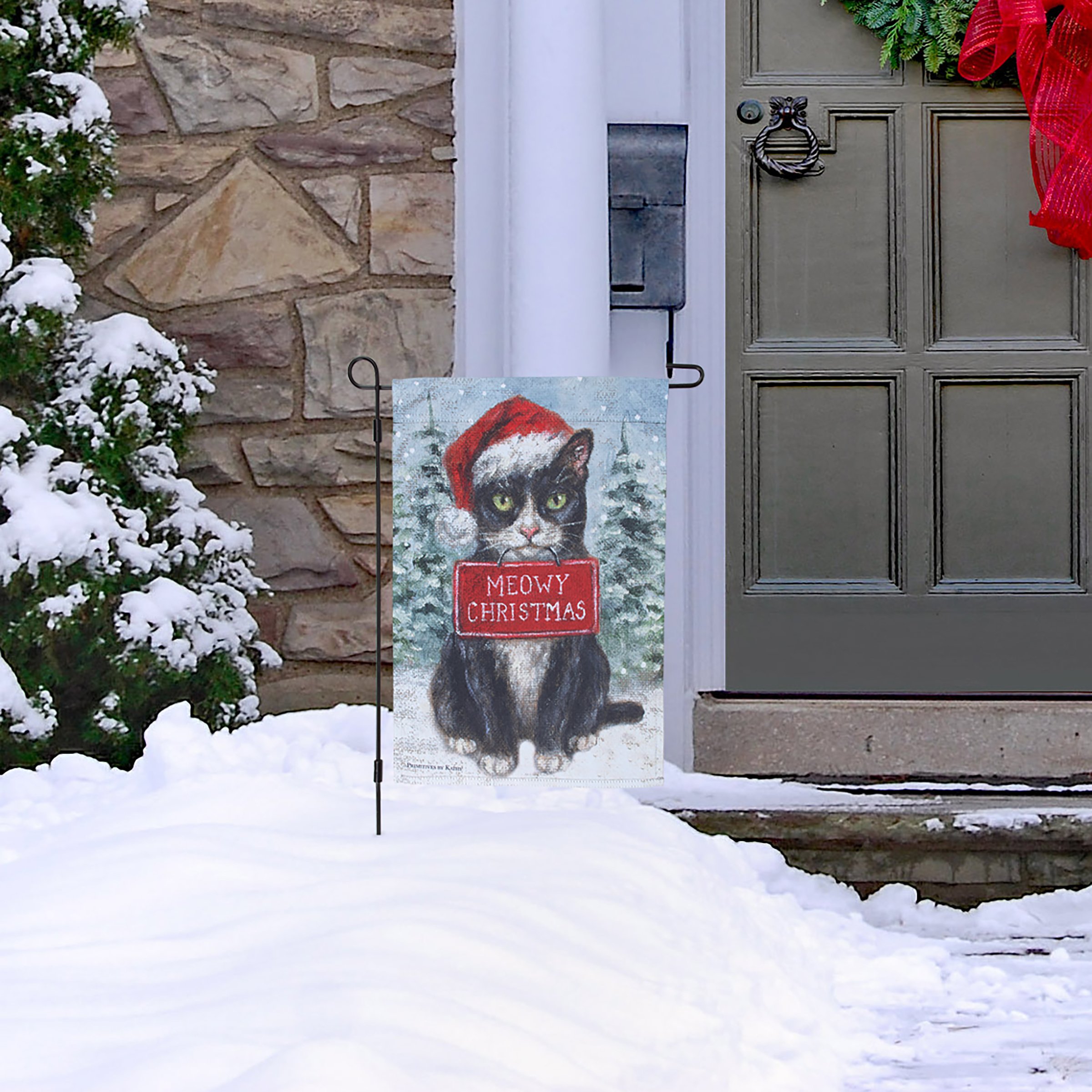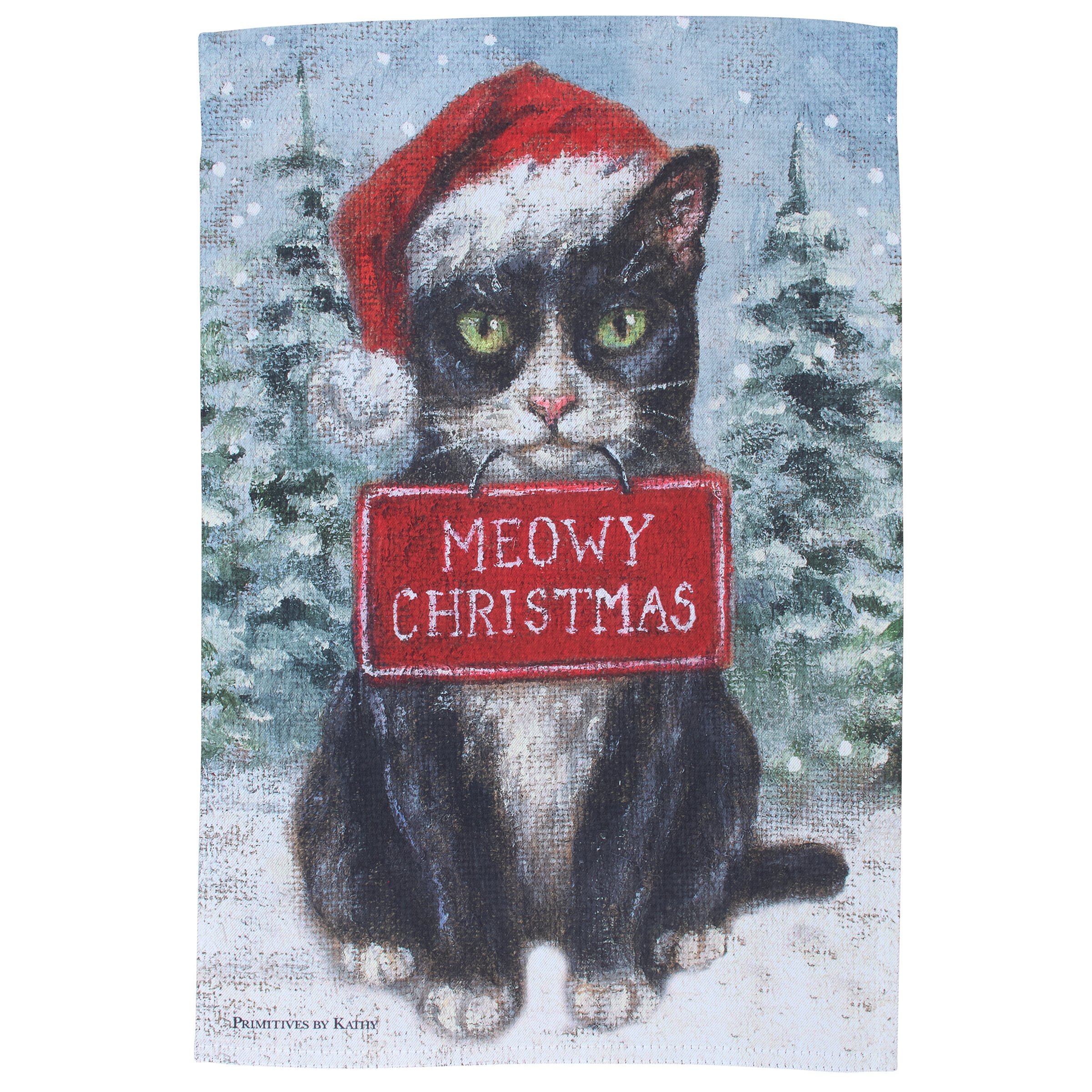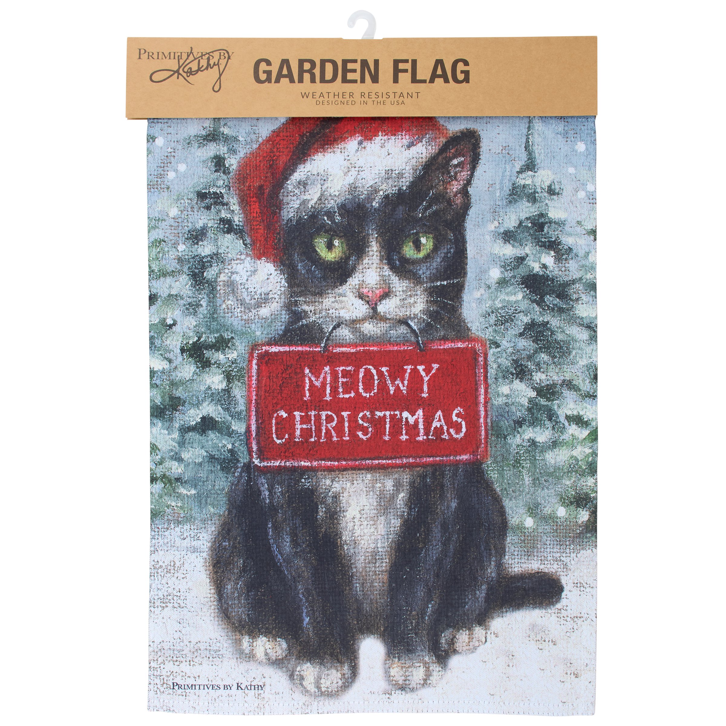 A polyester garden flag from our Holiday Pet Collection/ featuring a double-sided design displaying a charming winter scene of a tuxedo cat wearing a Santa hat and holding a sign that reads "Meowy Christmas" for a fun combination of a love for Christmas and pets. Christmas cat design is replicated from original artwork painted onto burlap canvas, giving the art a unique depth and texture. Seasonal garden flag is weather-resistant and features an opening to hang on our Garden Flag Pole. Hand-wash only. Our Meowy Christmas Tuxedo Cat garden flag is packaged with a header card and hook to easily hang on rack for store display. A fun cat themed home accent perfect for seasonal display in any yard or garden.