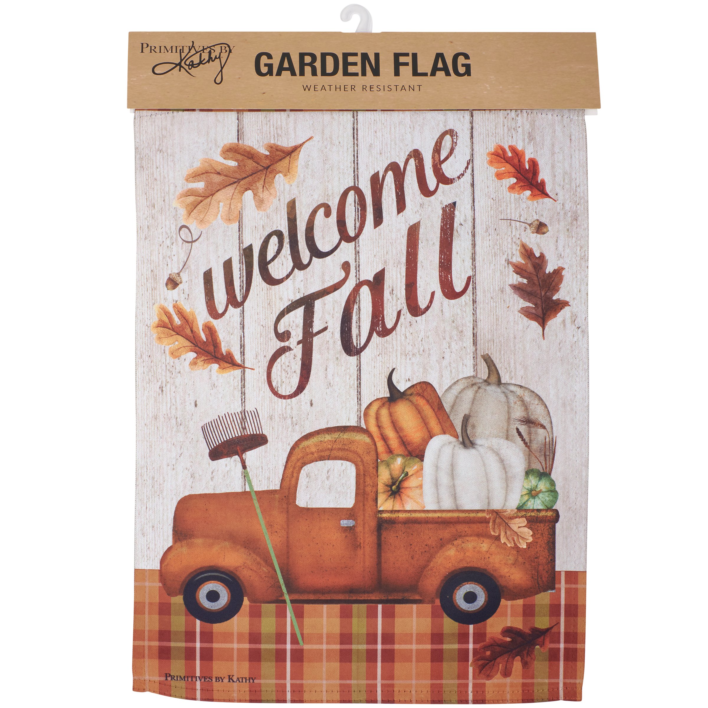 A double-sided polyester garden flag from our Fall & Harvest Collection displaying a vintage design of orange pickup hauling a variety of pumpkins with "Welcome Fall" sentiment. Our garden flags are weather-resistant and feature an opening to hang on ourĀ Garden Flag Pole. Hand-wash only. The Welcome Fall garden flag is packaged with a header card and hook to hang on rack.
