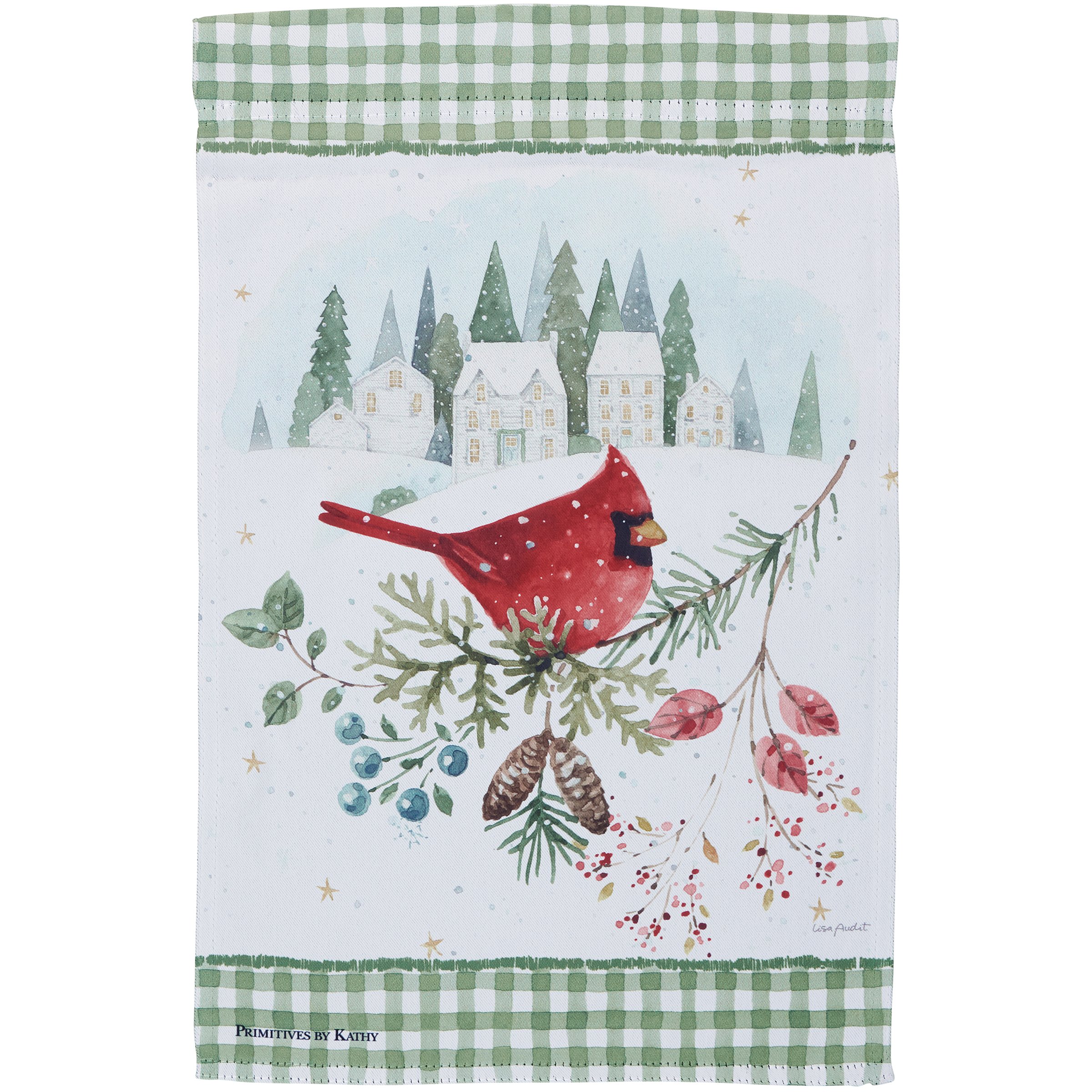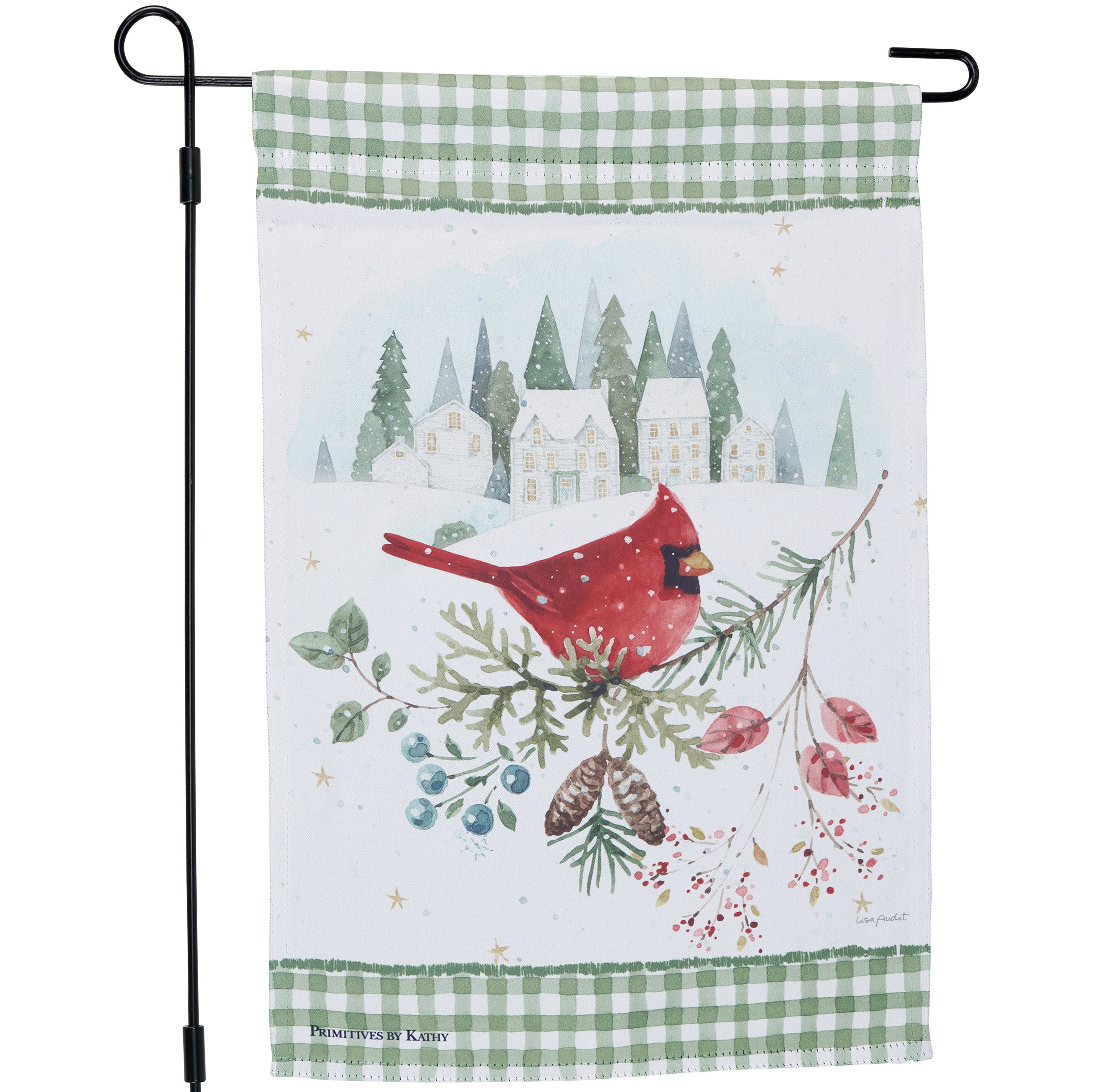 A double-sided polyester garden flag from our Christmas Collection displaying a charming scene of a cardinal on a winter tree branch. Design also features coordinating green gingham patterns at the top and bottom. Flag design is replicated from original art hand painted in a delicate watercolor style. Seasonal garden flag is weather-resistant and features an opening to hang on our Garden Flag Pole. Our Winter Cardinal garden flag is packaged with a header card and hook to easily hang on rack. Hand wash only. A charming winter-themed home accent perfect for seasonal display in any yard or garden.
