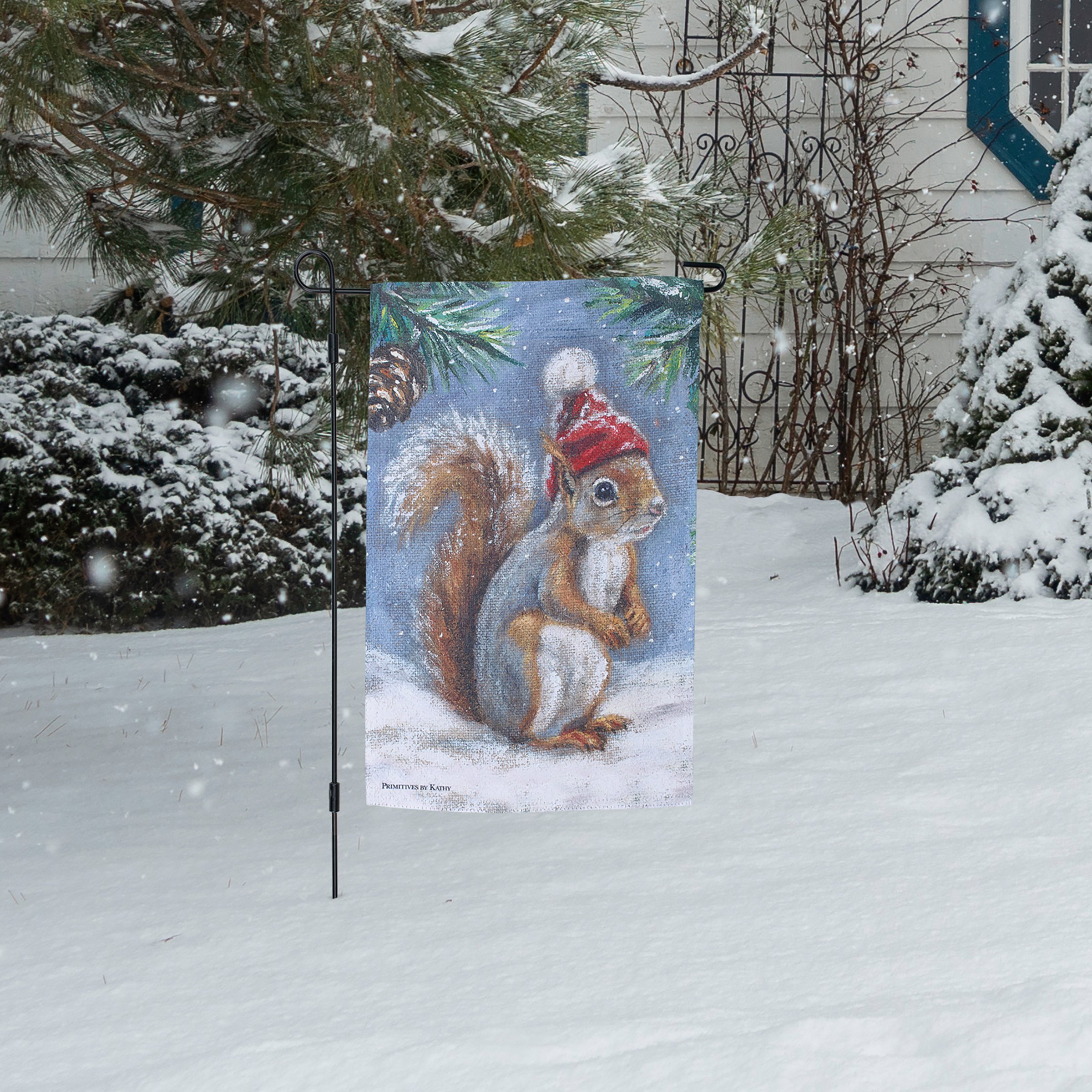 A polyester garden flag from our Christmas Collection featuring a double-sided design displaying a charming winter scene of a squirrel wearing a winter hat. Winter squirrel design is replicated from original artwork painted onto burlap canvas, giving the art a unique depth and texture. Seasonal garden flag is weather-resistant and features an opening to hang on our Garden Flag Pole. Hand-wash only. Our Winter Squirrel garden flag is packaged with a header card and hook to easily hang on rack for store display. A rustic nature themed home accent perfect for seasonal display in any yard or garden.