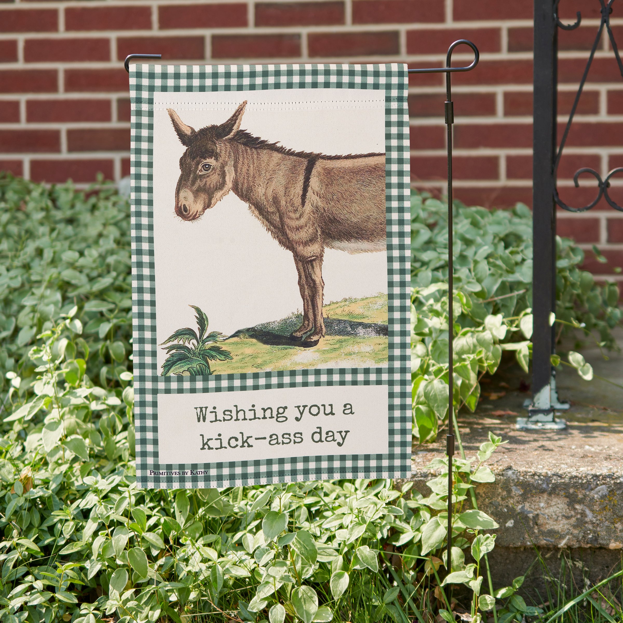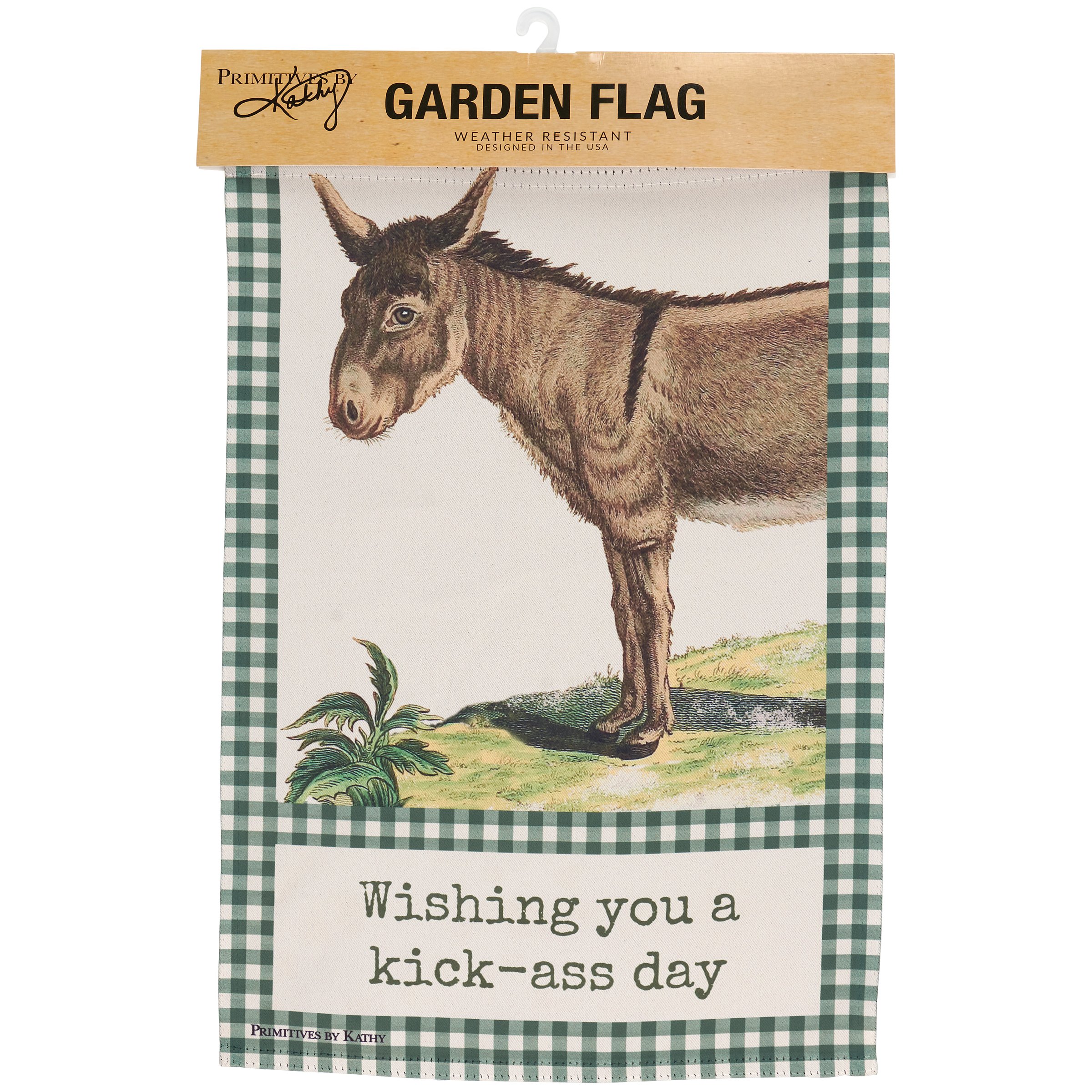 A double-sided polyester garden flag from our Farmhouse Collection displaying a vintage donkey design with green gingham borders. Design features coordinating punny sentiment that reads "Wishing You A Kick-Ass Day." Garden flag is weather-resistant and features an opening to hang on our Garden Flag Pole. Our Wishing You garden flag is packaged with a header card and hook to easily hang on rack. Hand-wash only. A fun farm-themed home accent perfect for everyday display in any yard or garden.