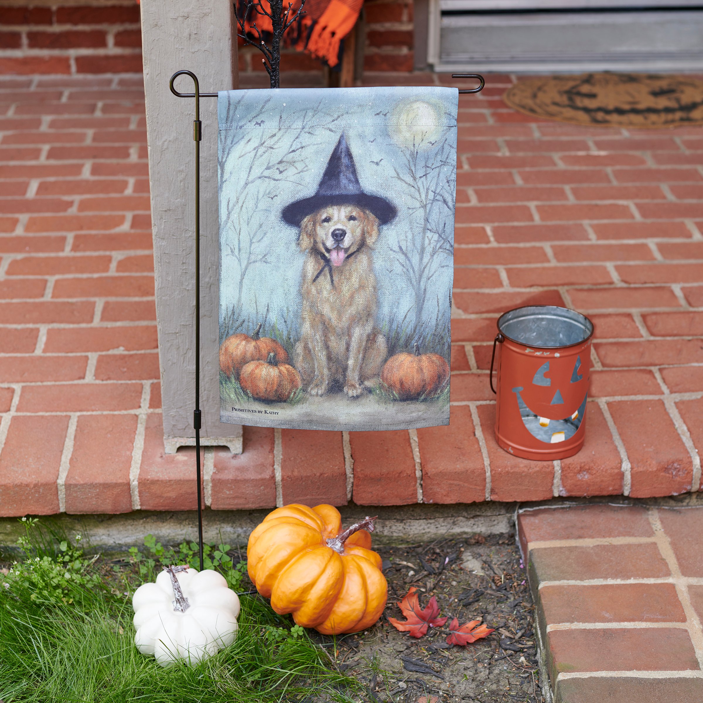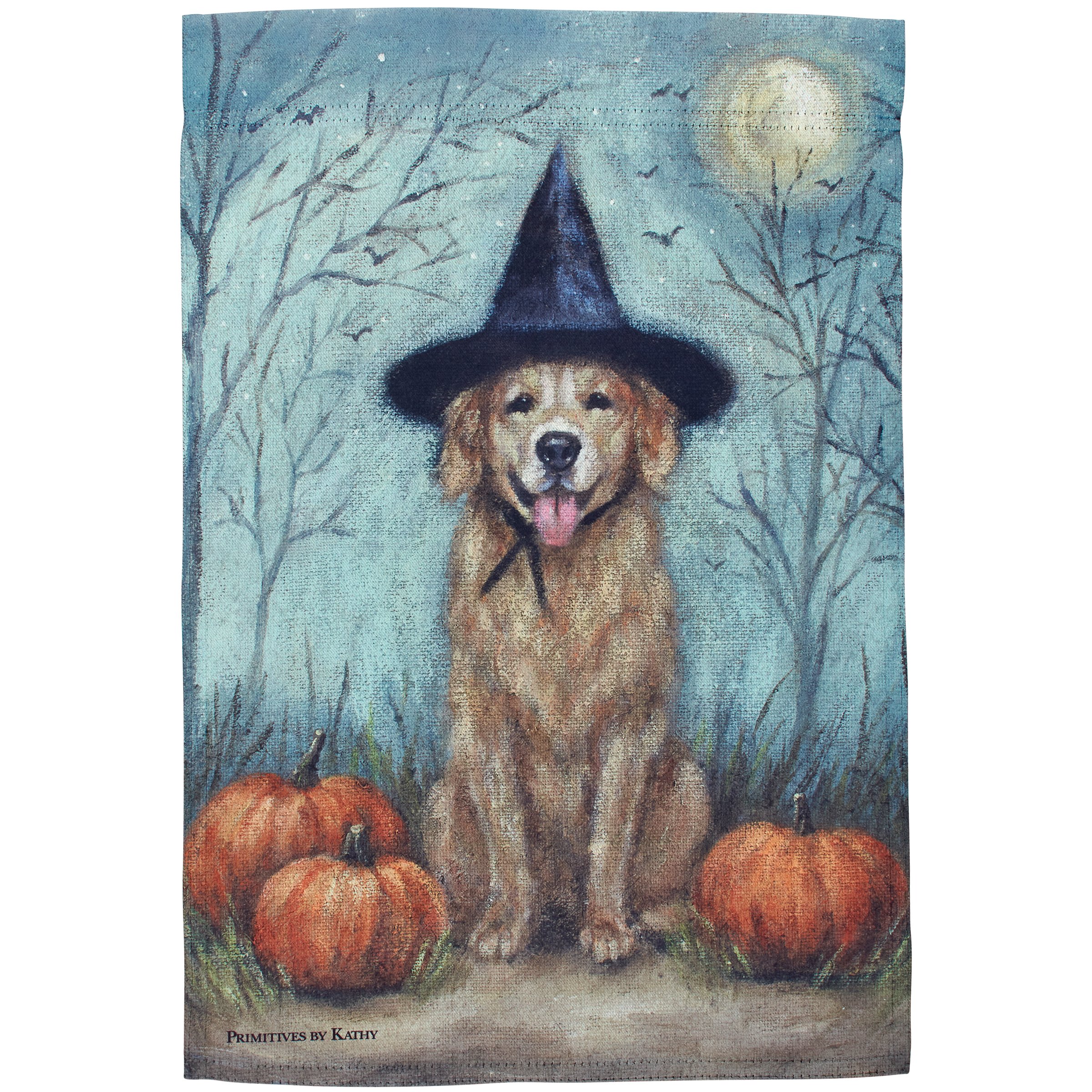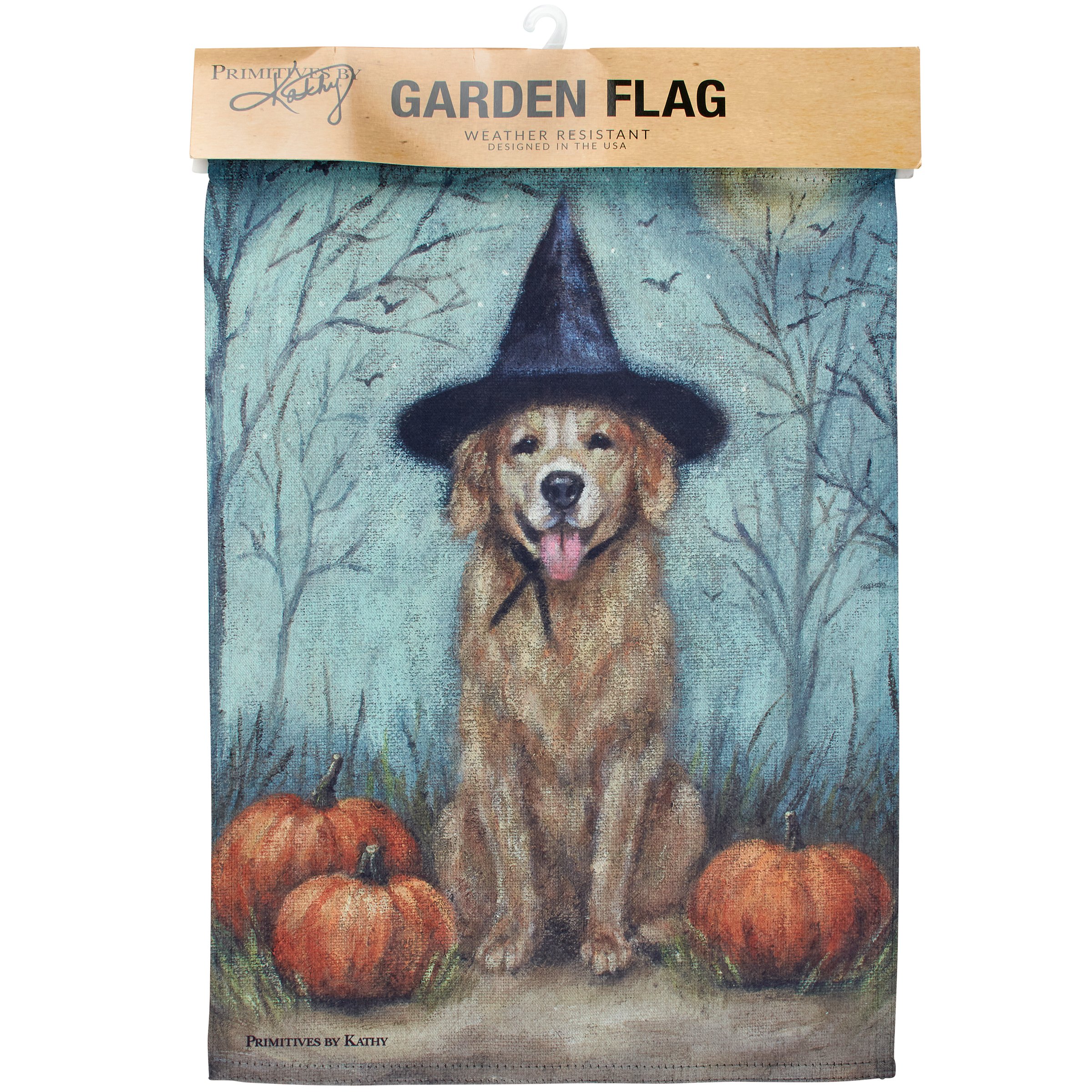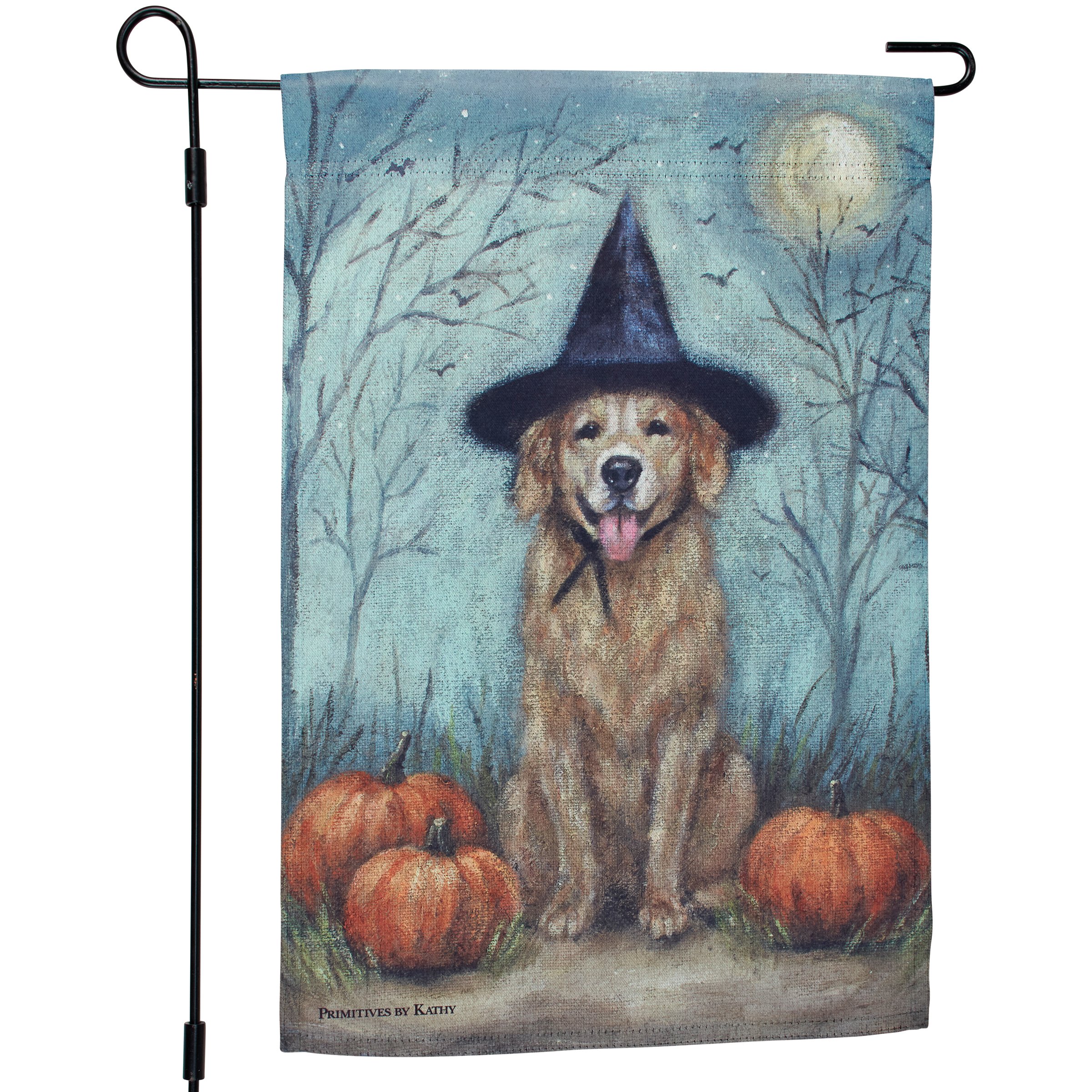 A double-sided polyester garden flag from our Halloween Collection displaying a charming hand painted design of a dog wearing a witch hat sitting next to pumpkins. Design is replicated from original artwork painted onto burlap canvas, giving the art a unique depth and texture. Flag is weather-resistant and features an opening to hang on ourĀ Garden Flag Pole. Hand-wash only. Our Witch Dog garden flag is packaged with a header card and hook to easily hang on rack. A rustic seasonal home accent perfect for any yard or garden.