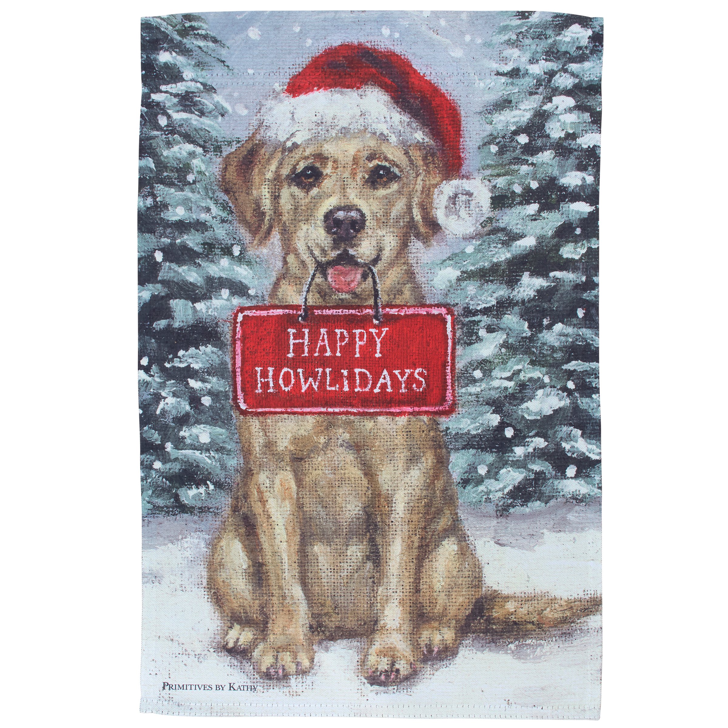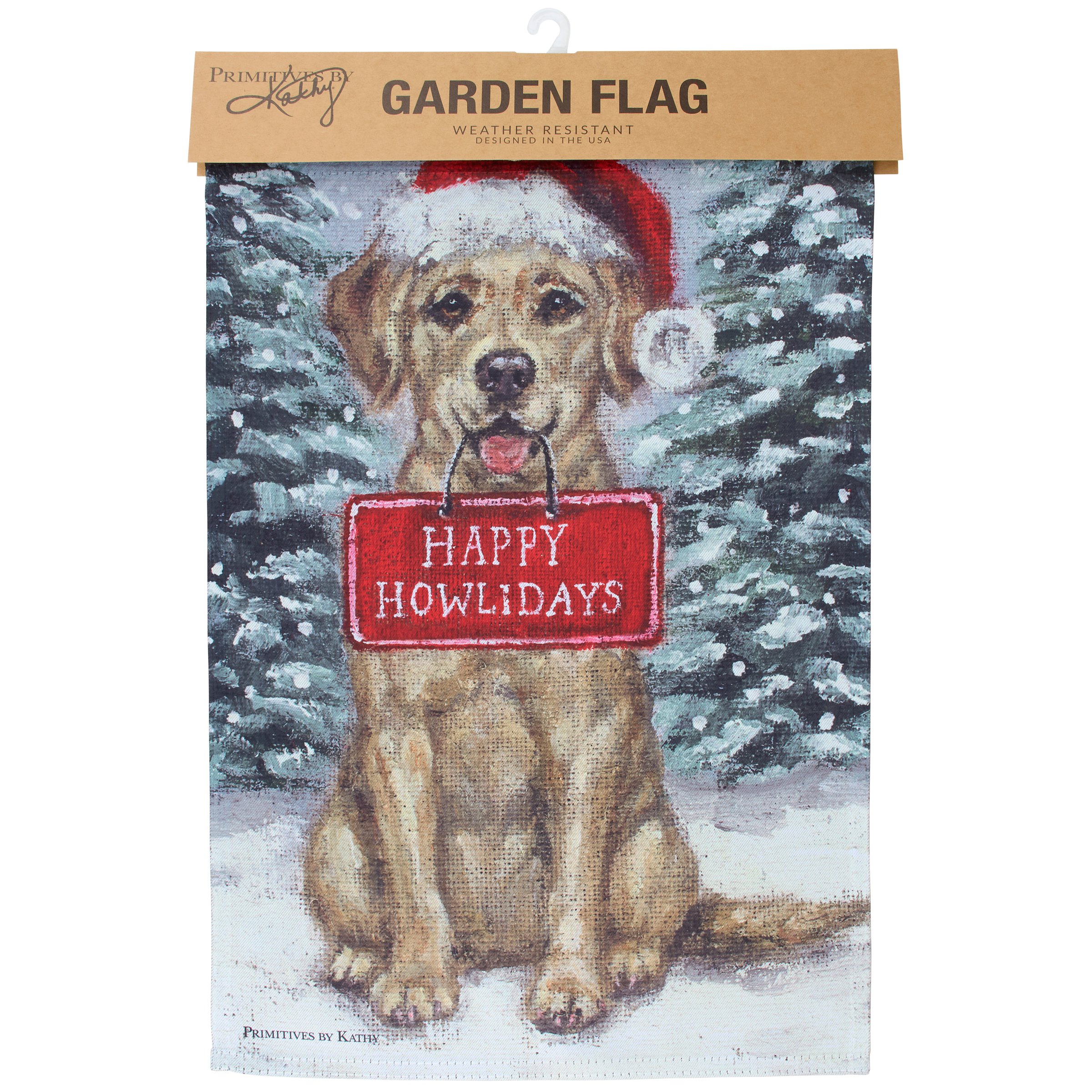 A polyester garden flag from our Holiday Pet Collection/ featuring a double-sided design displaying a charming winter scene of a Yellow Labrador wearing a Santa hat and holding a sign that reads "Happy Howlidays" for a fun combination of a love for Christmas and pets. Christmas Yellow Labrador design is replicated from original artwork painted onto burlap canvas, giving the art a unique depth and texture. Seasonal garden flag is weather-resistant and features an opening to hang on our Garden Flag Pole. Hand-wash only. Our Yellow Lab Happy Howlidays garden flag is packaged with a header card and hook to easily hang on rack for store display. A fun dog themed home accent perfect for seasonal display in any yard or garden.