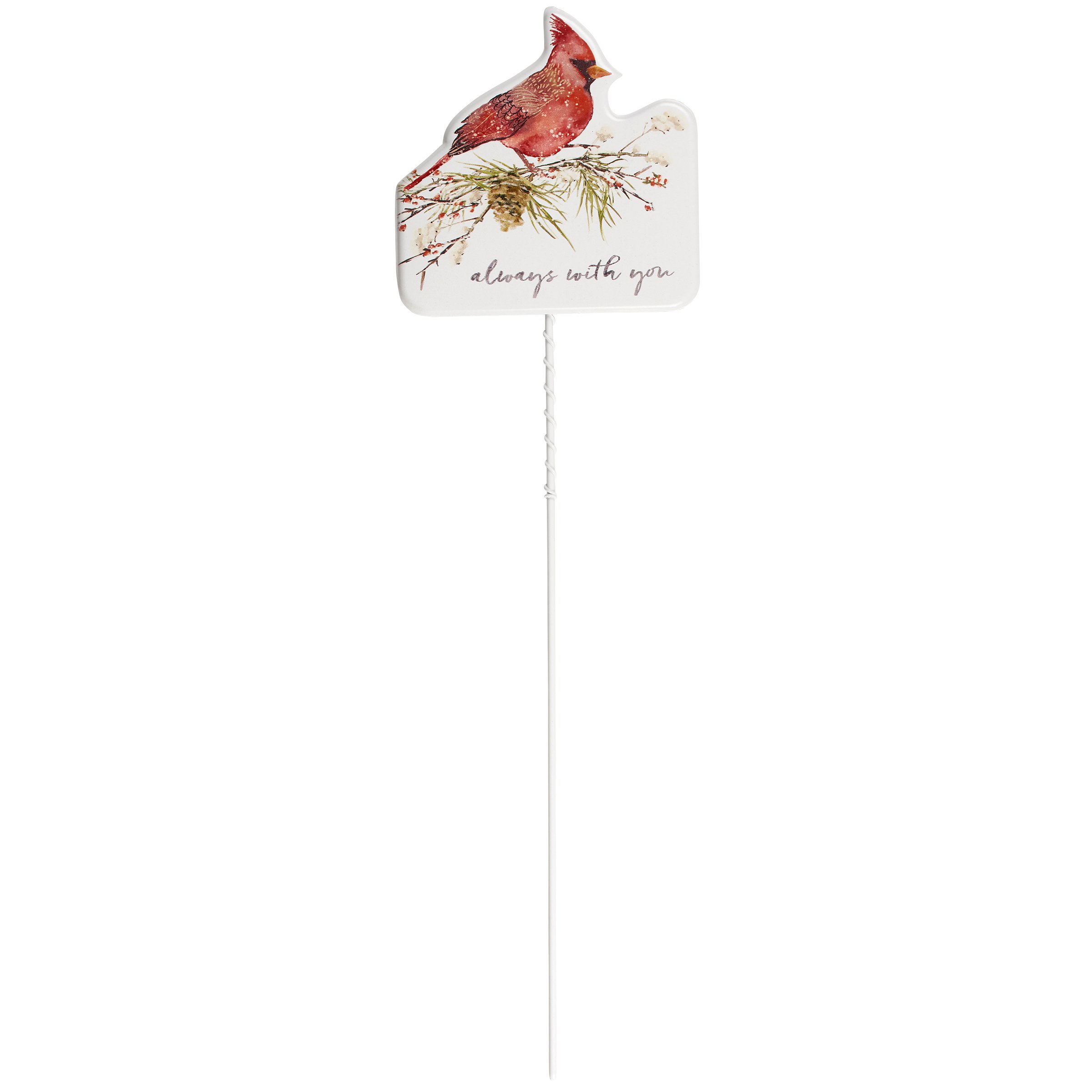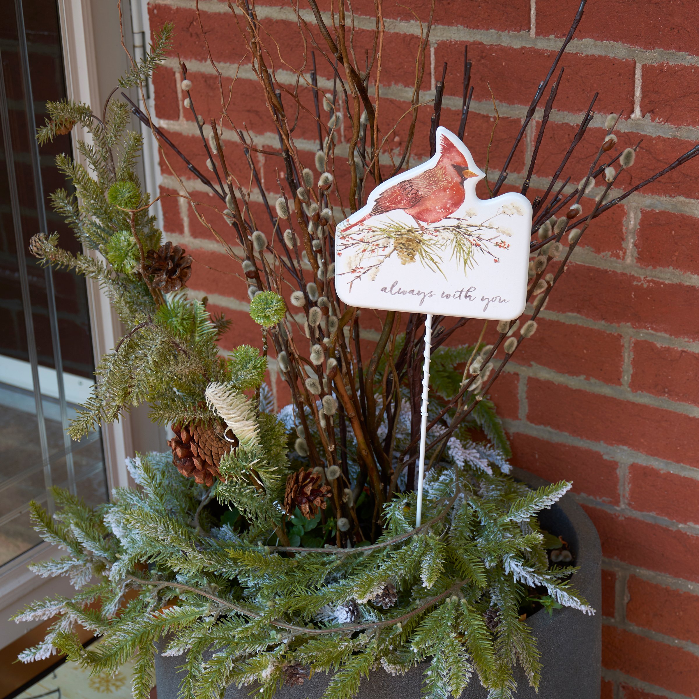A metal pick from our Christmas Collection displaying a hand painted design in the shape of a cardinal on a winter branch in a watercolor style above a heartwarming sentiment that reads "Always With You." Design is attached to a coordinating white stake. Our Always With You garden pick includes a long stake to easily stand out above a garden or decorative vessel. An inspirational outdoor accent perfect for seasonal display.