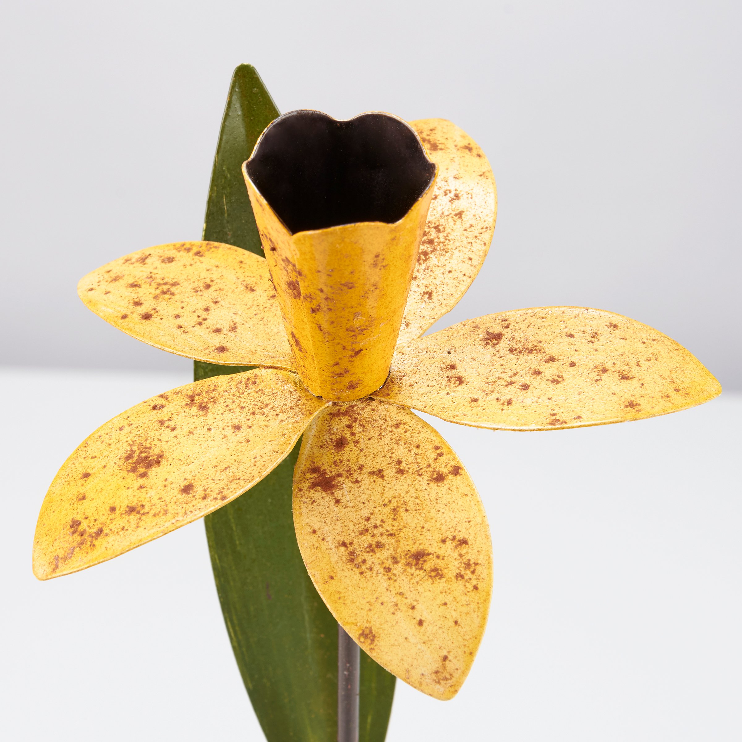 A decorative pick from our Garden Collection displaying a rustic daffodil design made with sculpted metal pieces attached to a metal stake. Pick features leaf accent and distressed details for added texture. Our Daffodil garden pick includes a 16 inch stake to easily stand out in a garden or decorative vessel. A primitive outdoor accent perfect for seasonal display.