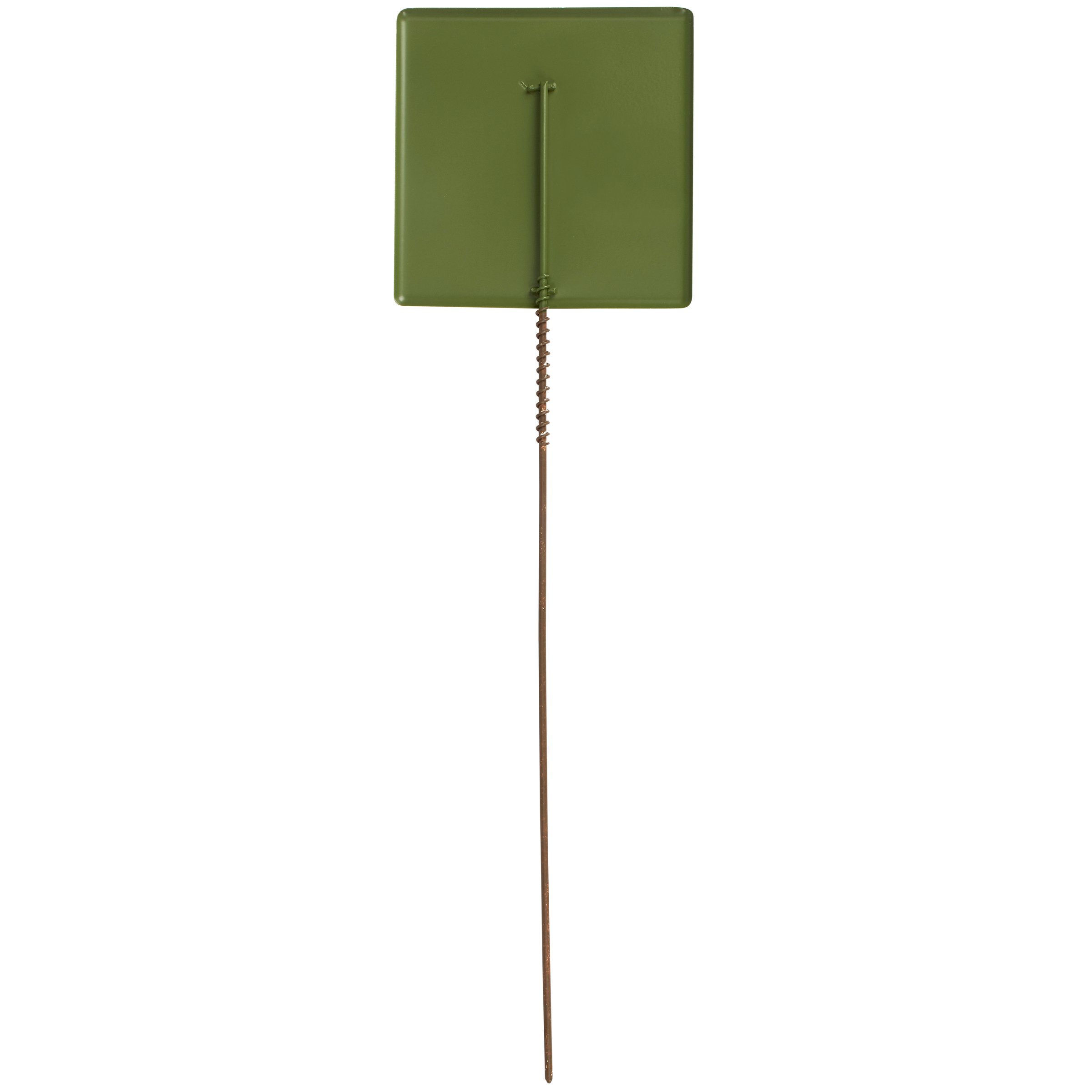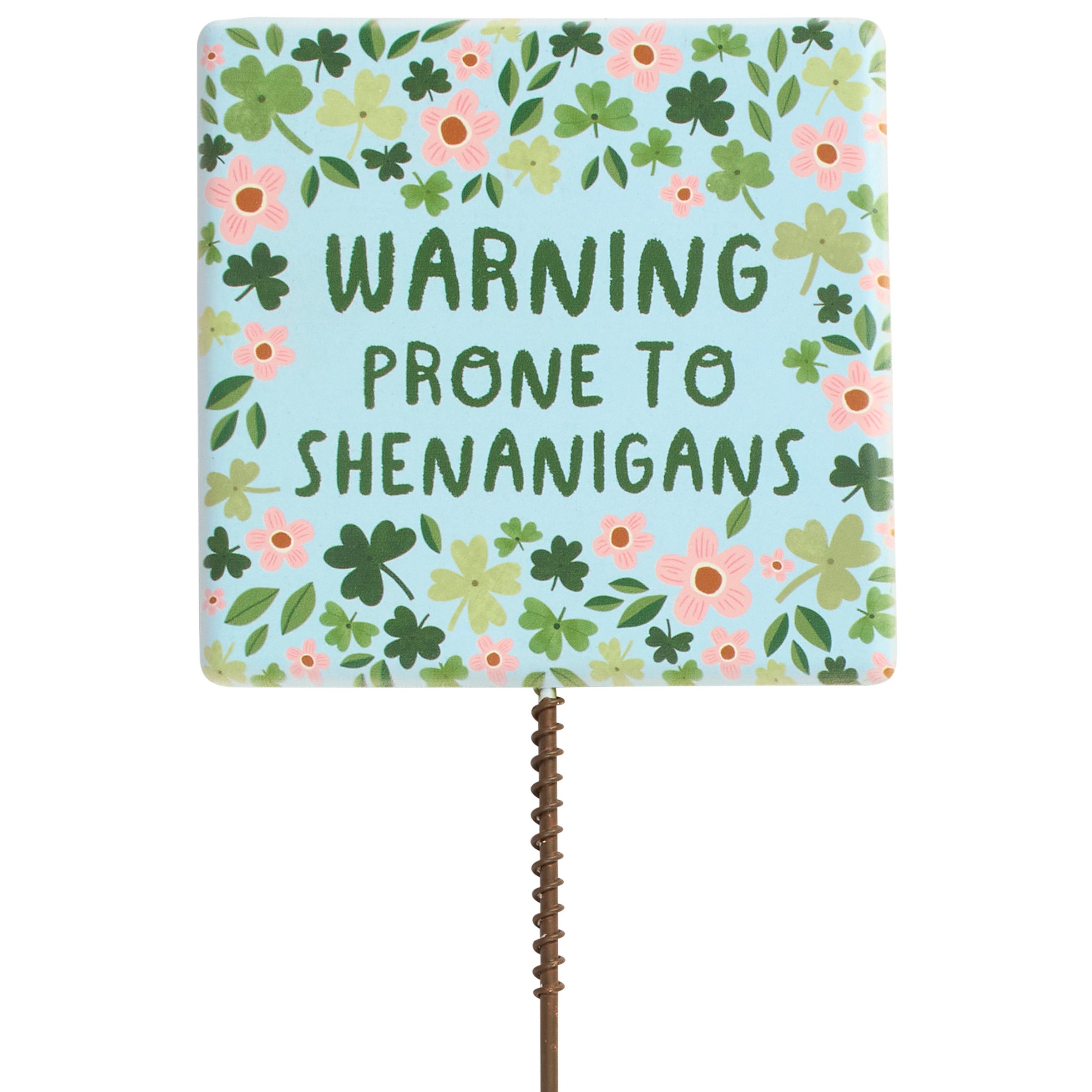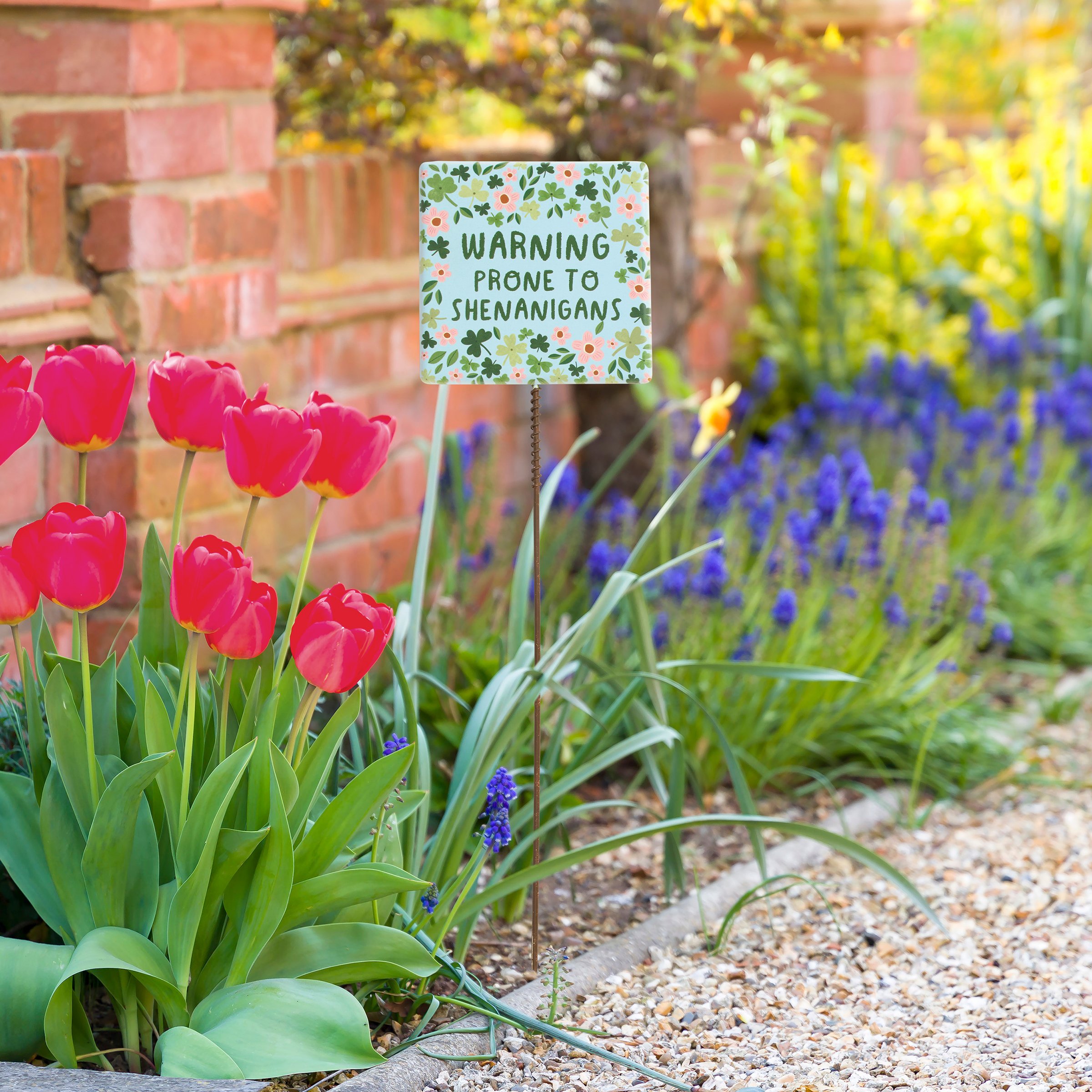 A decorative garden pick from our St. Patrick's Day Collection featuring a metal sign displaying a toss pattern of shamrocks and spring flowers surrounding a fun seasonal sentiment that reads "Warning: Prone To Shenanigans." St. Patrick's Day inspired art is replicated from original hand illustrated artwork. Our Prone To Shenanigans garden pick stands over 15 inches tall to easily stand out in a garden or decorative vessel. A fun St. Patrick's Day garden accent perfect for adding seasonal style to any garden or yard display.