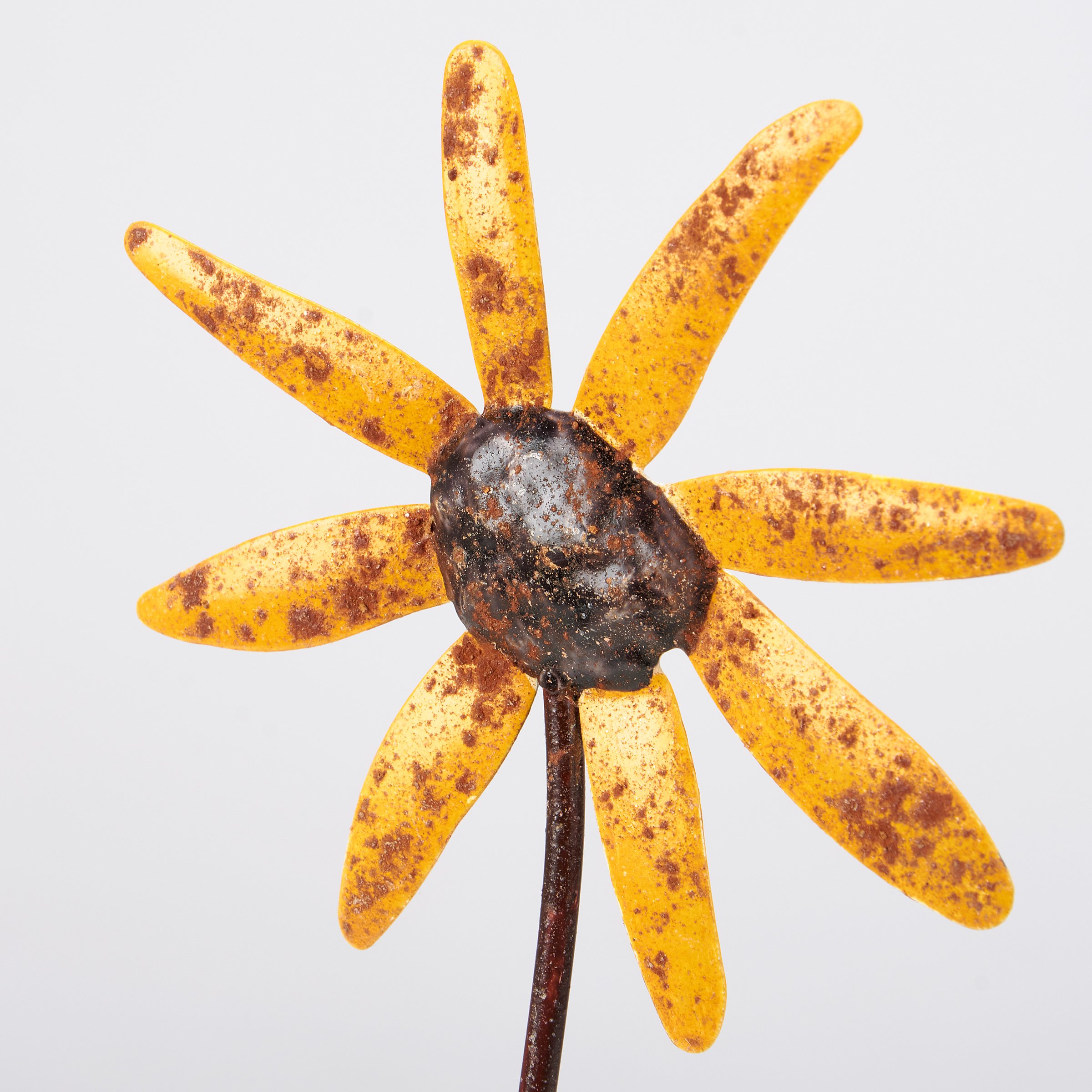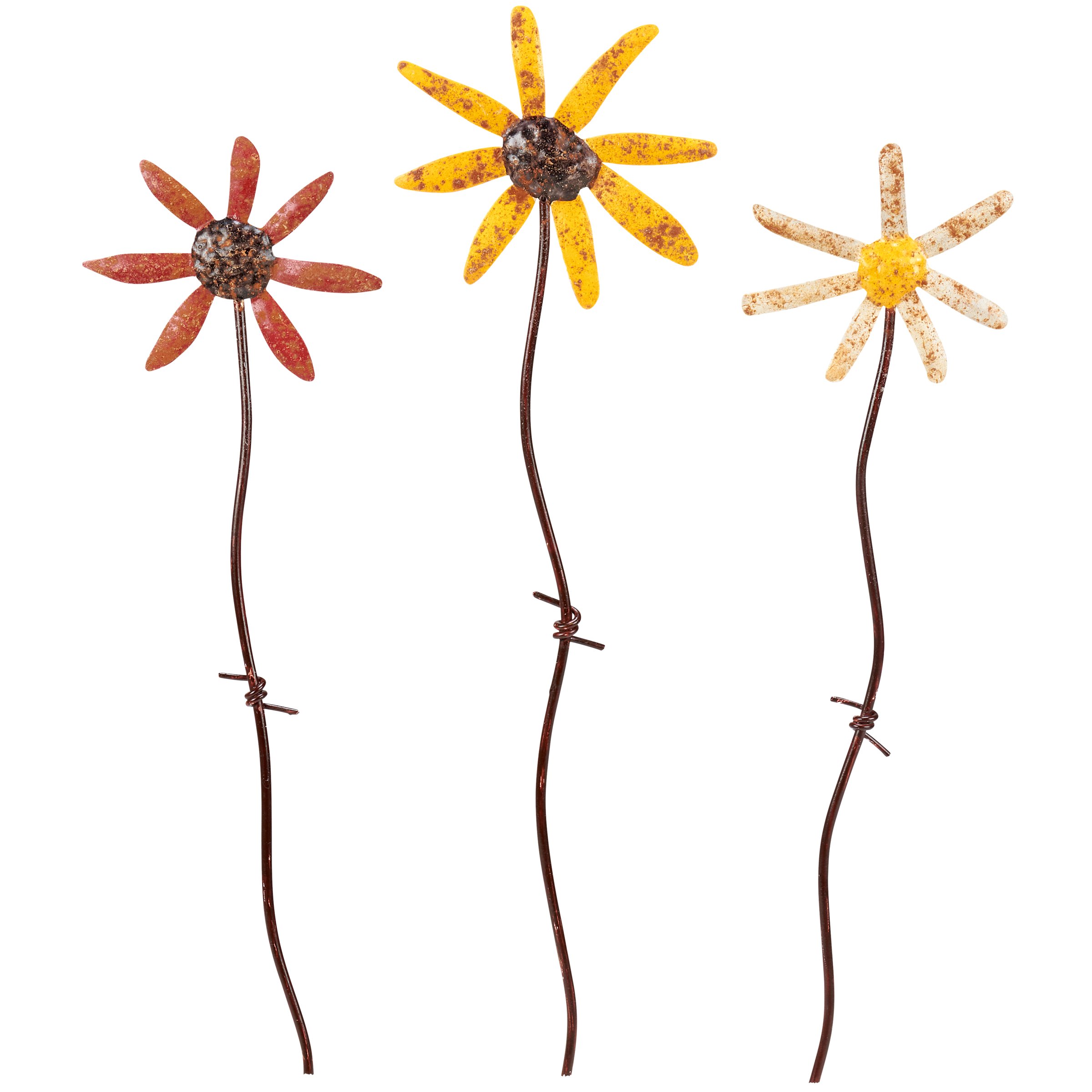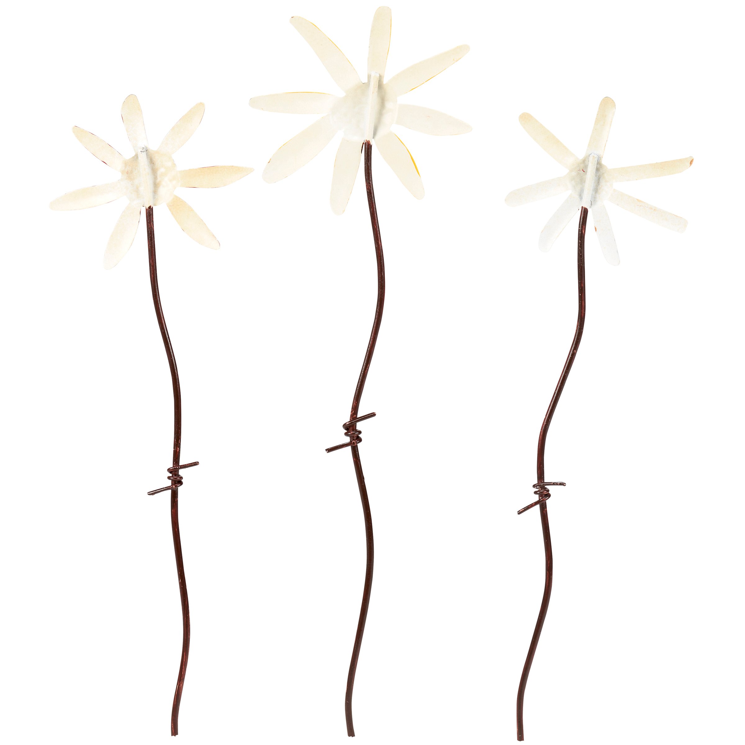 A set of three decorative picks from our Garden Collection displaying a rustic daisy designs made with sculpted metal pieces attached to a metal stakes. Picks feature distressed details for added texture. Our Daisies garden pick set includes a 16 inch stakes to easily stand out in a garden or decorative vessel. A set of primitive outdoor accents perfect for seasonal display.