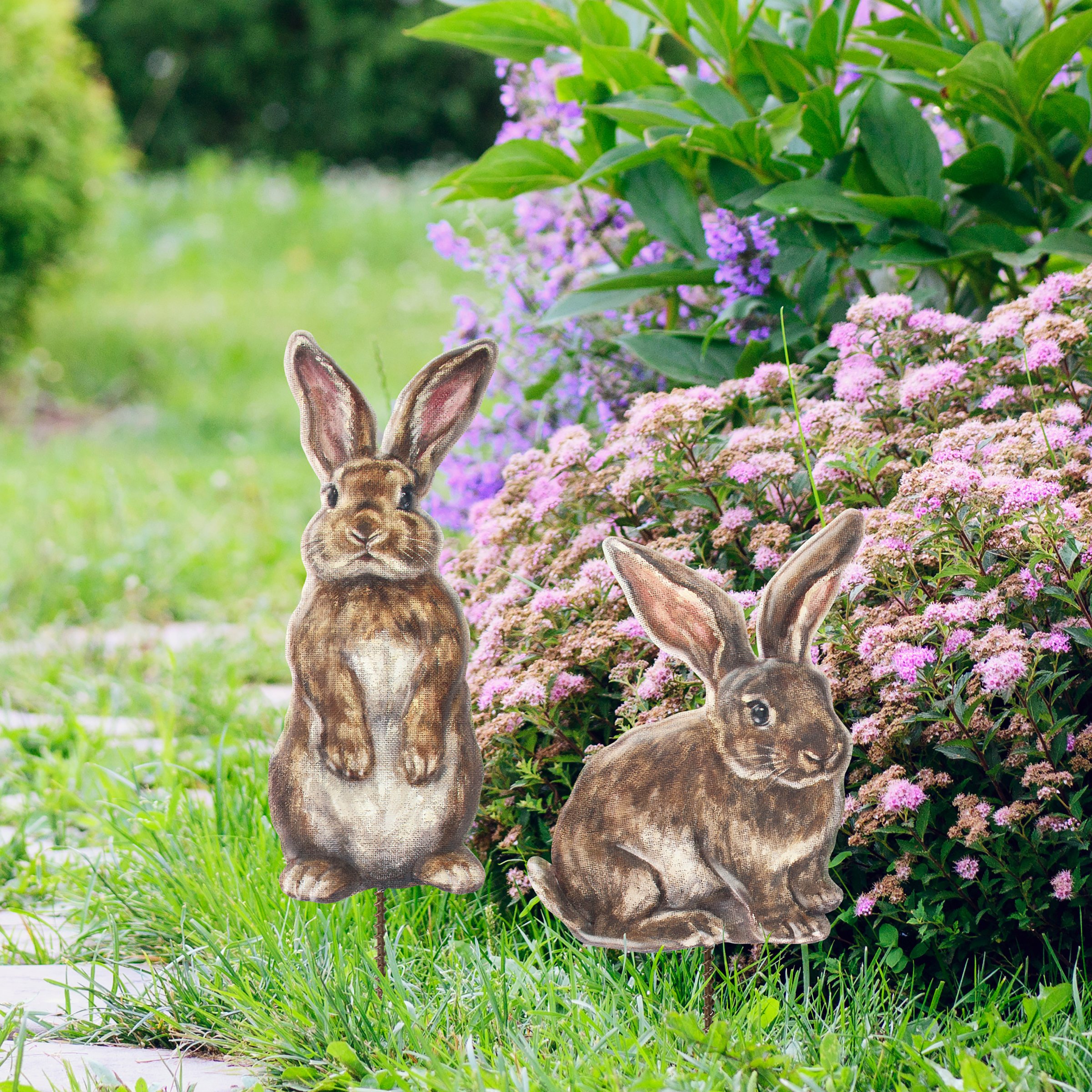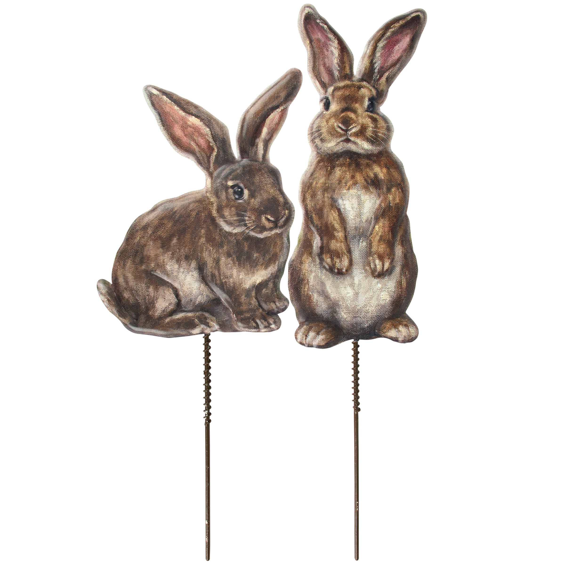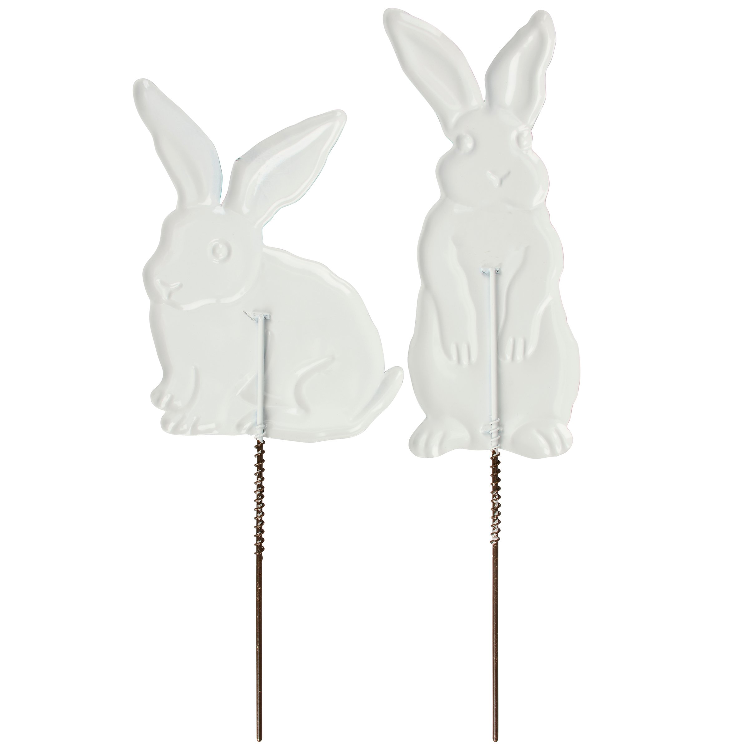 A decorative garden pick set from our Easter & Spring Collection featuring 2 metal display pieces cutout in the shape of individual bunny designs with embossed details for added dimension. Spring bunny designs are replicated from original artwork painted onto burlap canvas, giving the art a unique depth and texture. Our Garden Bunnies garden picks stand over 10 inches tall to easily stand out in a garden or decorative vessel. A cute bunny-themed garden accent perfect for adding character to any garden or yard display.
