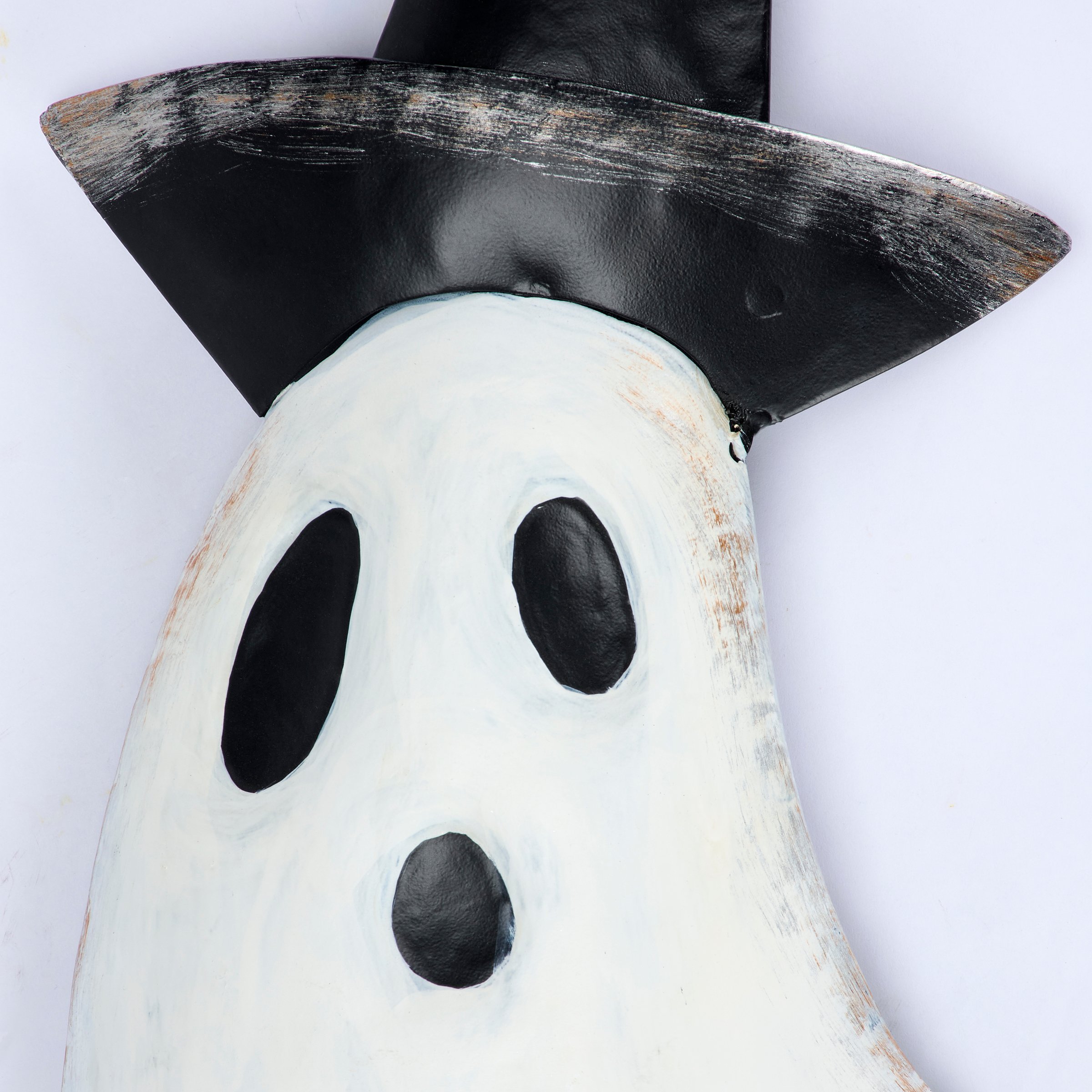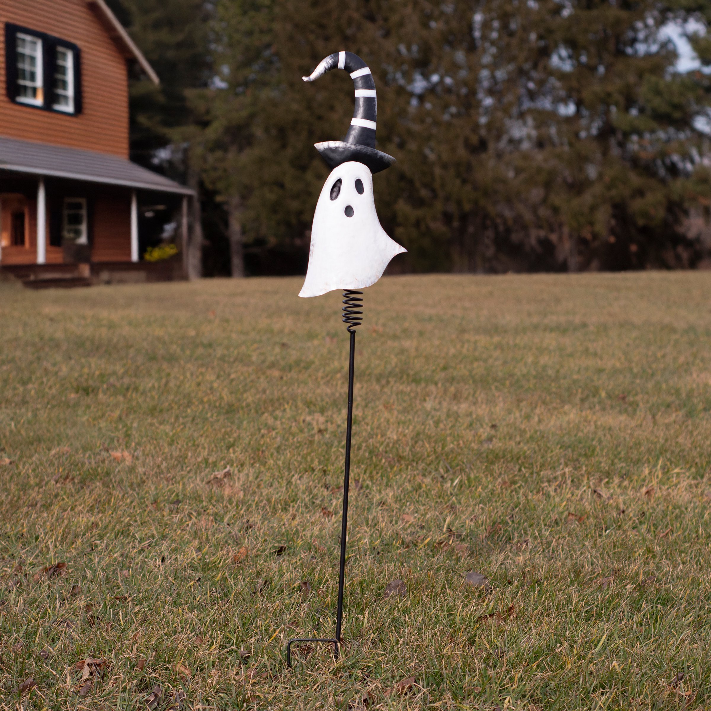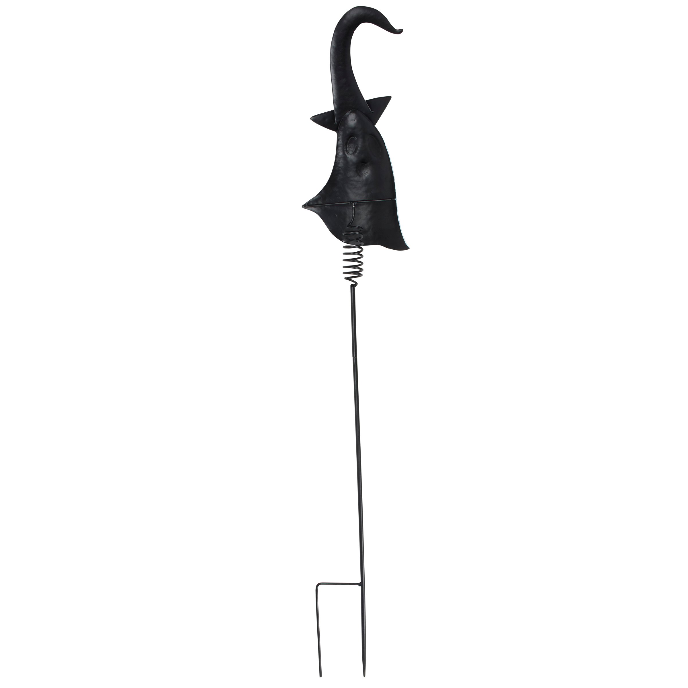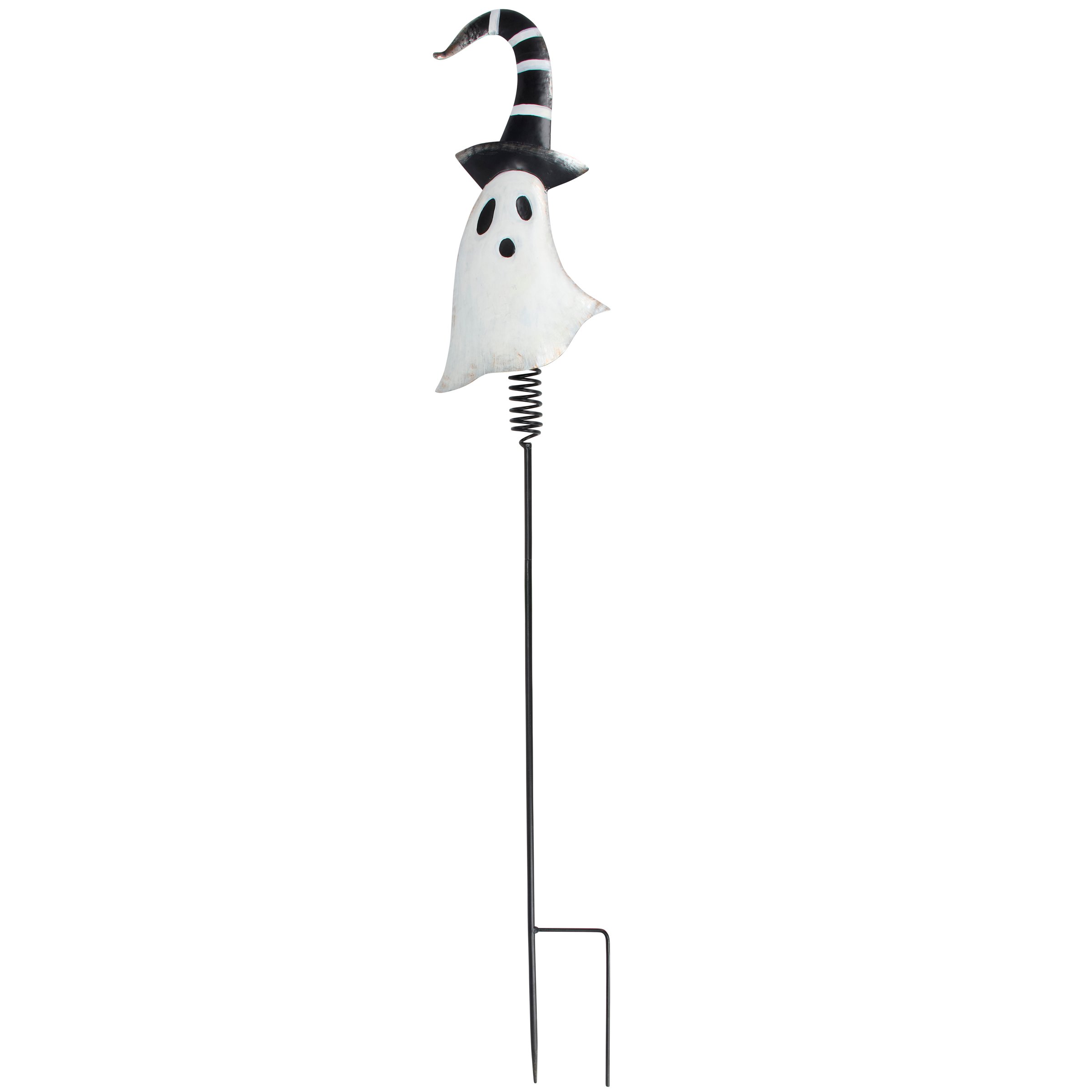 A decorative metal pick from our Halloween Collection featuring a metal cutout piece in the shape of the displayed art of a ghost wearing a whimsical hat. Whimsical ghost design also features dimensional details and is attached to a black metal stake with a sturdy spring at the top for added motion. Assembly required for display. Our Whimsical Ghost garden pick is over 50 inches tall to easily stand out in a garden or yard. A whimsical Halloween garden accent perfect for adding seasonal style to any outdoor display.