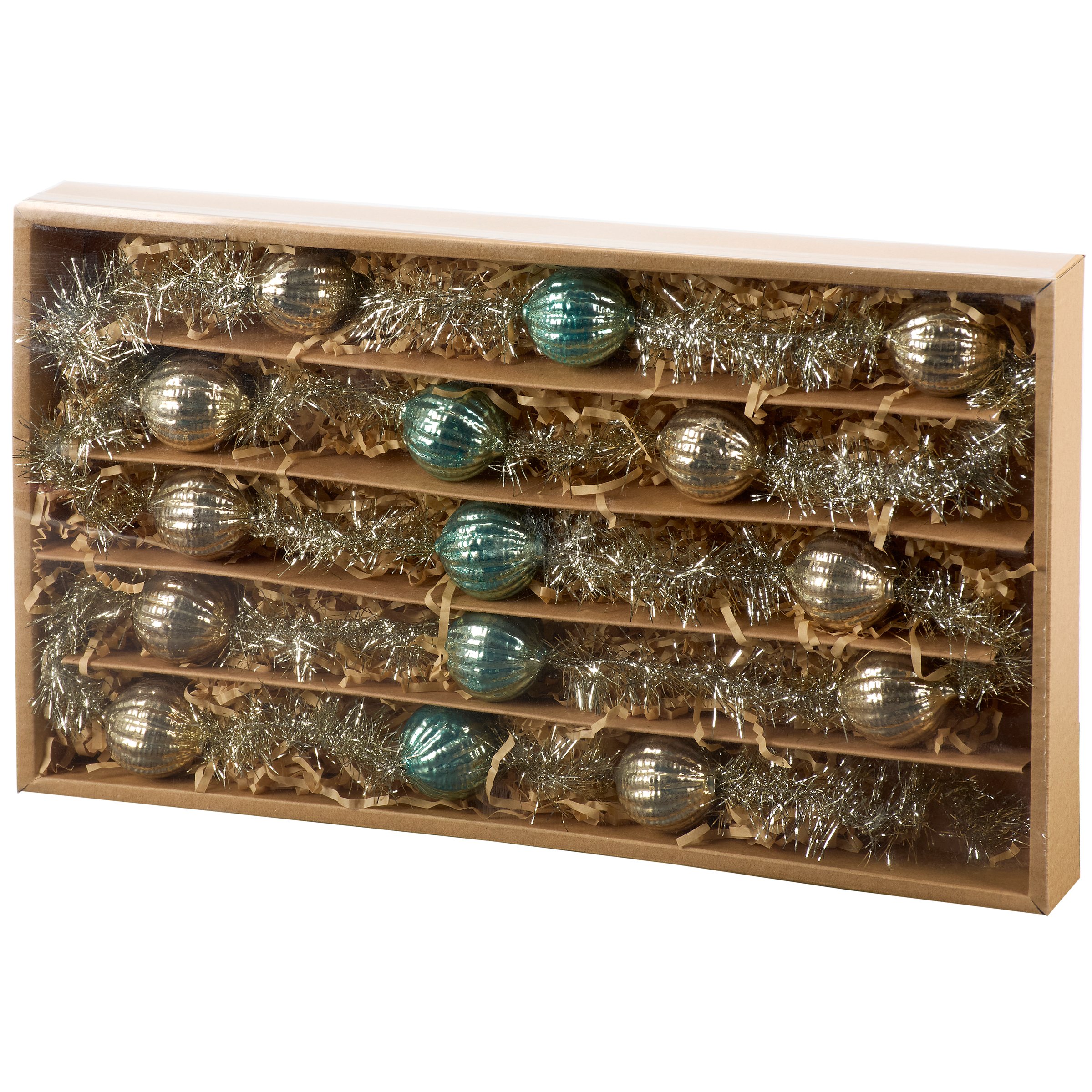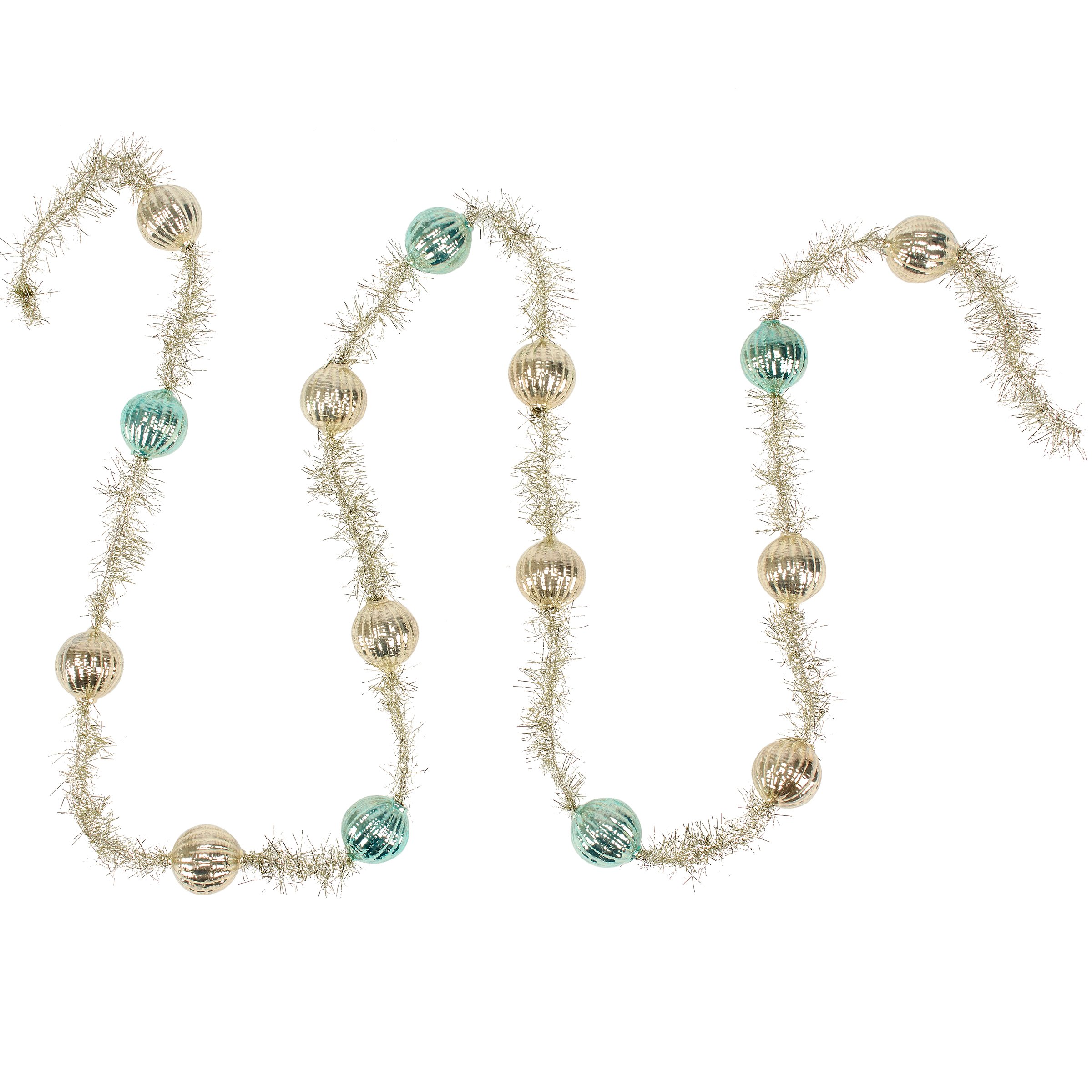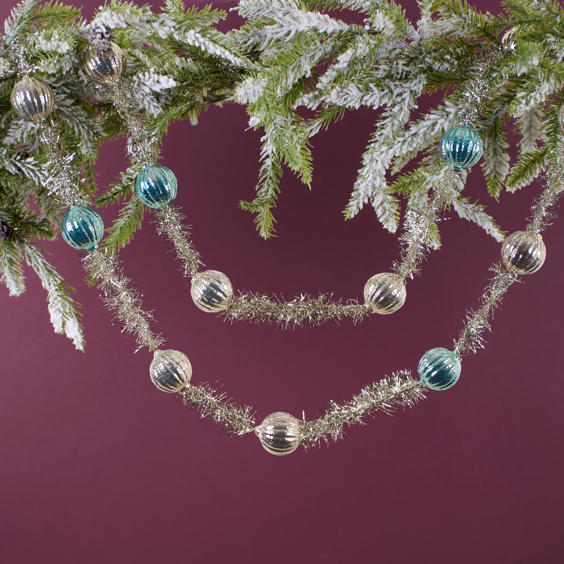 A decorative garland from our Christmas Collection displaying a retro pastel inspired design made with pastel blue and silver glass balls along silver tinsel. Our Pastel Balls garland includes 76 inches of length for plenty of coverage and is easy to hang for display via loop. This retro Christmas garland comes packaged neatly displayed in a cardboard box filled out with decorative paper stuffing and finished with an acrylic lid to easily view design. A retro pastel Christmas home accent with a variety of seasonal display options.
