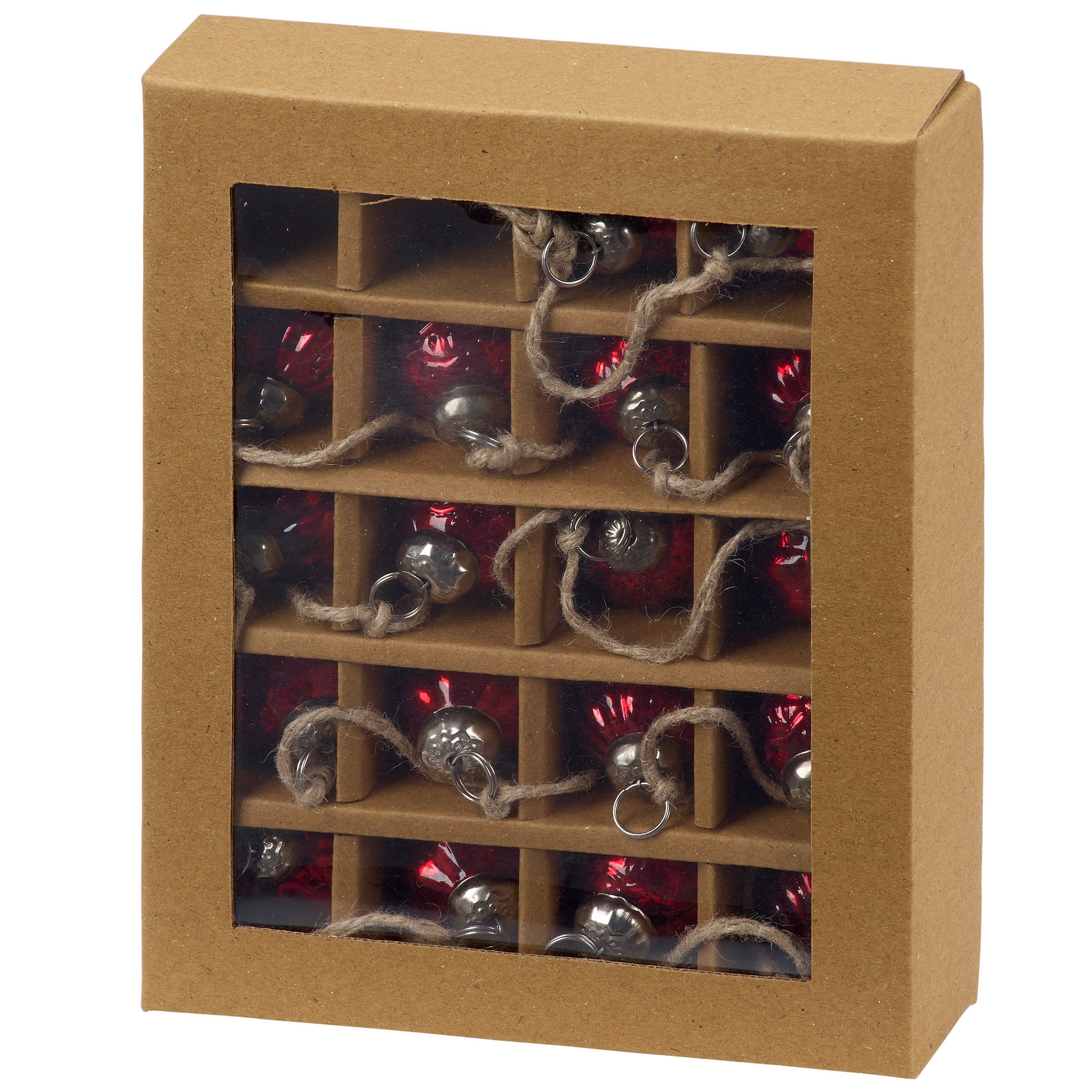 A decorative garland from our Christmas Collection displaying 18 miniature red baubles along a jute string. Our Red Baubles garland includes 70 inches of length for plenty of coverage and is easy to hang for display via loops at each end. This Christmas garland comes packaged neatly displayed in a cardboard box filled out with an acrylic window to easily view design. A classic Christmas home accent with a variety of seasonal display options.
