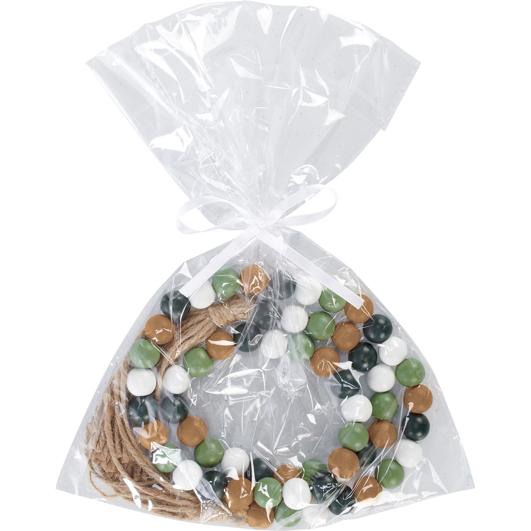 A decorative garland from our Christmas Collection displaying wood beads along a jute rope. Garland features a muted holiday color palette with metallic gold accents and a jute tassel at each end. Our Scandi Beads garland includes 36 inches of length and comes packaged in a poly bag finished with ribbon. A seasonal home accent with a variety of display options.