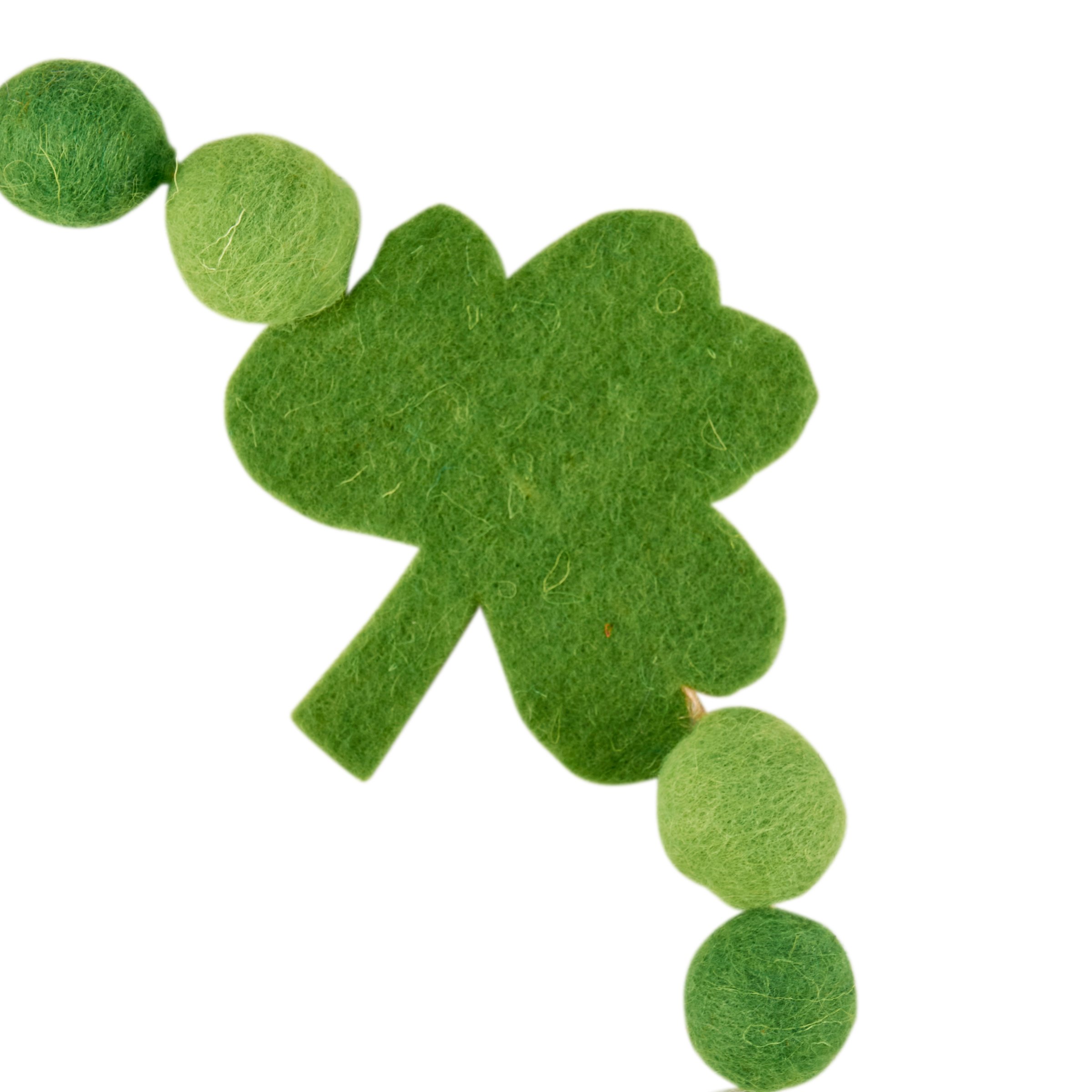 A decorative garland from our St. Patrick's Day Collection displaying felt shamrocks with white and green felt poms along a jute string. Garland features string loops at each end. Our Shamrock garland includes 67 inches of length for plenty of coverage and is easy to hang via string loops. A seasonal home accent with a variety of display options.