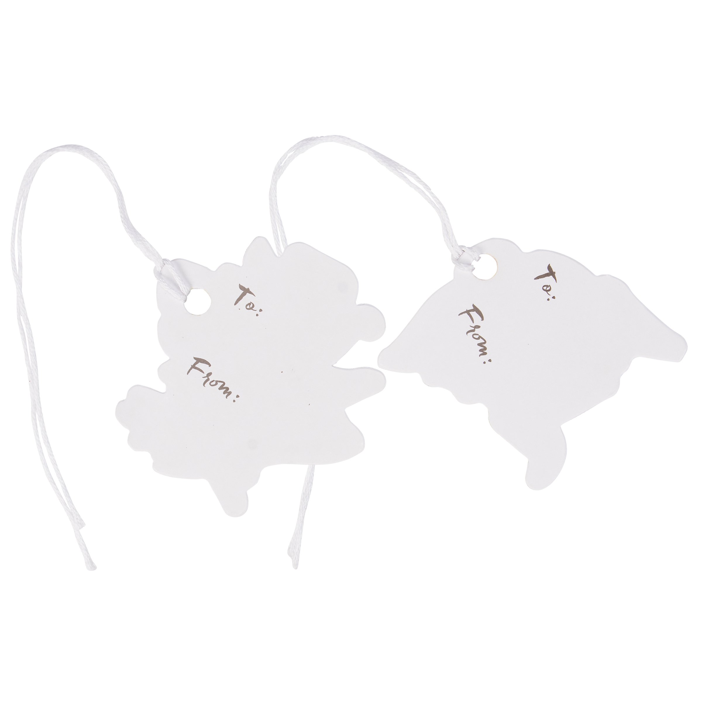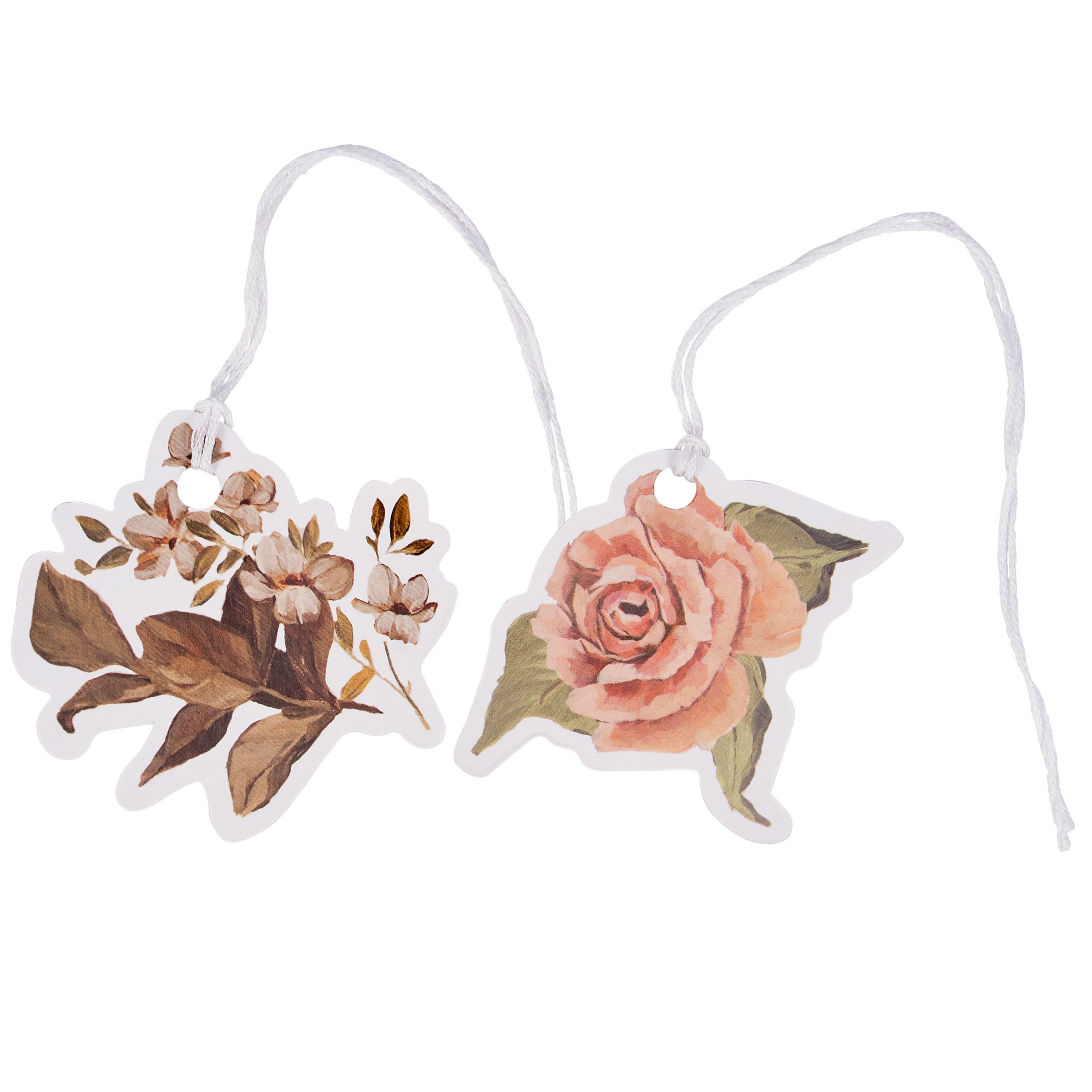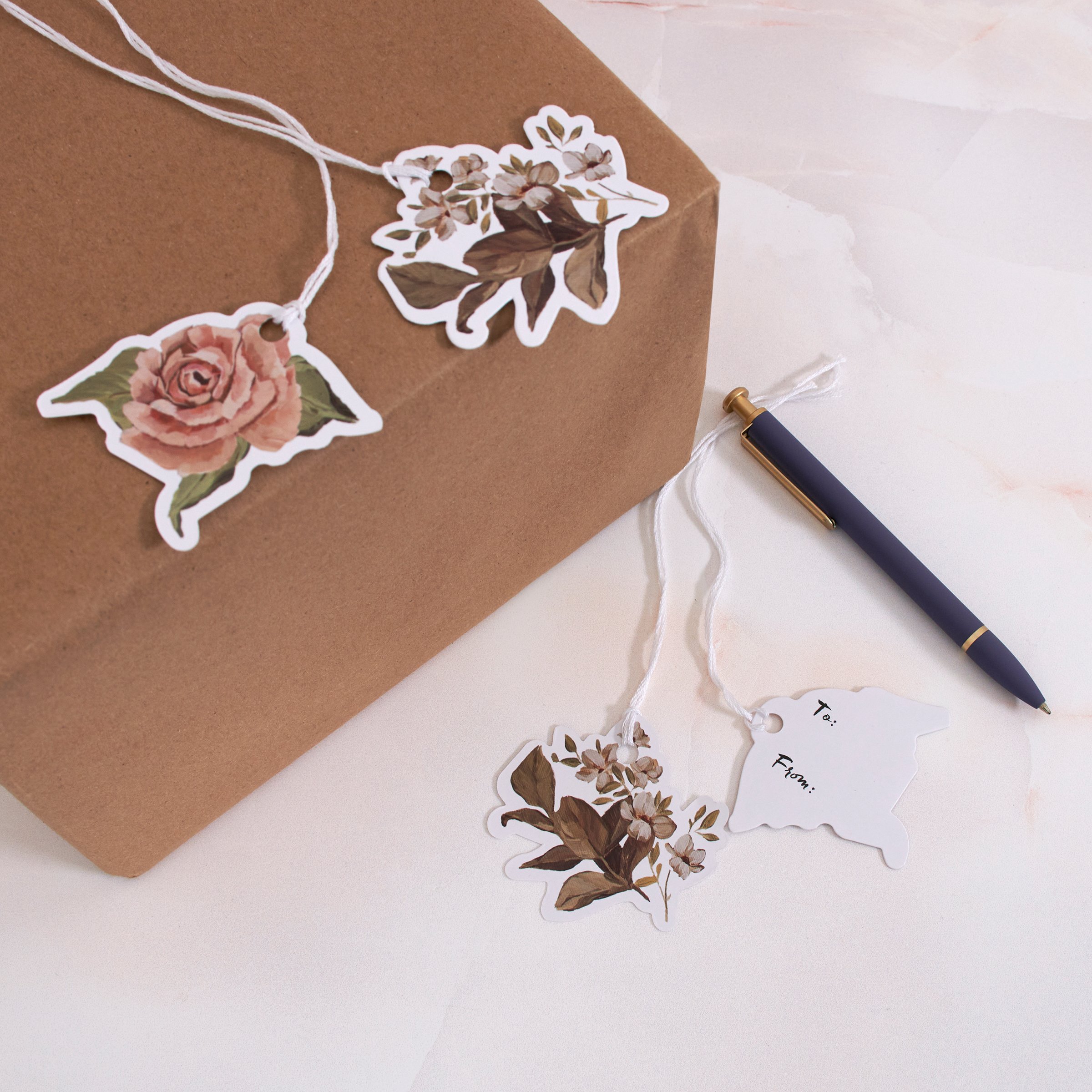 A set of paper gift tags from our Valentine's Day Collection displaying hand painted cabbage rose themed designs and space for a "To and From" message on the back. Set includes 16 tags with 8 of each design. Our Cabbage Rose gift tags each include an attached piece of white string to easily tie around gift. Gift tag set is packaged together in a poly bag with attached header card. A charming set of gift accessories perfect for seasonal moments.