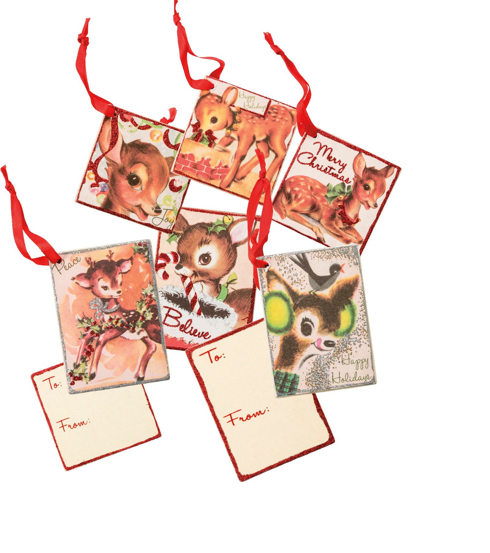 A set of six wooden gift tags featuring various vintage-inspired reindeer designs, festive sentiments, and glitter details. Contain top ribbon loops for attaching to gifts.