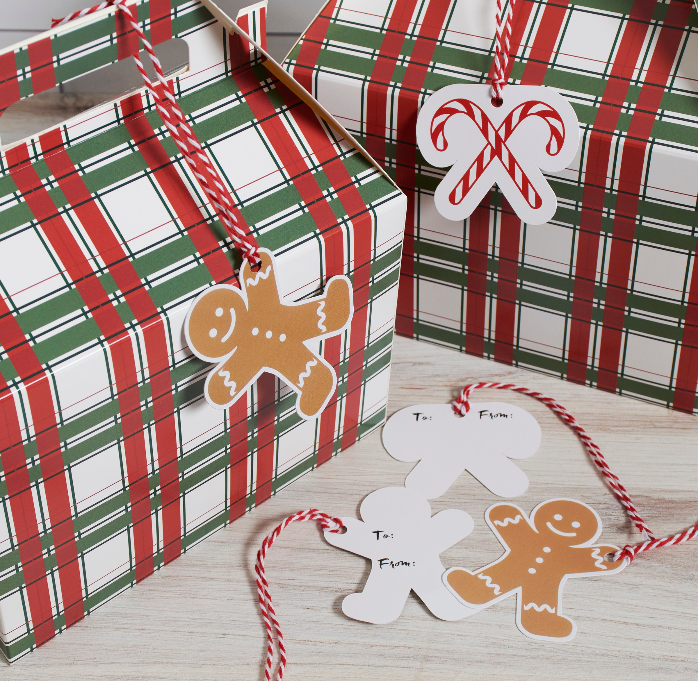 A set of paper gift tags from our Christmas Collection displaying fun holiday-themed designs and space for a "To and From" message on the back. Designs feature shaped cutouts of a gingerbread man as well as candy canes. Set includes 16 tags with 8 of each design. Seasonal gift tags each include an attached piece of red and white twine to easily tie around gift. Our Gingerbread Man gift tags are packaged together in a poly bag with attached header card. A charming set of gift accessories perfect for seasonal gifting.