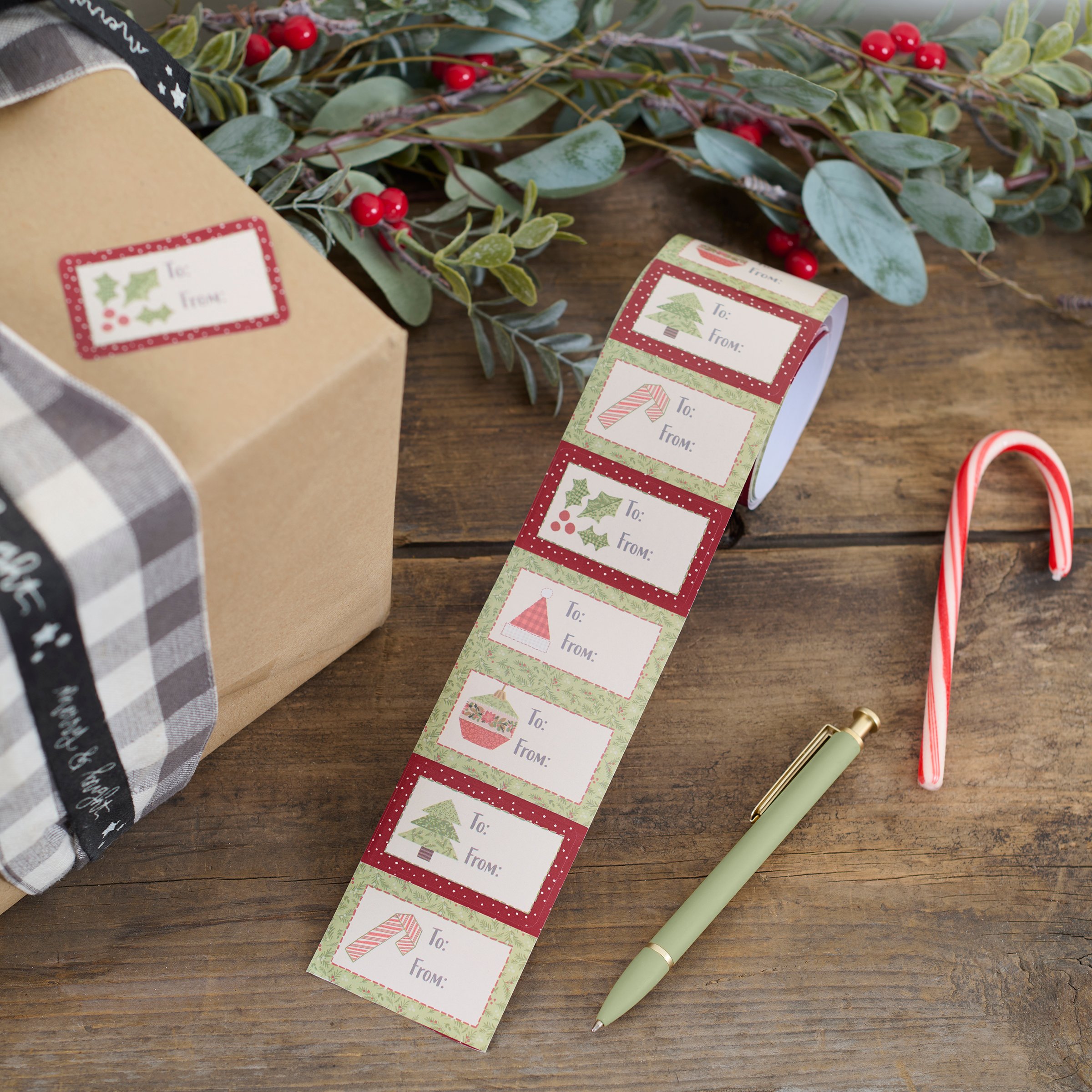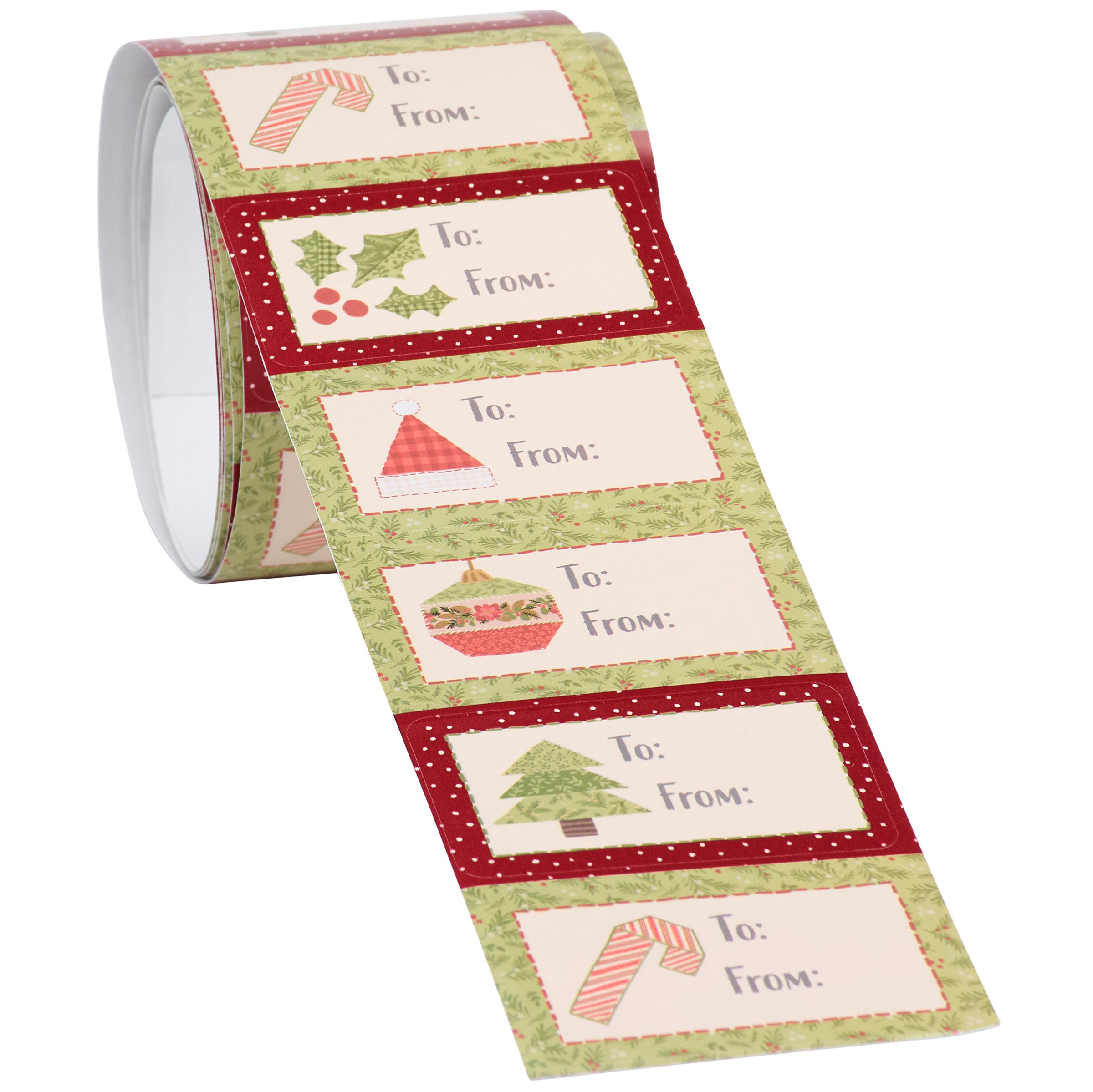 A set of seasonal gift tags from our Craft Christmas Collection displaying craft inspired Christmas quilt designs replicated from original art hand painted in a unique watercolor style. This Christmas gift tag set includes 50 stickers with 10 of each design and space to write a "To and From" message all on a convenient paper roll that is packaged in a box displaying all designs for easy store display. Our Christmas Quilts gift tags are a craft inspired Christmas gift accessory perfect for seasonal gifting.