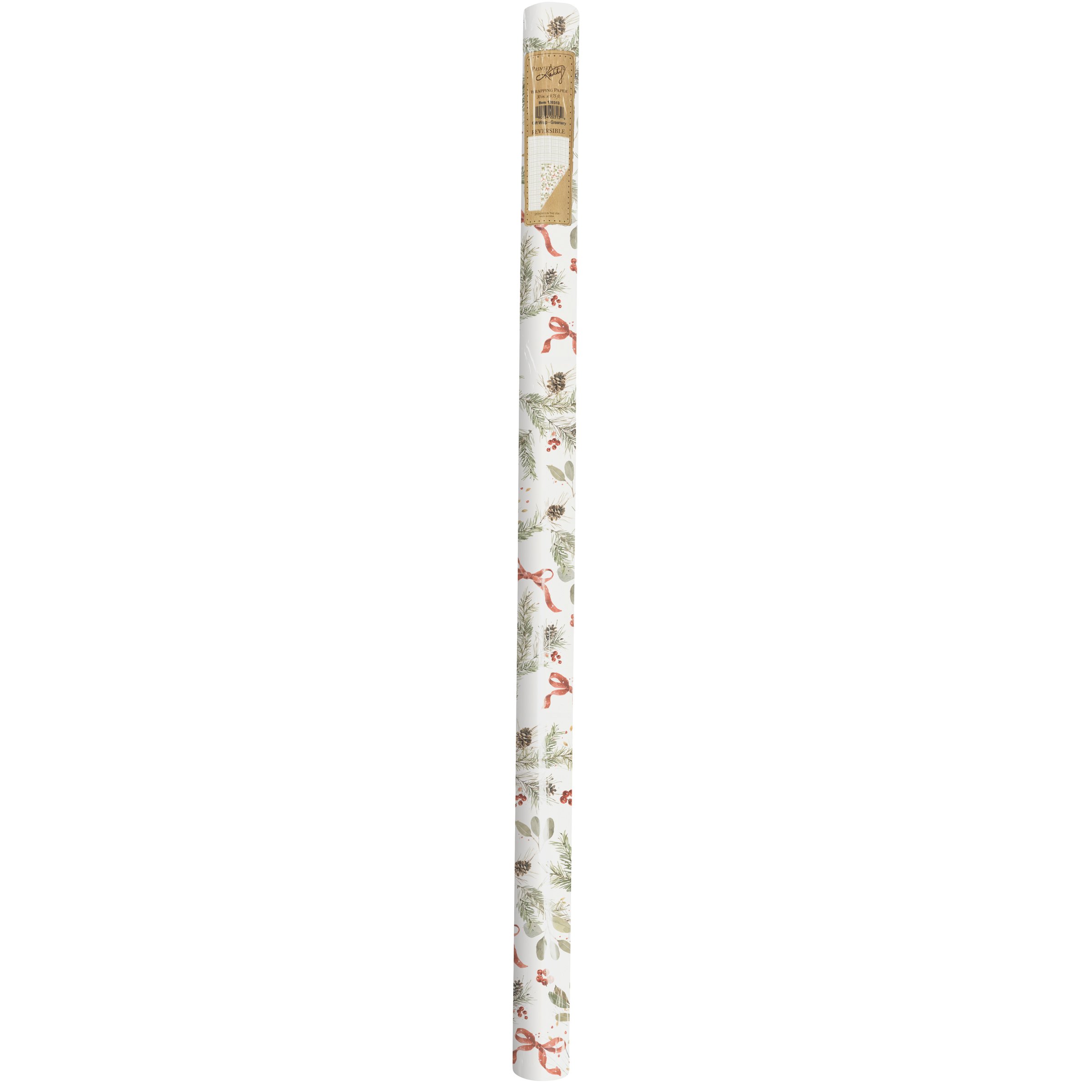 A double-sided roll of gift wrap from our Christmas Collection displaying a pattern of winter greenery and red bows on one side and a gray gingham pattern on the other side for multiple gifting options. Seasonal gift wrap designs are replicated from original art hand painted in a delicate watercolor style. Our Greenery gift wrap includes 9.75 feet of seasonal wrapping paper on a 30 inch cardboard roll and shrink wrapped with a sticker label displaying the reversible designs for easy store display. A lovely Christmas gift accessory perfect for seasonal gifting.