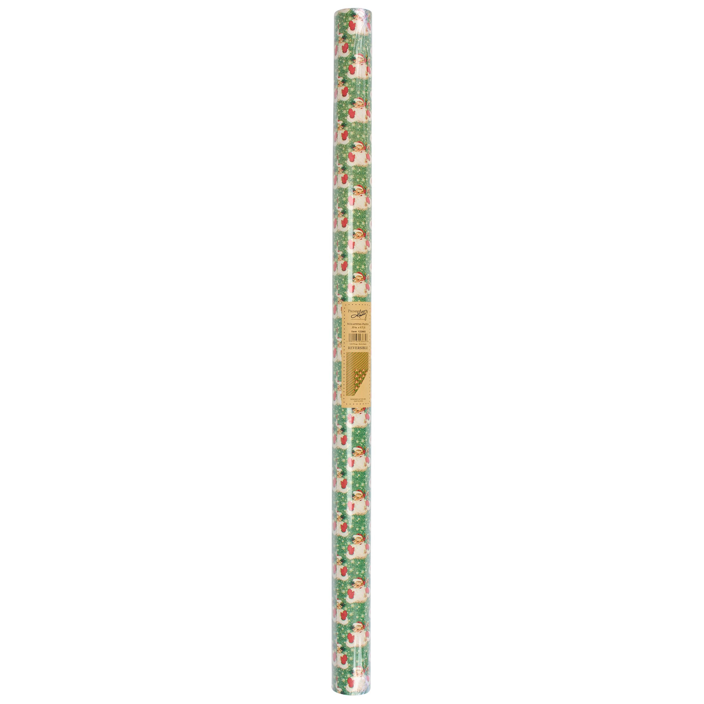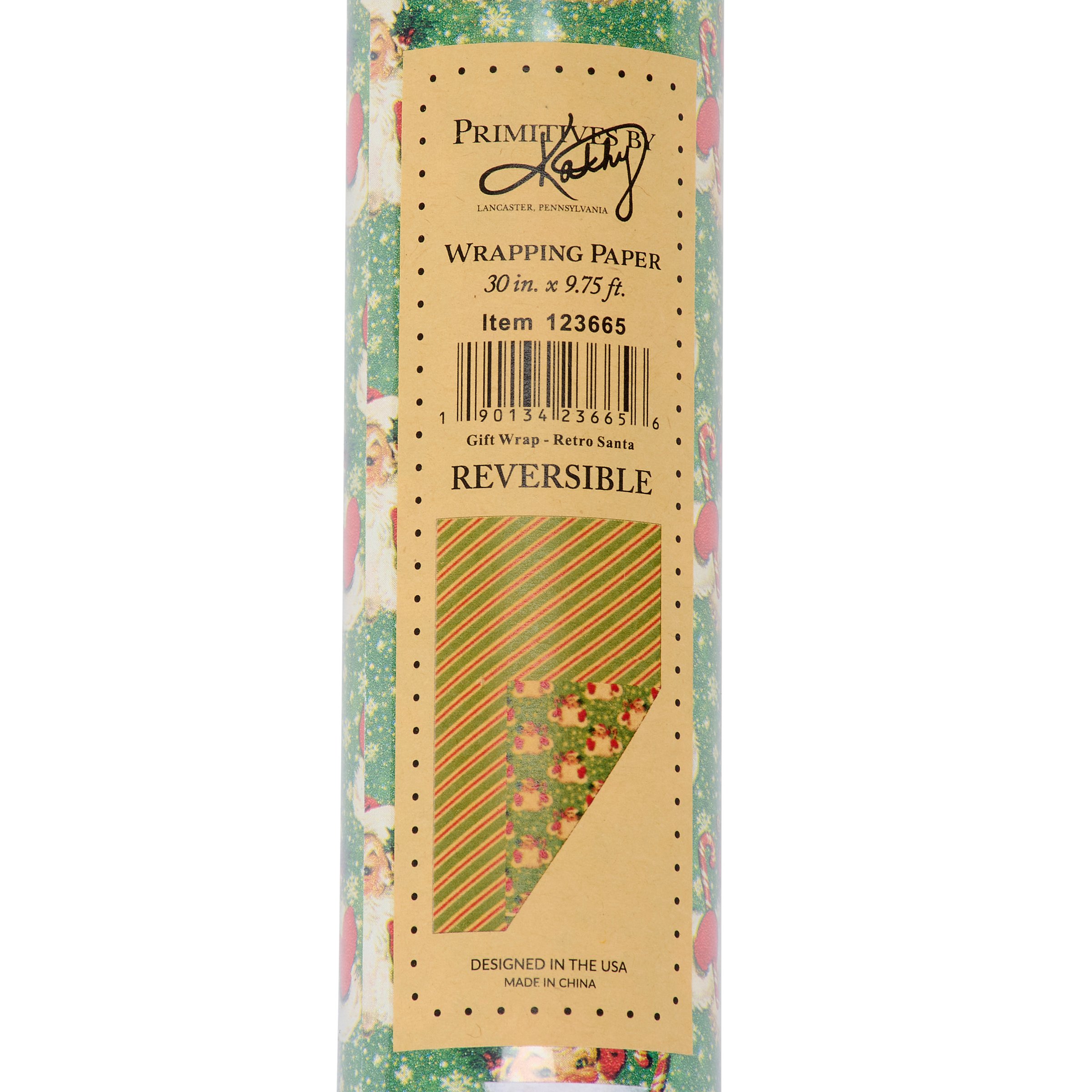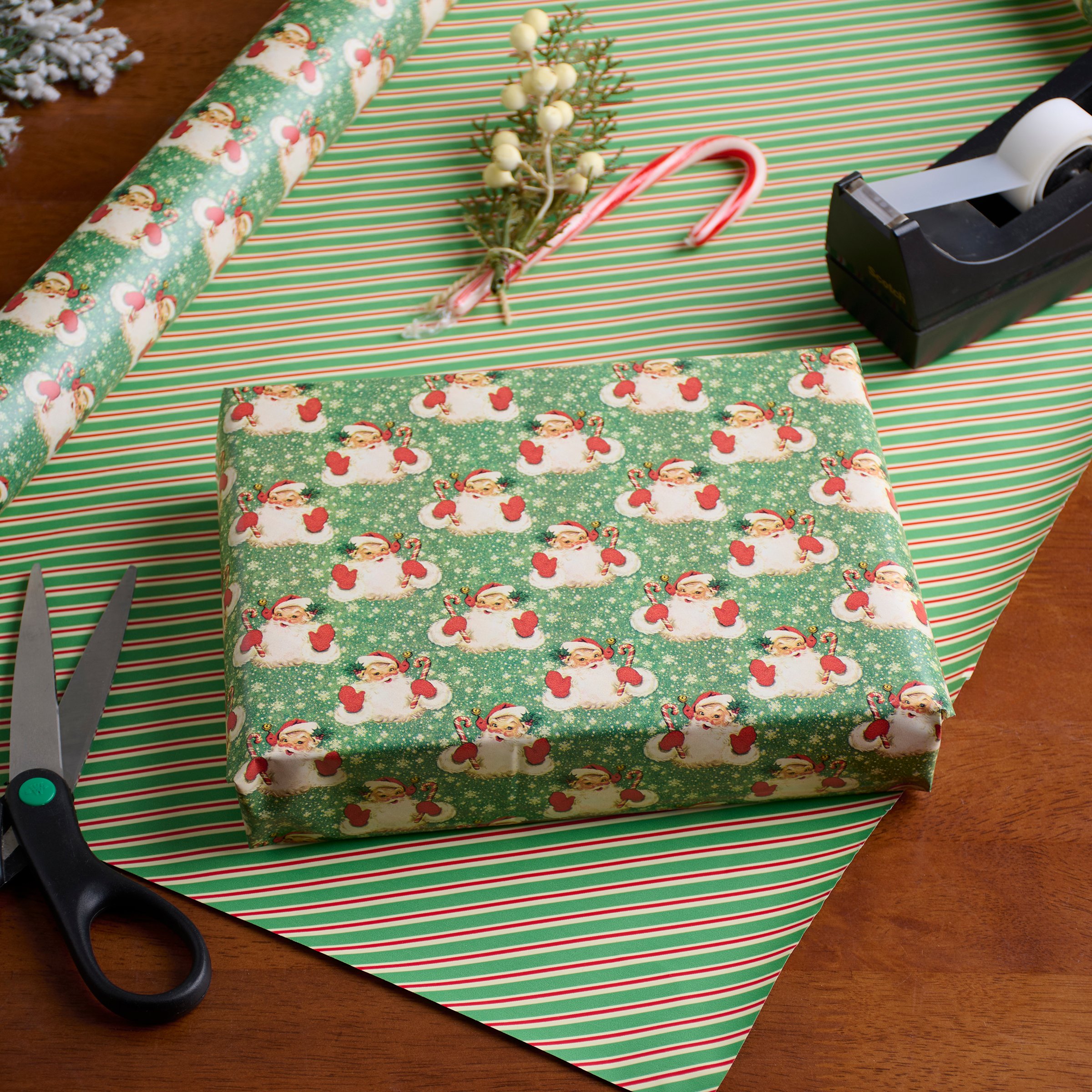 A double-sided roll of gift wrap from our Christmas Collection displaying a retro inspired pattern of Santa holding a candy cane on one side as well as green and red stripes on the other side for multiple gifting options. Our Retro Santa gift wrap includes 9.75 feet of seasonal wrapping paper on a 30 inch cardboard roll and shrink wrapped with a sticker label displaying the reversible designs for easy store display. A retro Christmas gift accessory perfect for seasonal gifting.