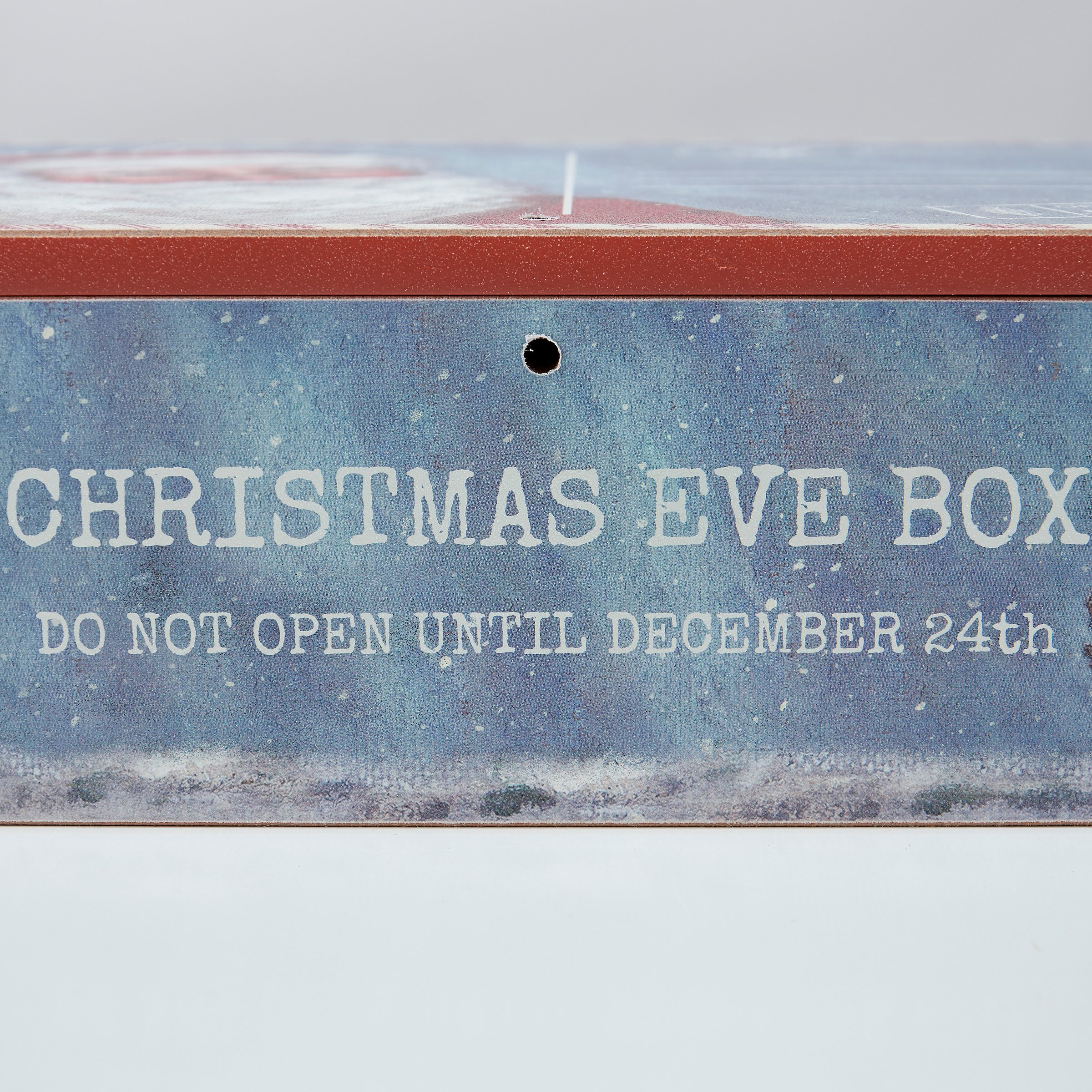 A hinged box from our Christmas Collection displaying a fun holiday giving box design replicated from original artwork painted onto burlap canvas, giving the art a unique depth and texture. Holiday giving box features the appearance of a special delivery from Santa with a sentiment that is perfect for storing a Christmas Eve gift and building excitement leading up to Christmas. Sentiment reads "Christmas Eve Box - Do Not Open Until December 24th." Our Christmas Eve Giving Box is made of natural wood for added interest and includes cotton tape ribbon to tie lid closed. A rustic keepsake great for seasonal gifting.