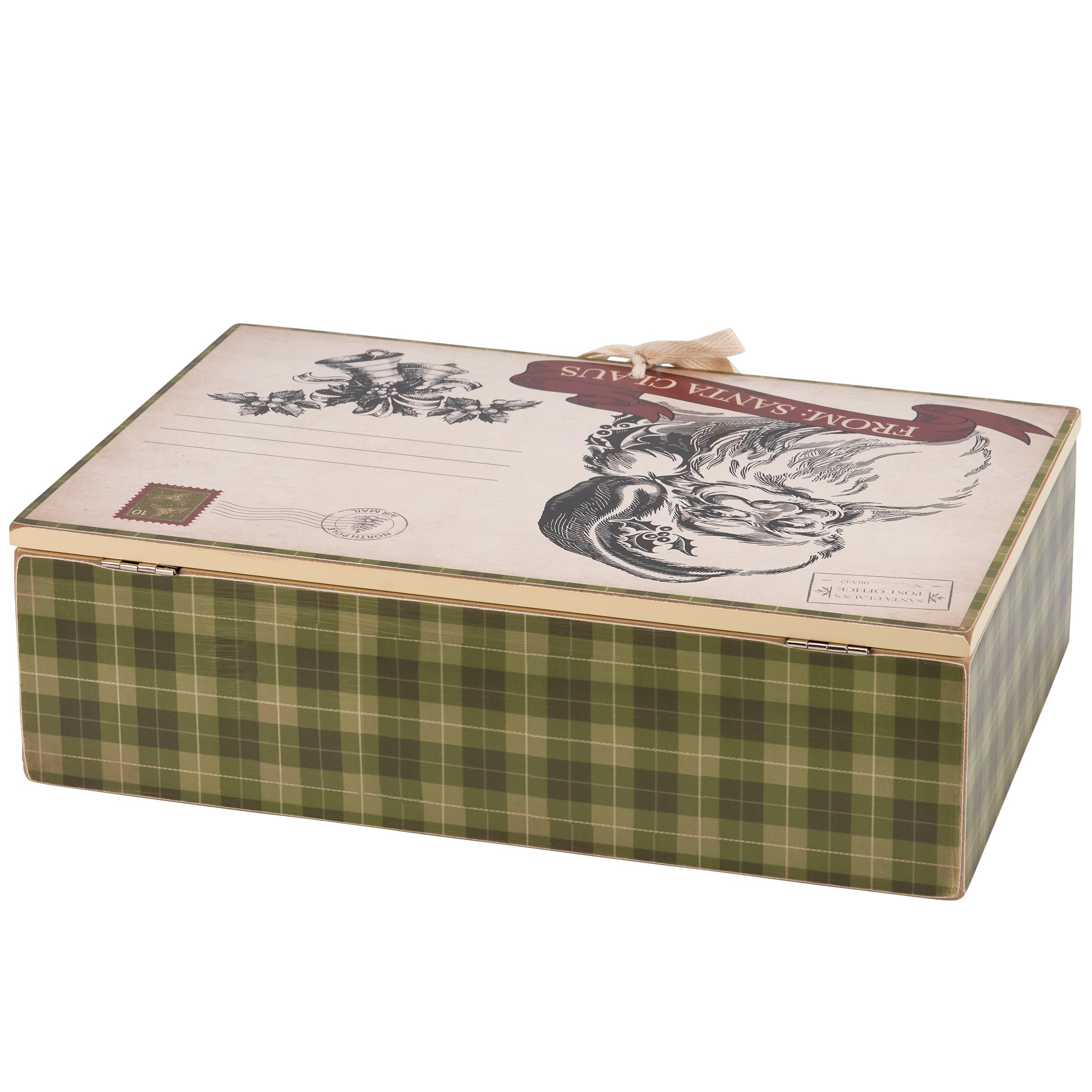 A hinged box from our Christmas Collection displaying a fun holiday giving box design in a vintage art style. Holiday giving box features the appearance of a special delivery from Santa with a sentiment that is perfect for storing a Christmas Eve gift and building excitement leading up to Christmas. Sentiment reads "Christmas Eve Box - Do Not Open Until December 24th." Our From Santa Claus giving box is made of natural wood for added interest and includes cotton tape ribbon to tie lid closed. A fun keepsake great for seasonal gifting.
